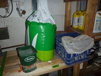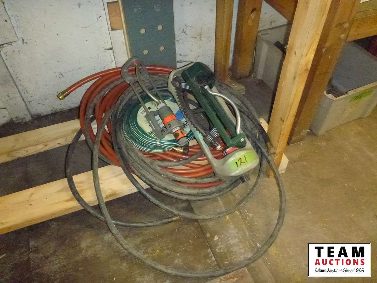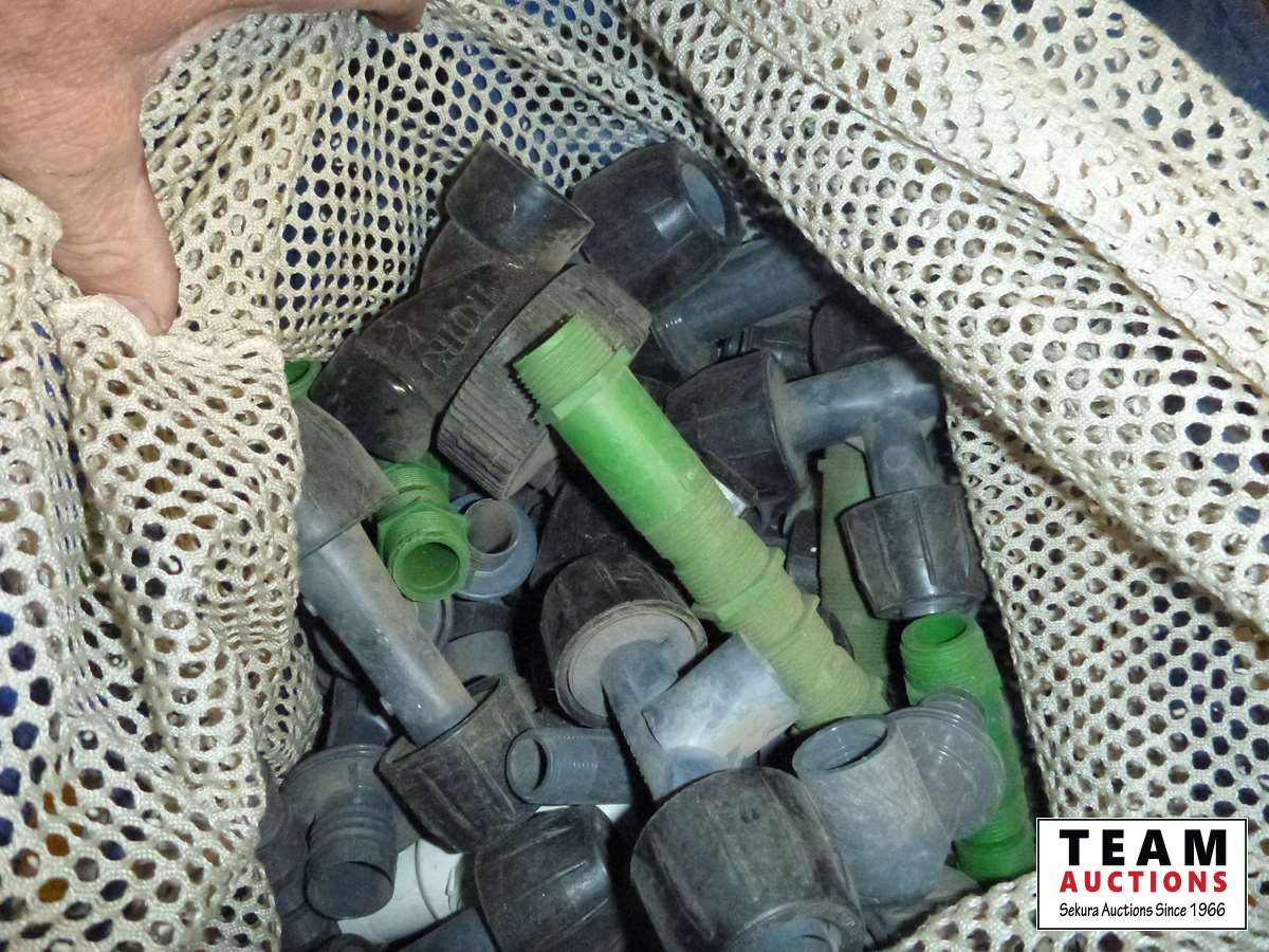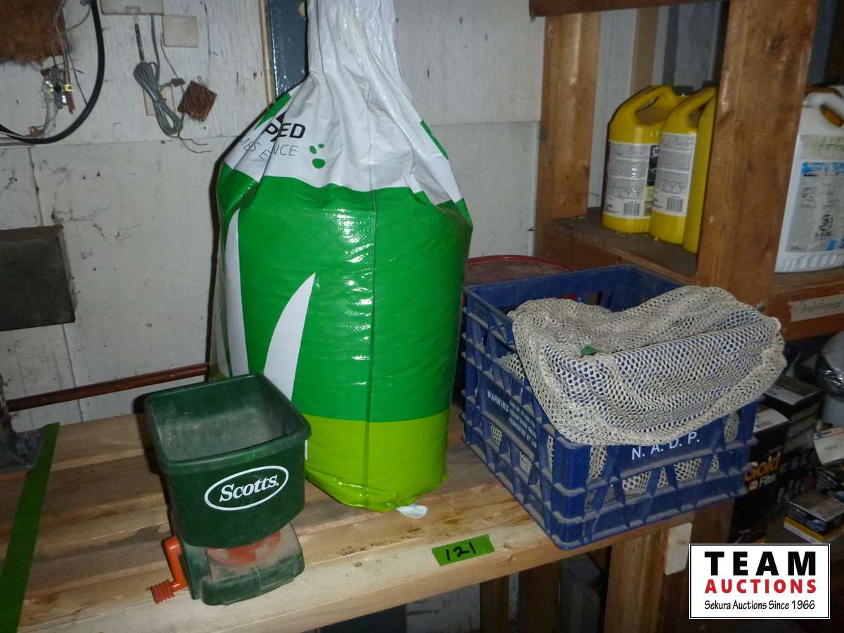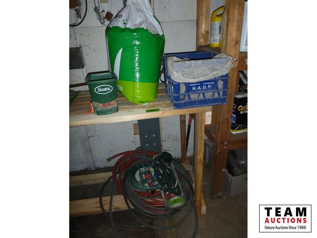Crate of irrigation parts, grass seed, sprinklers, garden hose, hand seeder