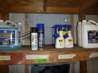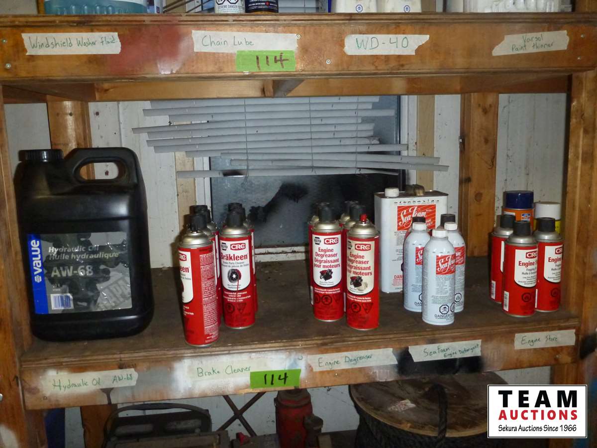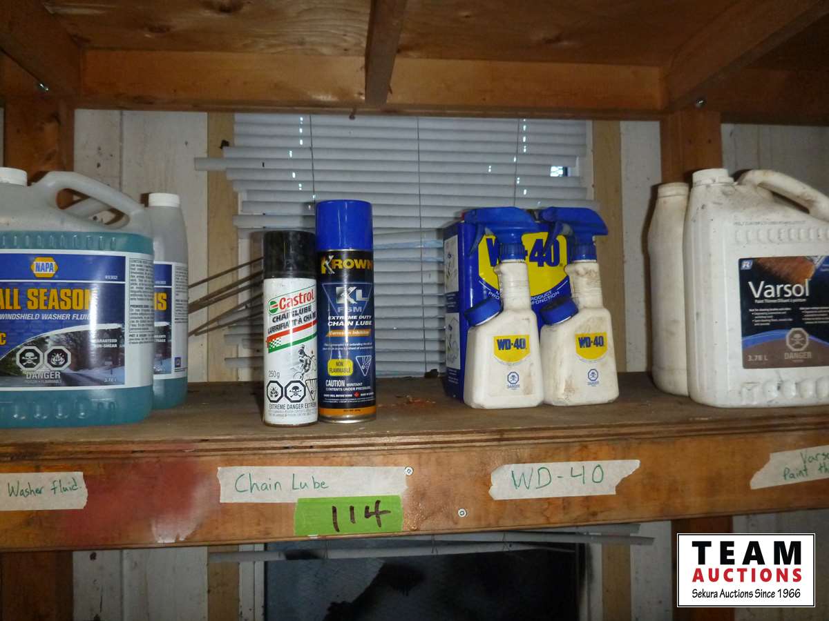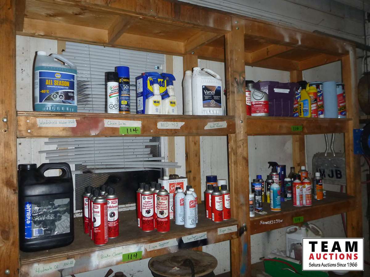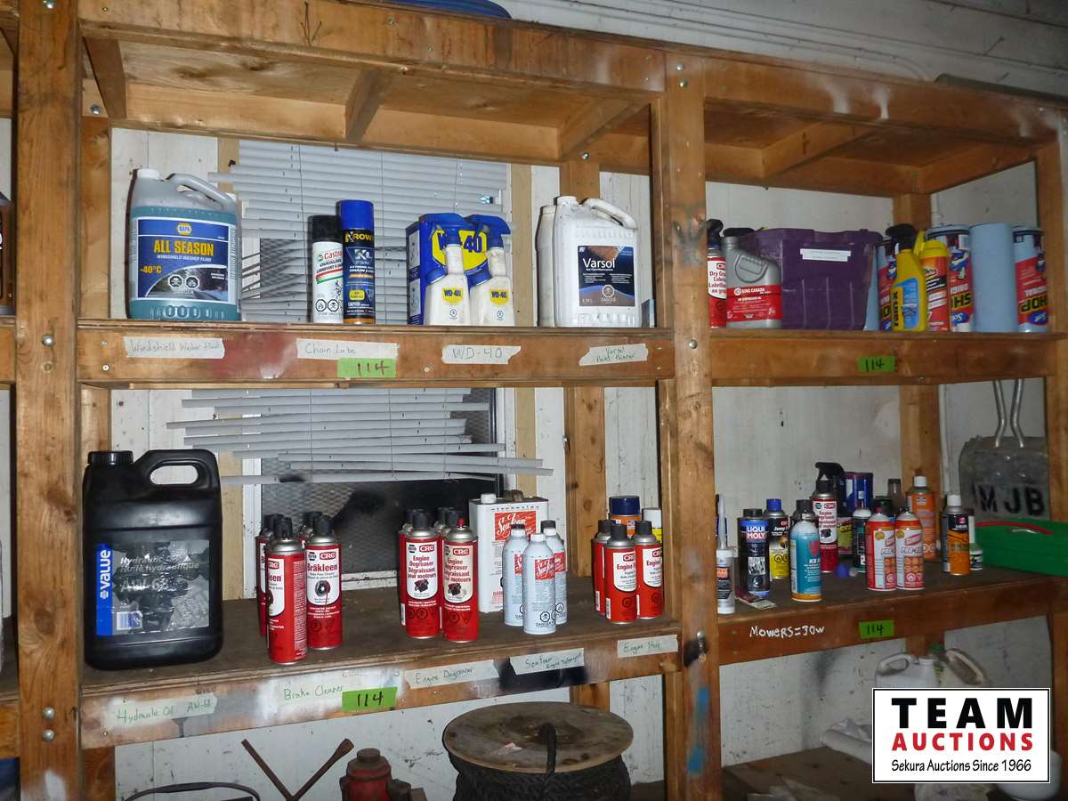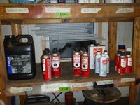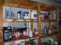 Windshield washer, chain lube, Varsol, hydraulic oil, dry lube, glass cleaner and more all on 4 shelves in shop