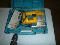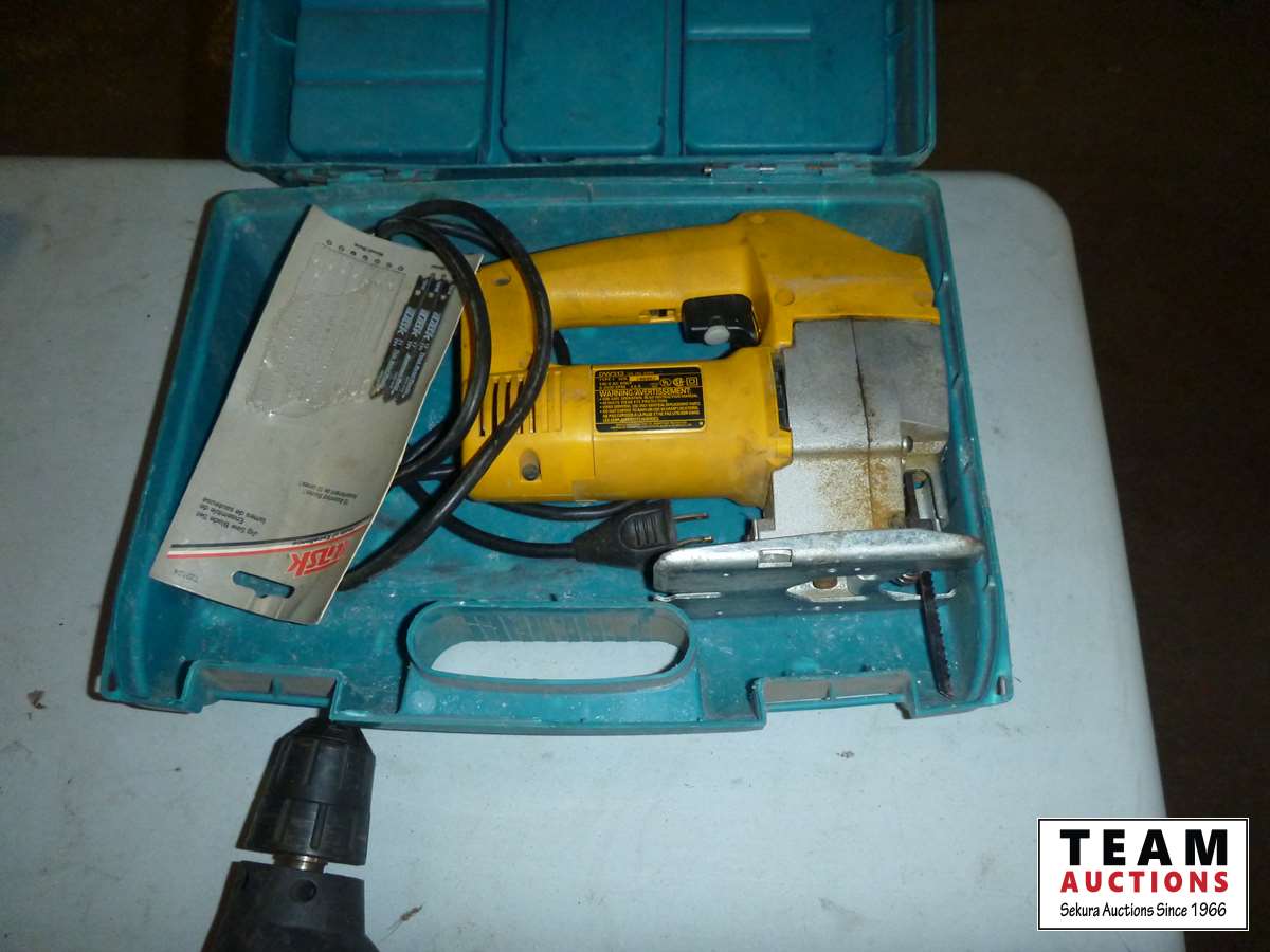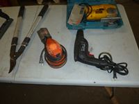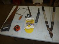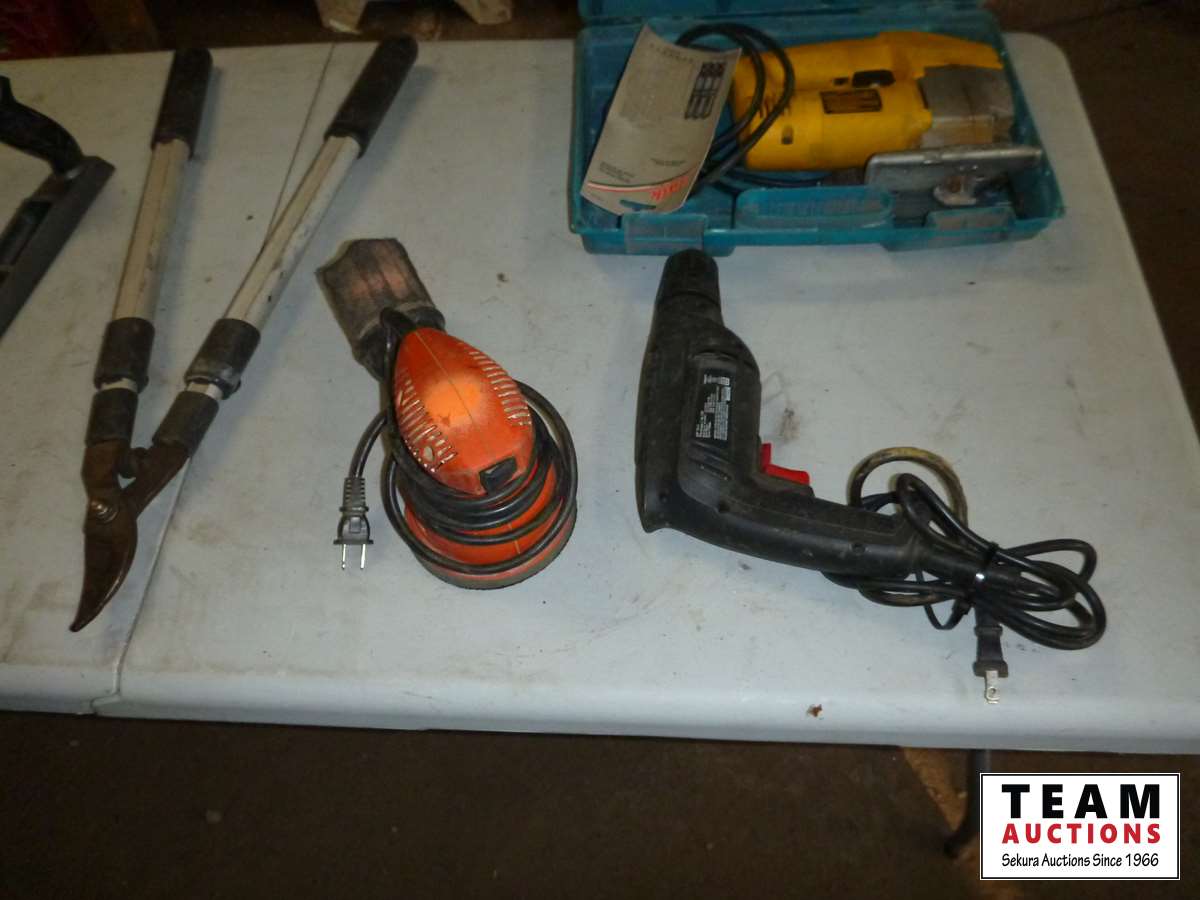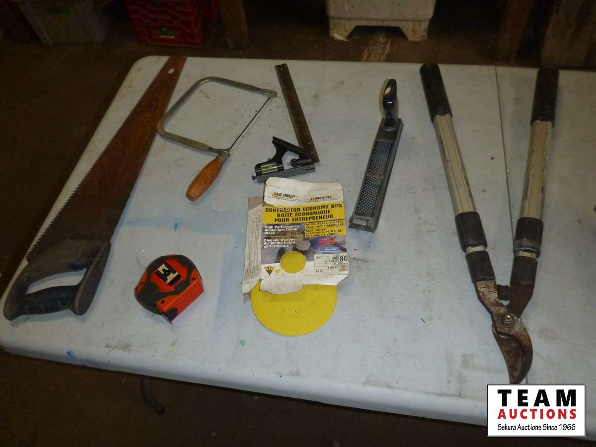 Coping saw, drywall rasp, square, tape measure, B&D palm sander, Jobmate drill, pruning lopper, DeWalt jigsaw