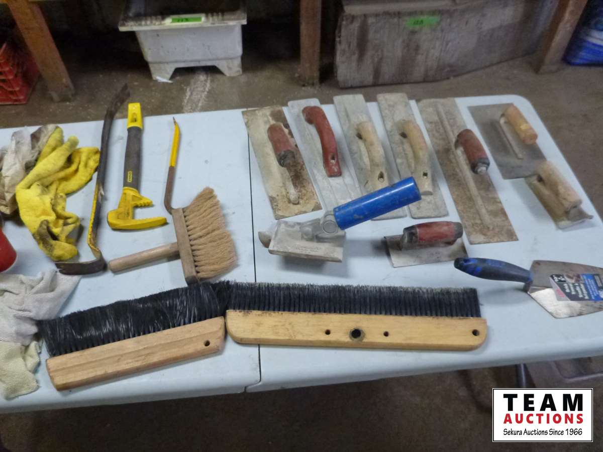 Brooms, bull float, hand trowels and edgers, Unicon sprayer, Shop Built square