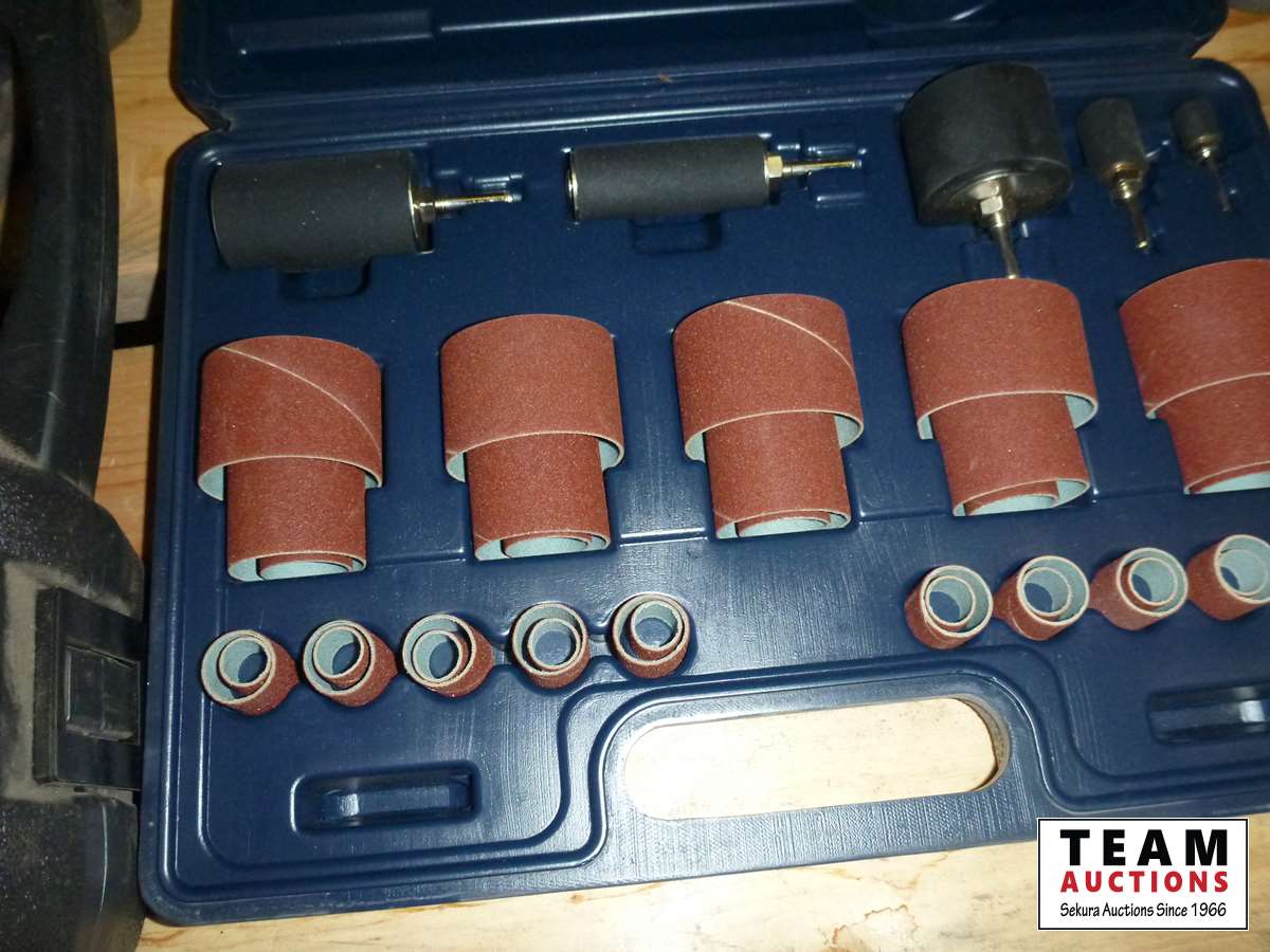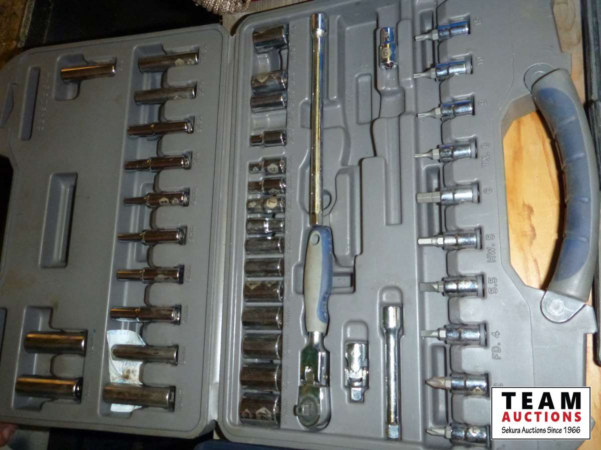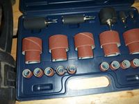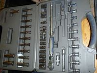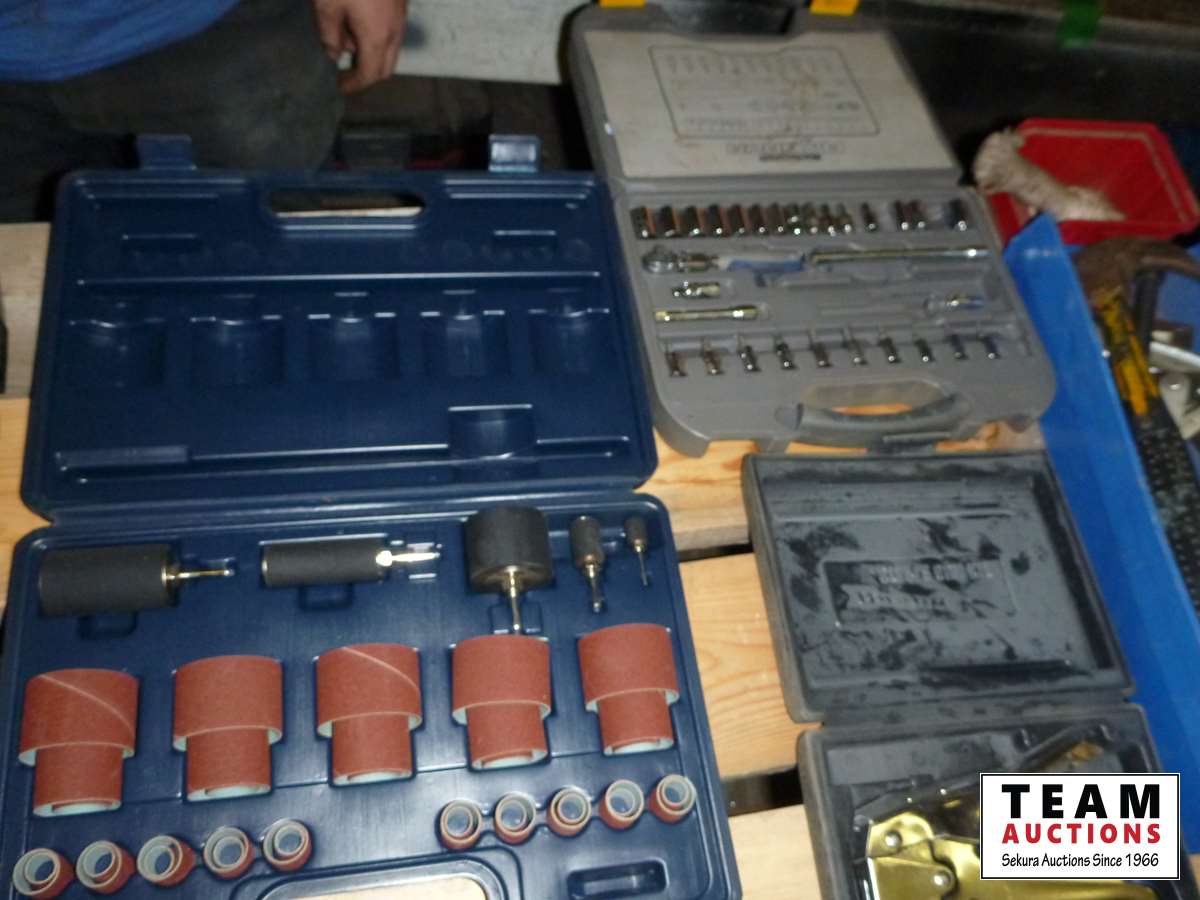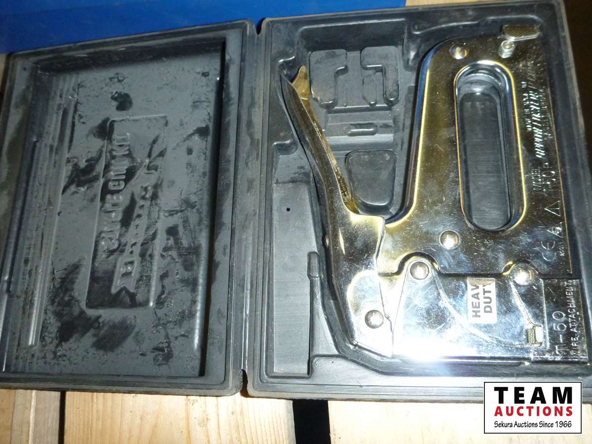 Staple gun, Maxim sanding kit, 1/4 ft socket set, pullers, hammer