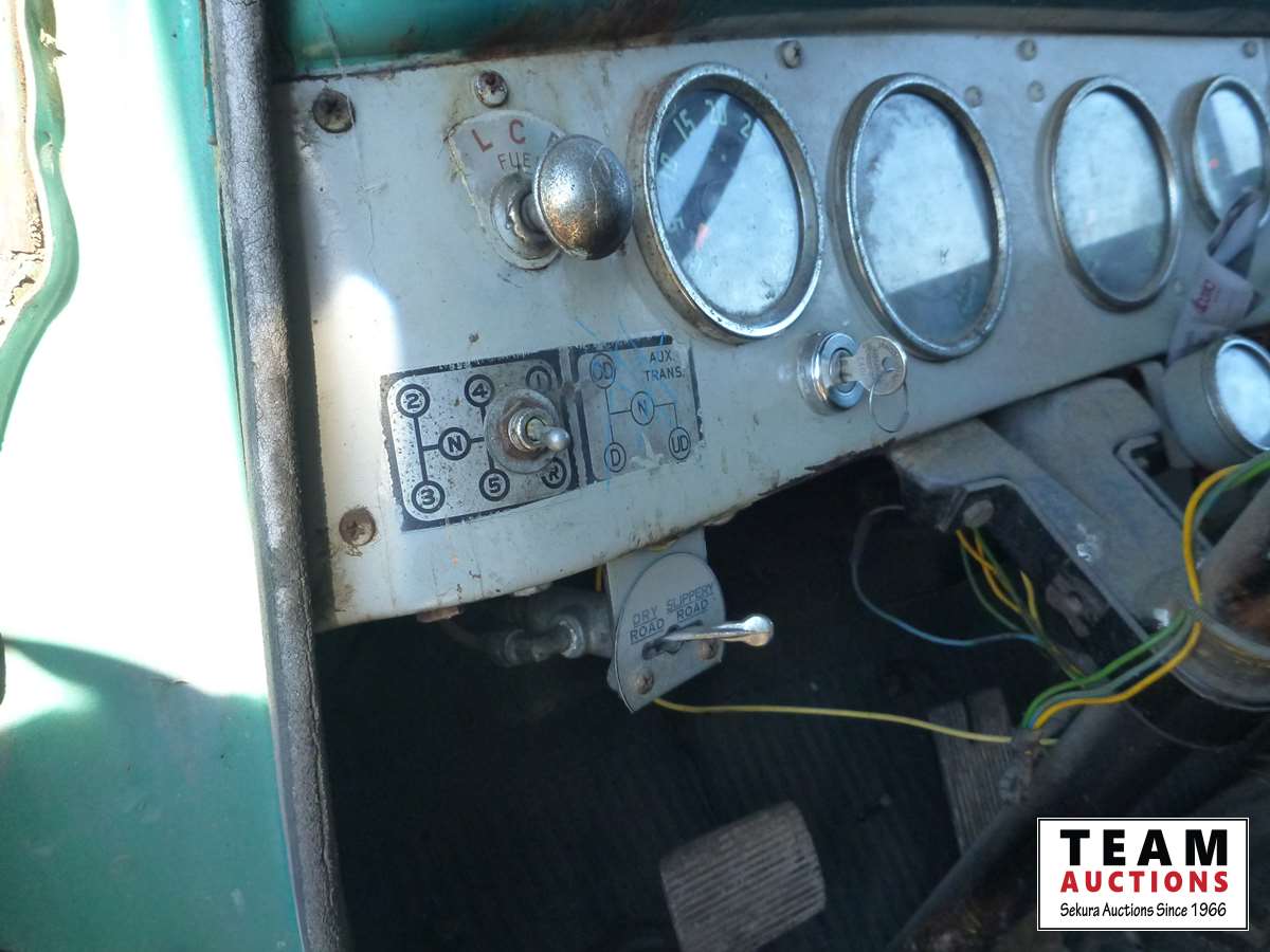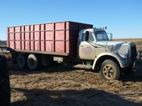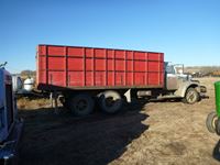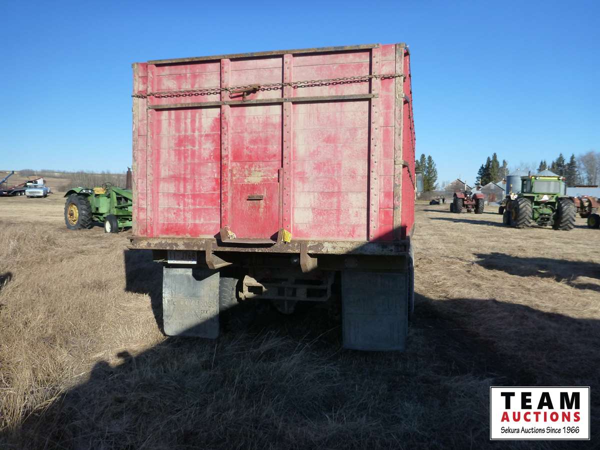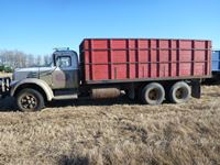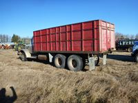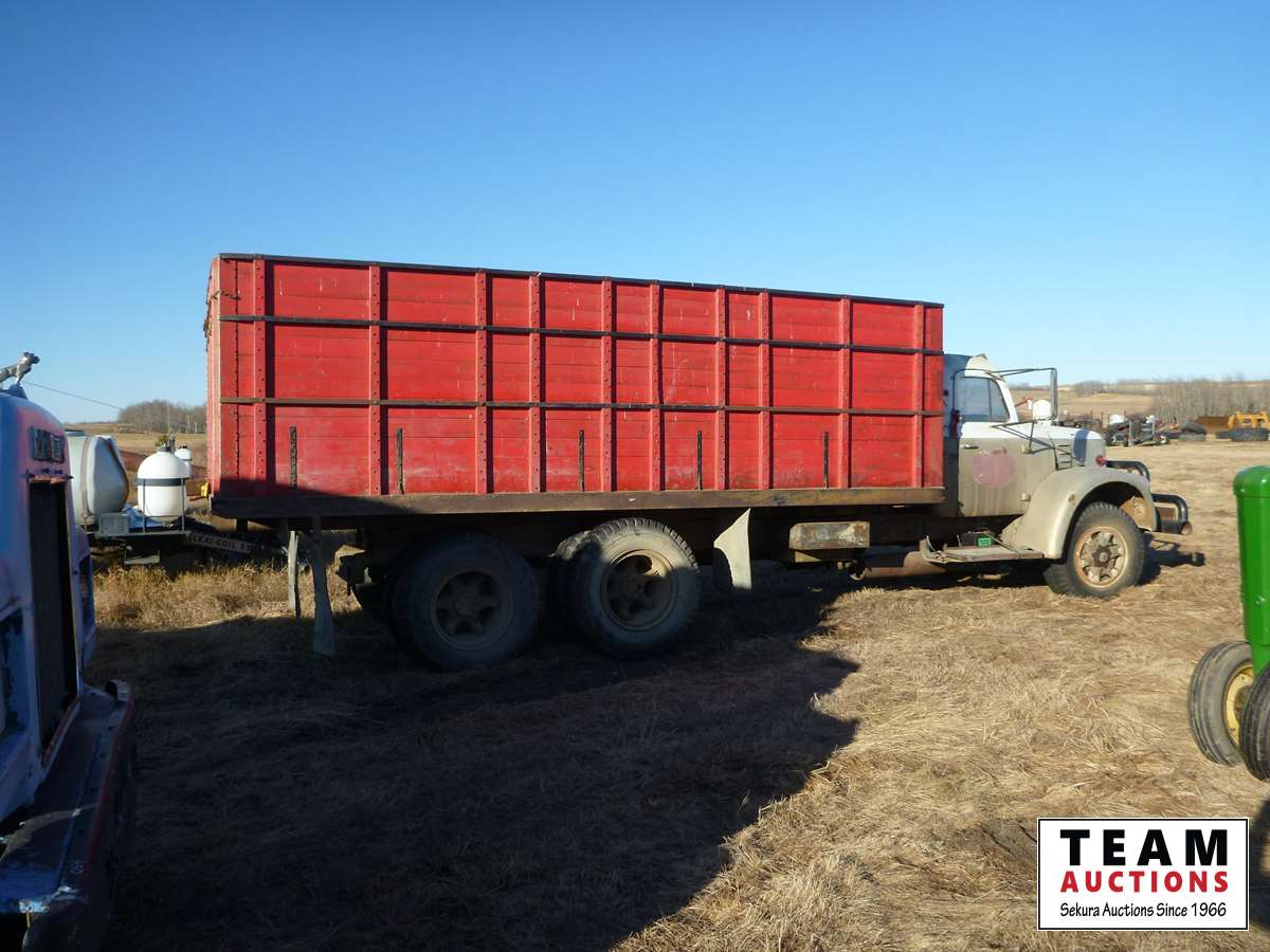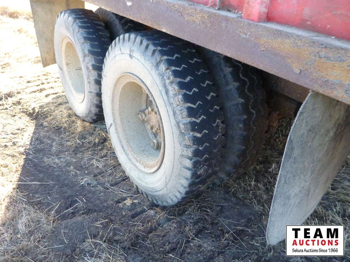 V8 gas engine, air brakes, 5 & 3 transmission, telescopic hoist, 18 ft wood box, 10.00-20 tires
