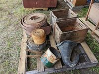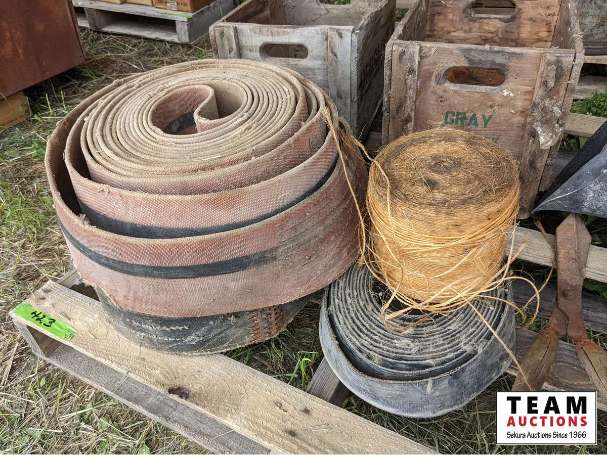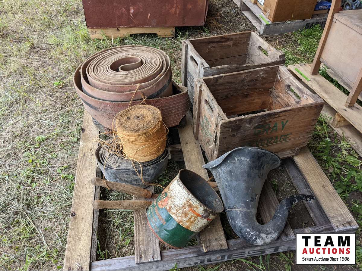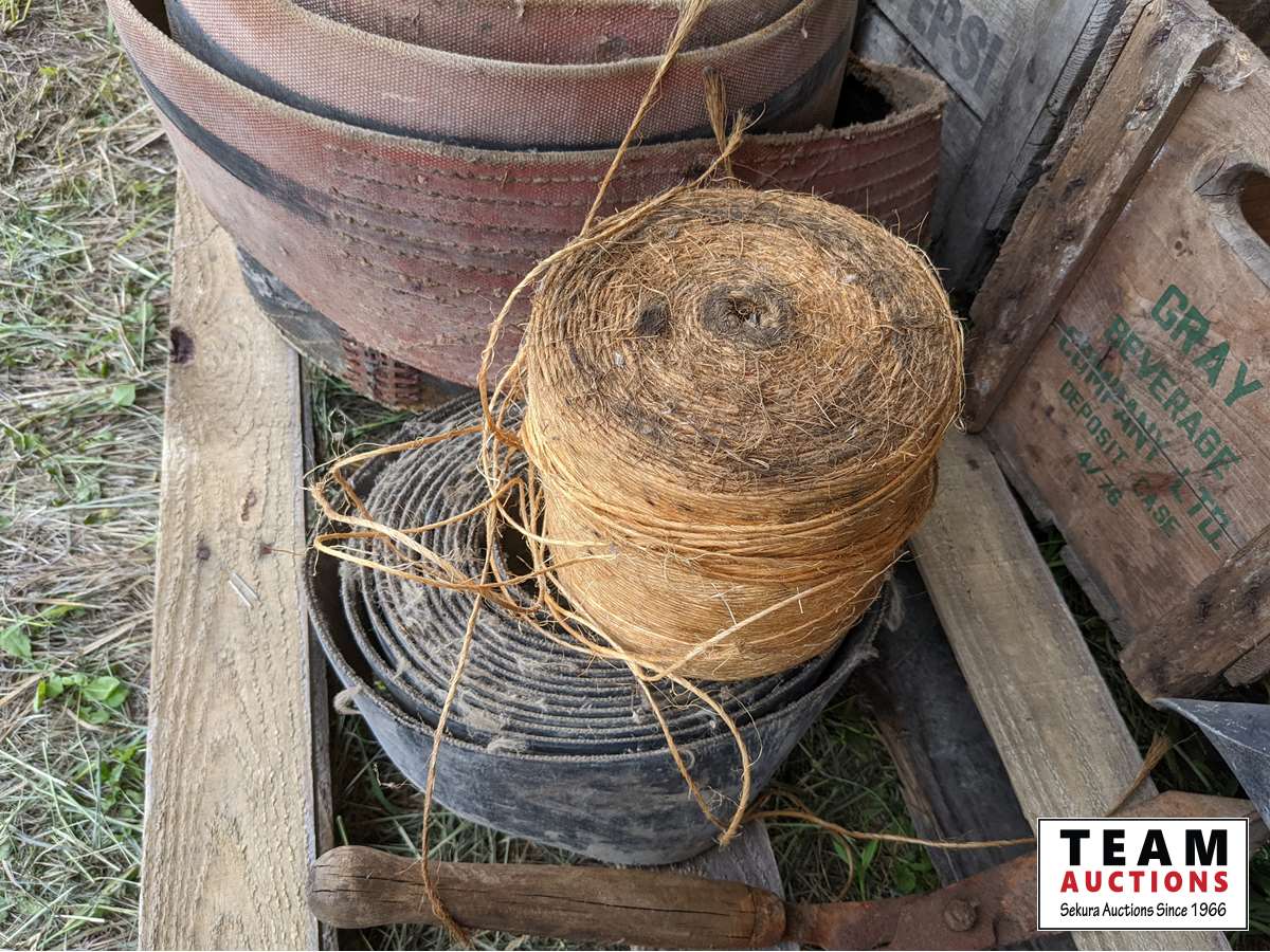 (2) wood crates, (3) rolls belting, b/a can, roll binder twine, shears