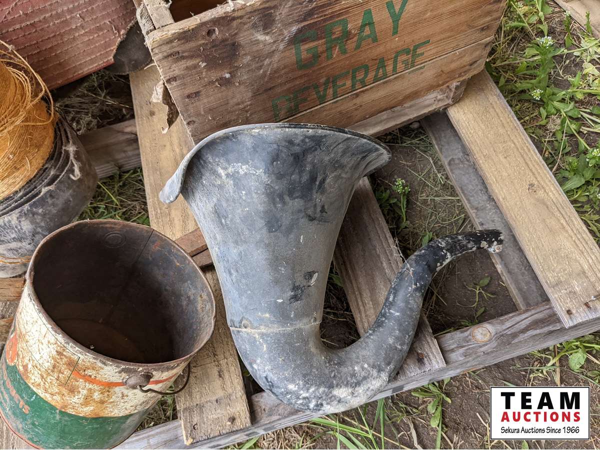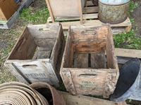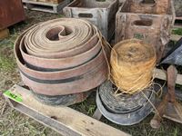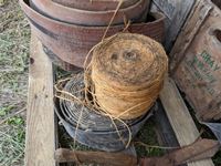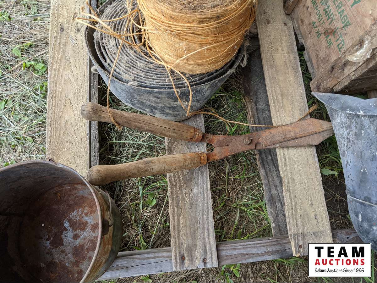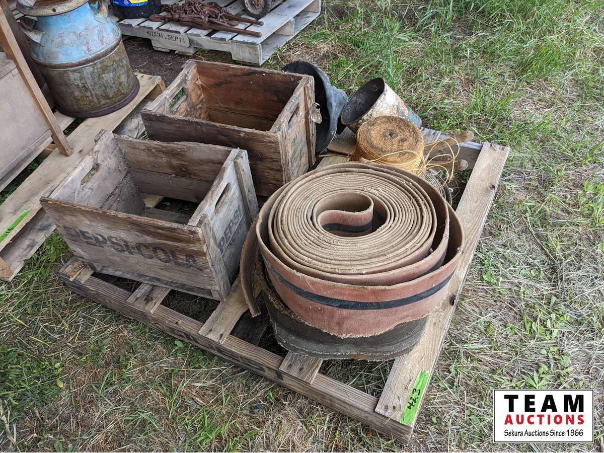 (2) wood crates, (3) rolls belting, b/a can, roll binder twine, shears
