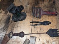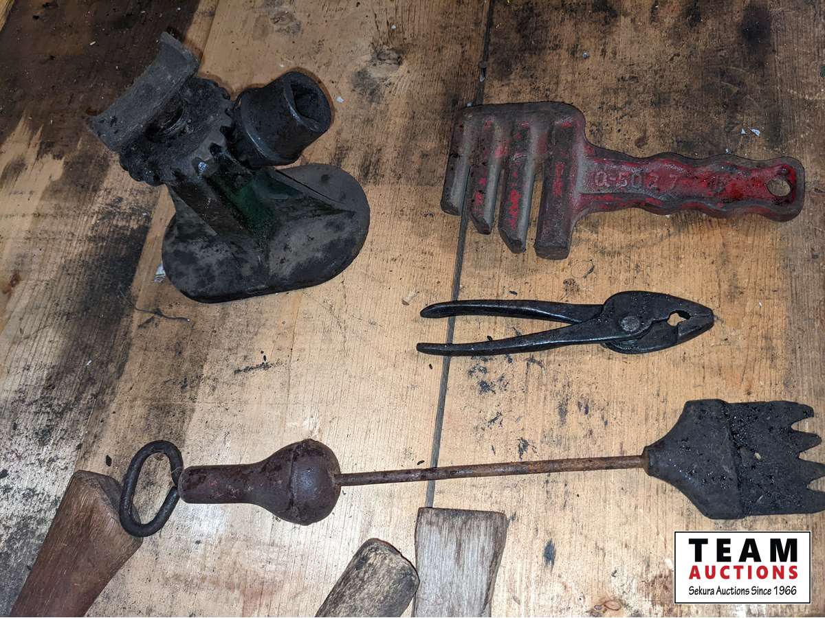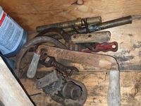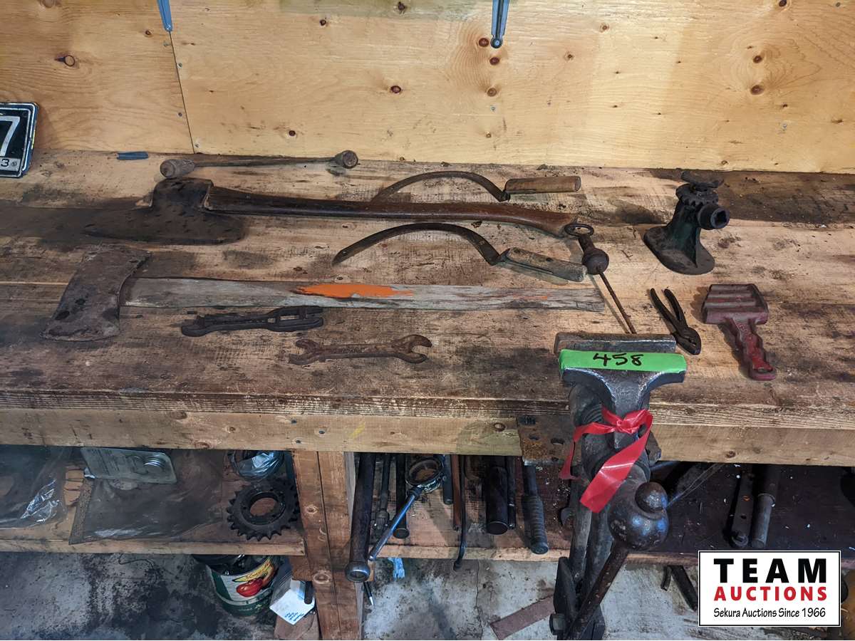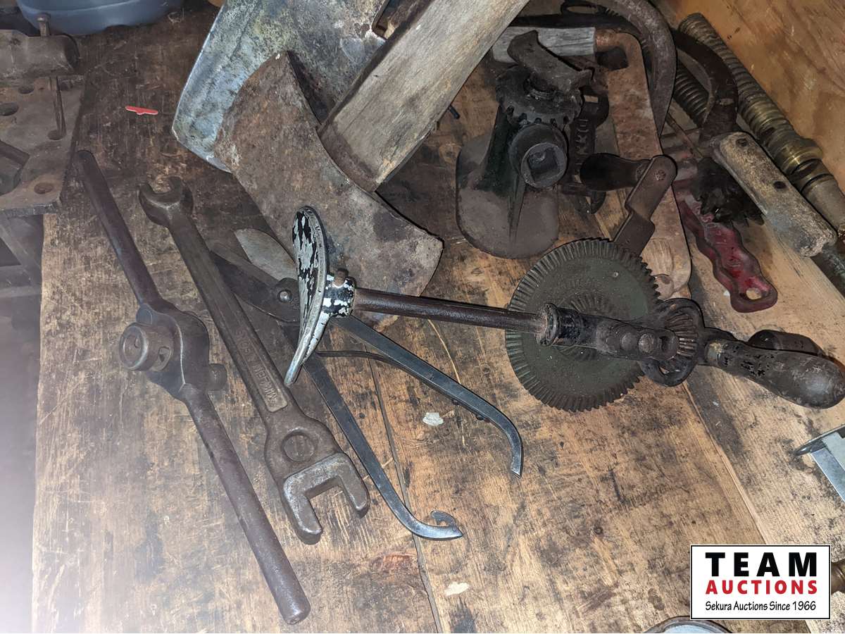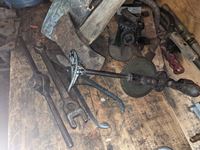 Broad axe, double head axe, small screw jack, wrenches, leg vise, miscellaneous