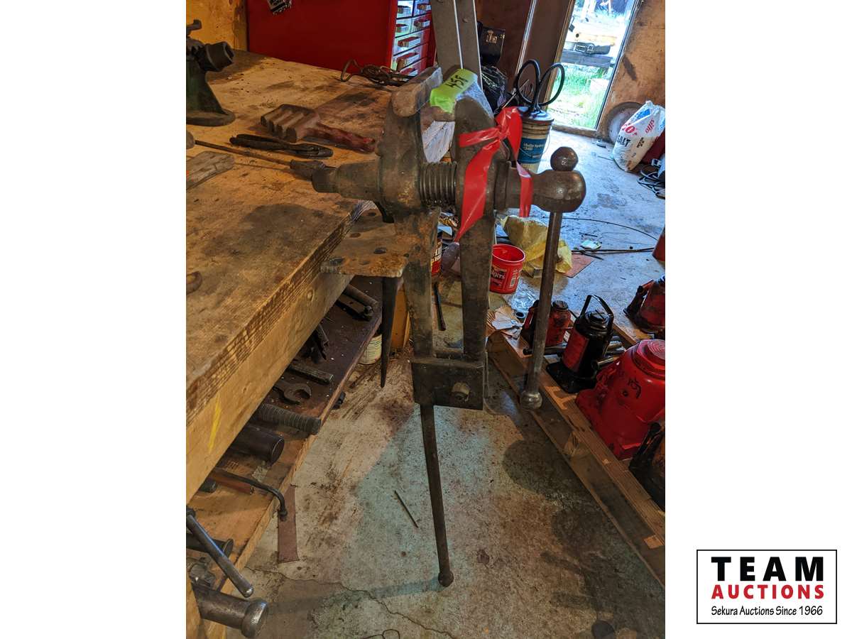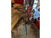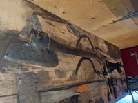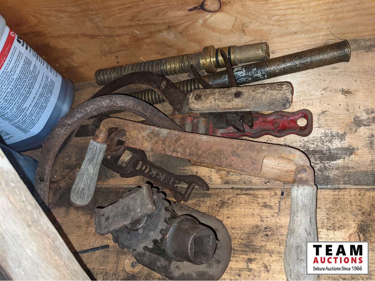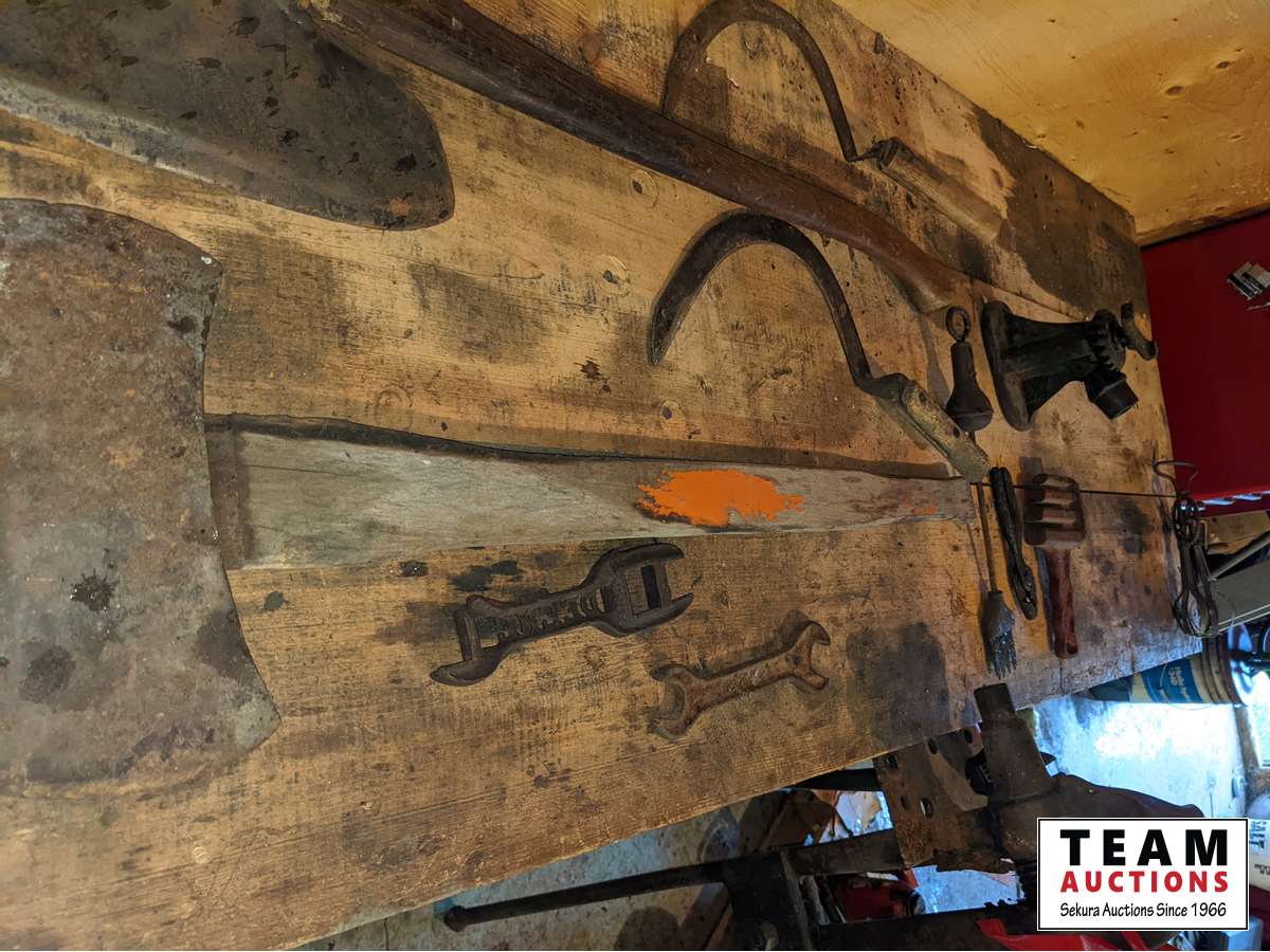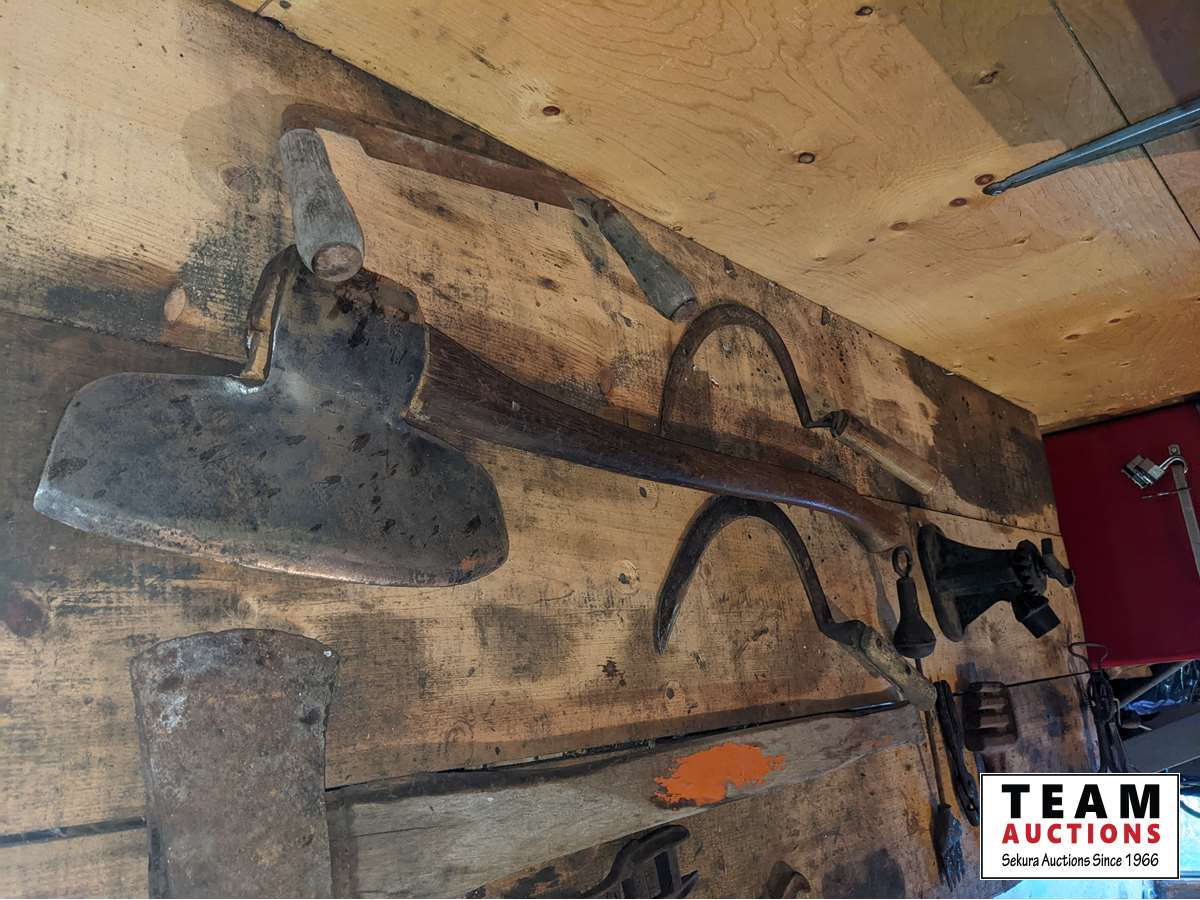 Broad axe, double head axe, small screw jack, wrenches, leg vise, miscellaneous