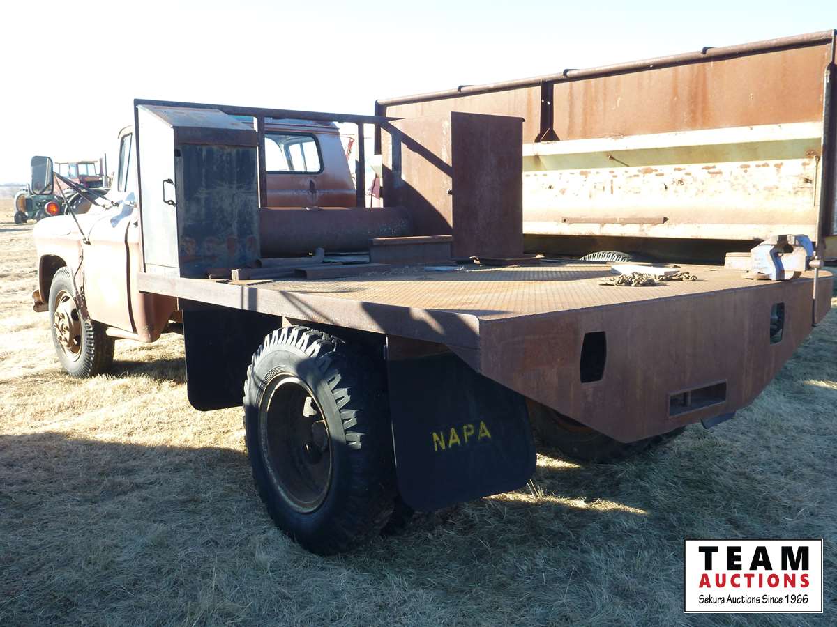 6 cylinder gas engine, 4 & 2 transmission, 7.5 ft w X 9 ft long steel deck with vise & (12) cabinets