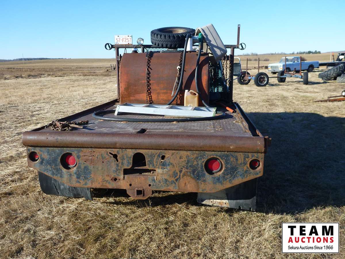 6 cylinder gas engine, 4 speed transmission, 9 ft steel deck, fuel with 12 V pump, air compressor with gas engine, 7.50-16 duals