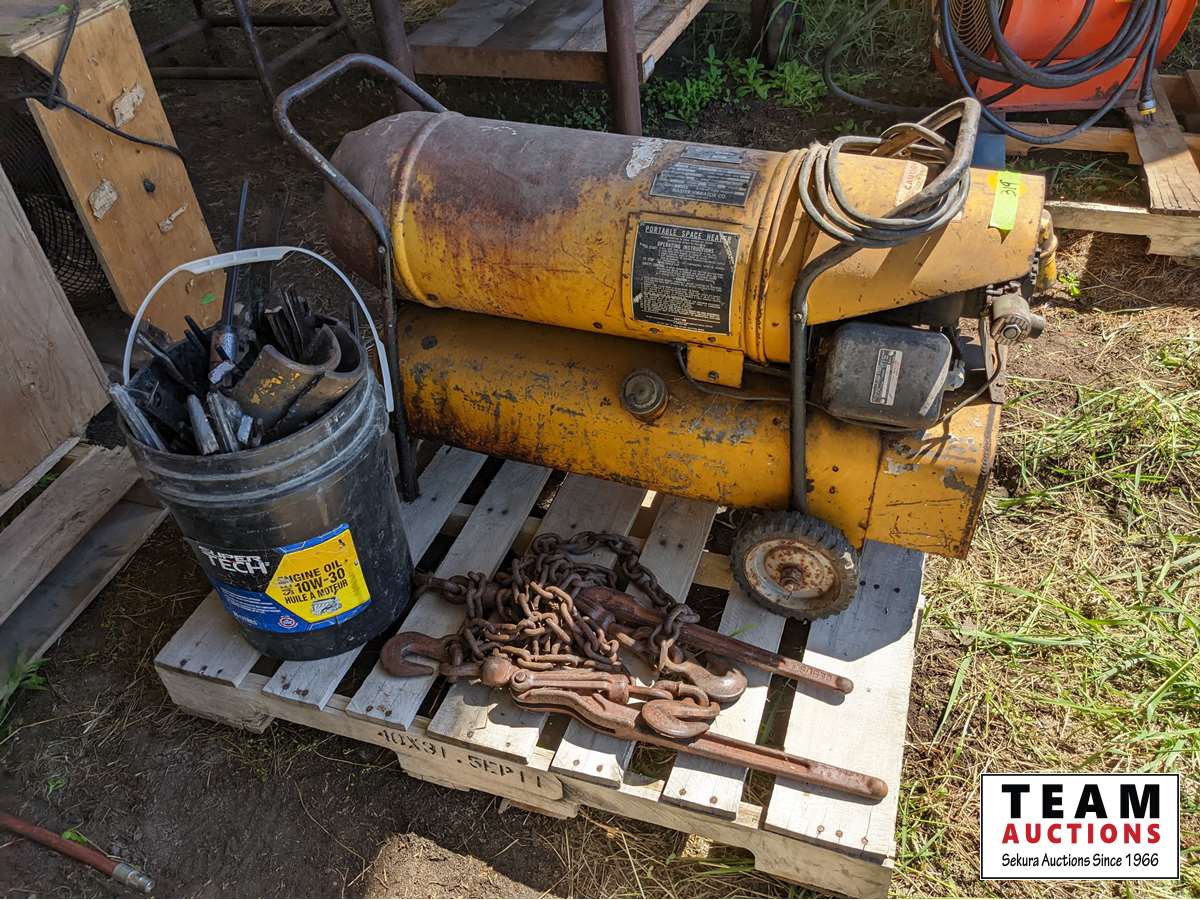 Portable diesel heater, qty of crop lifters, (2) load binders, chain