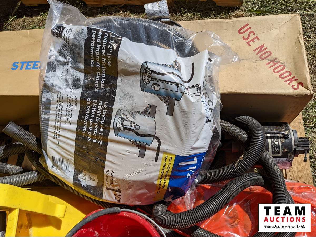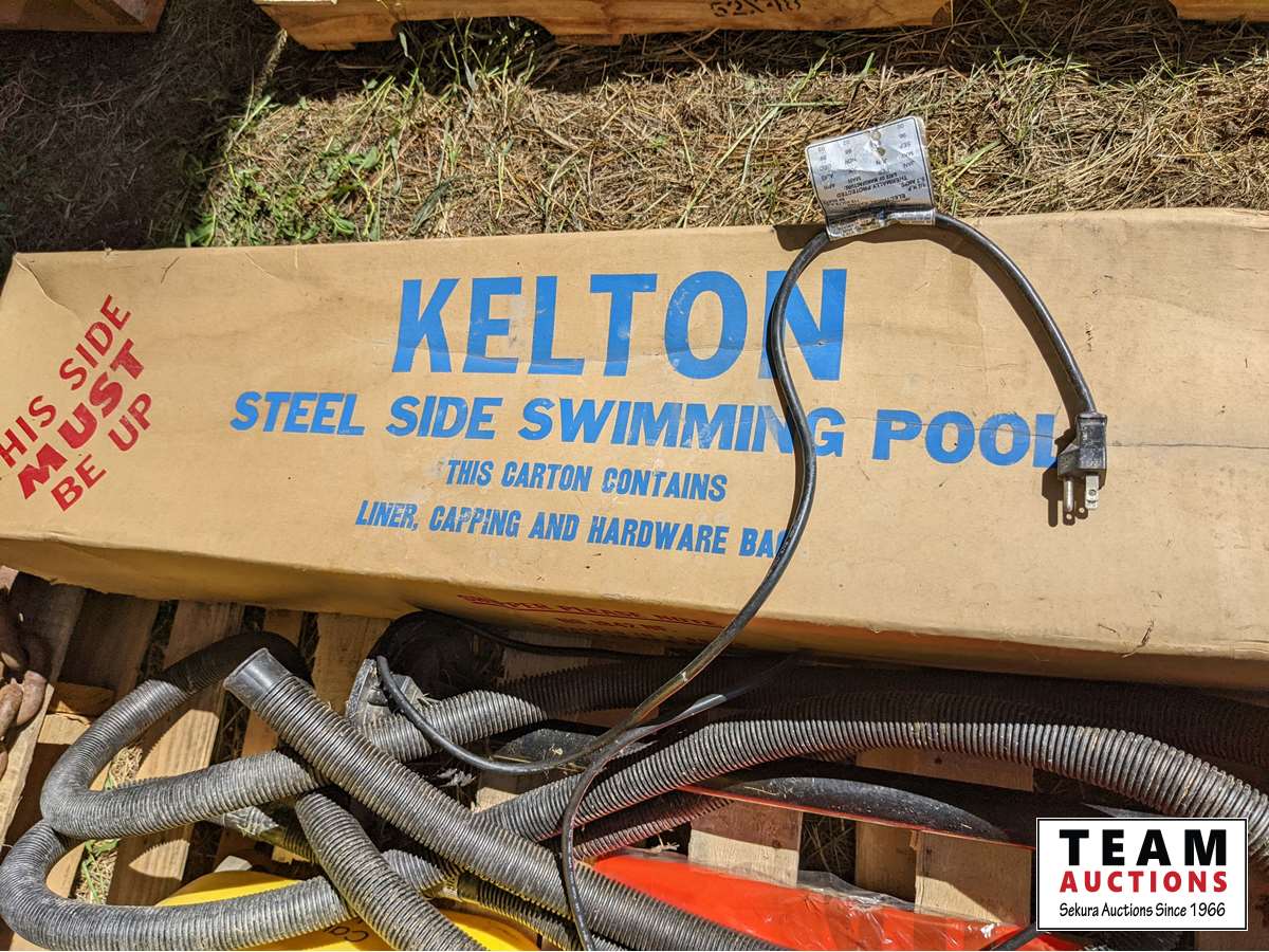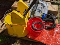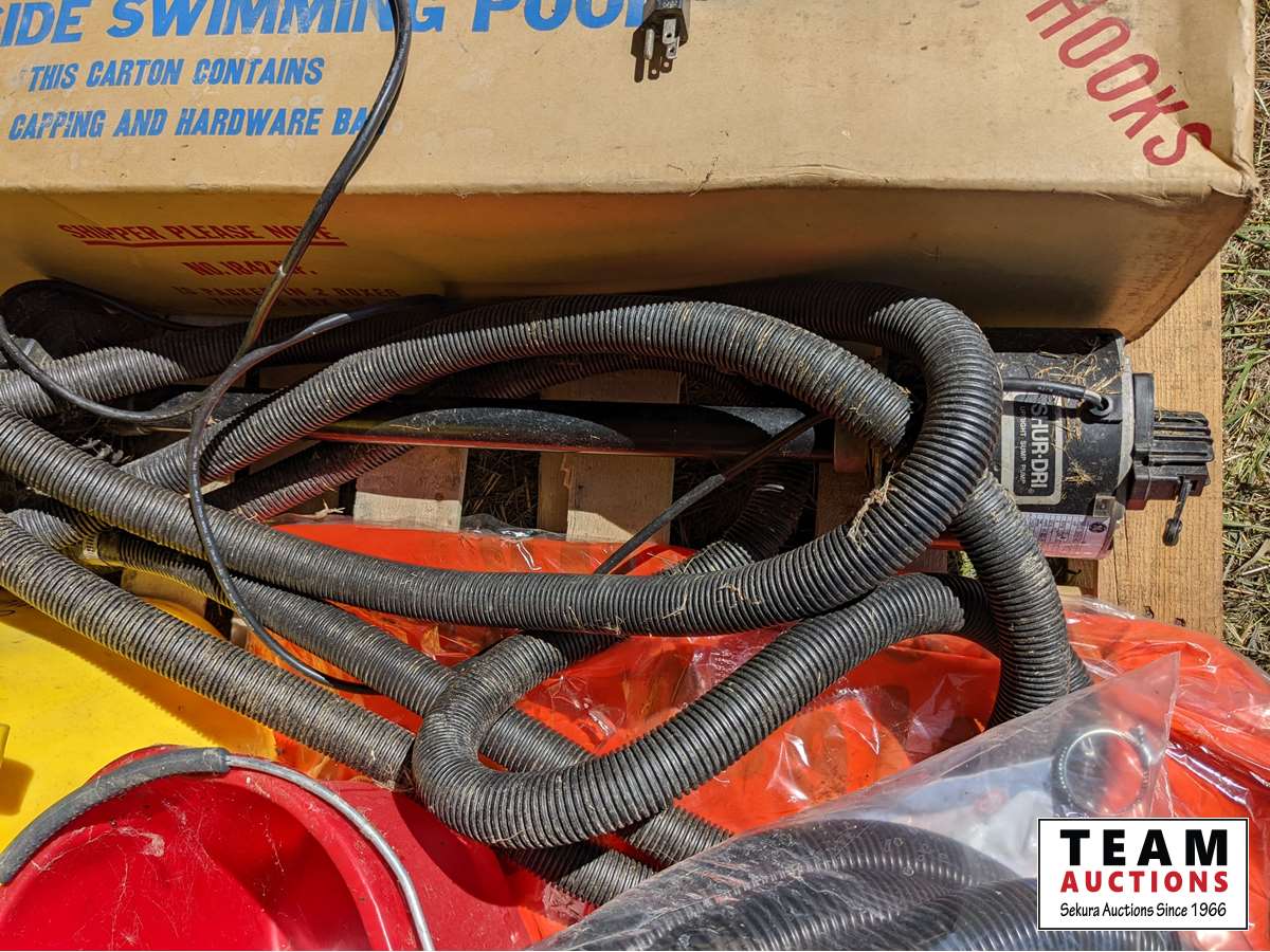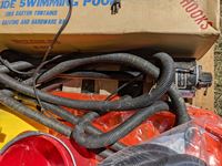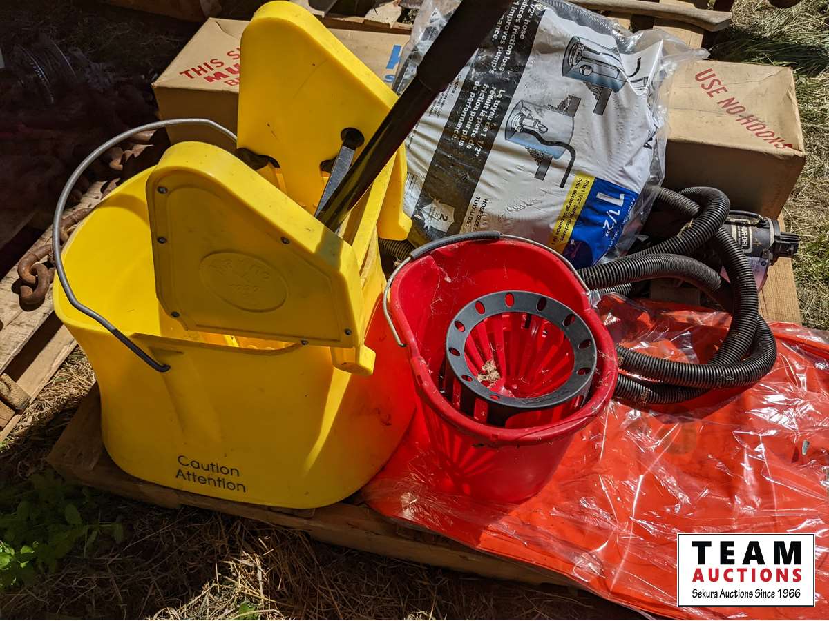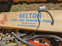 Steel sided swimming pool, sump pump with hoses, (2) mop pails
