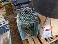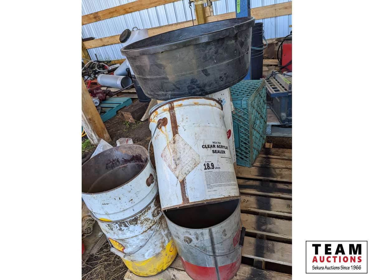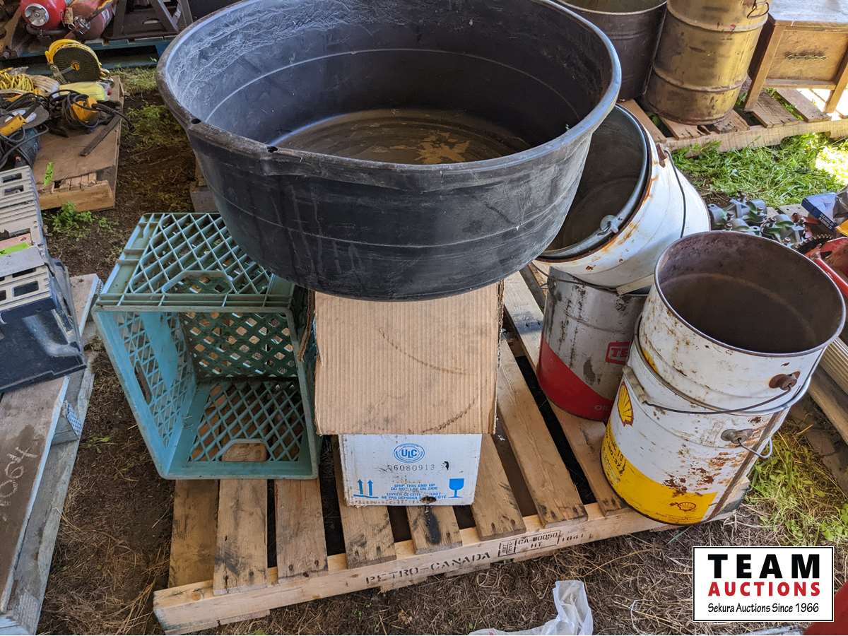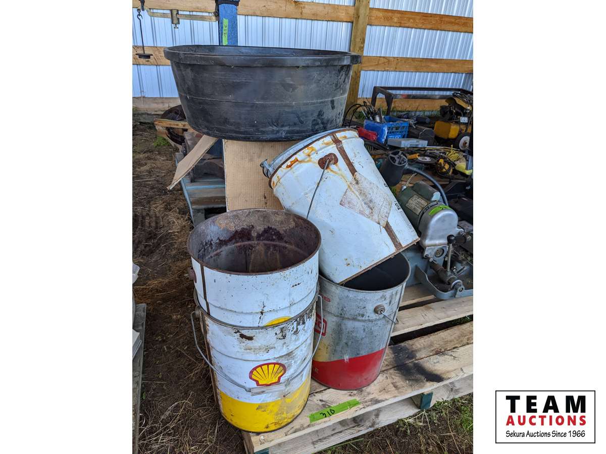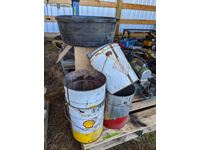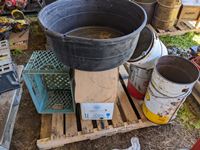 Qty of metal 5 gal pails, feed tub, tote, insulated chimney 6 inch X 24 inch