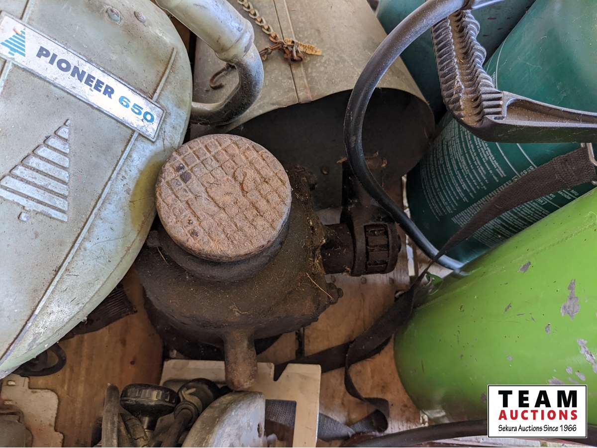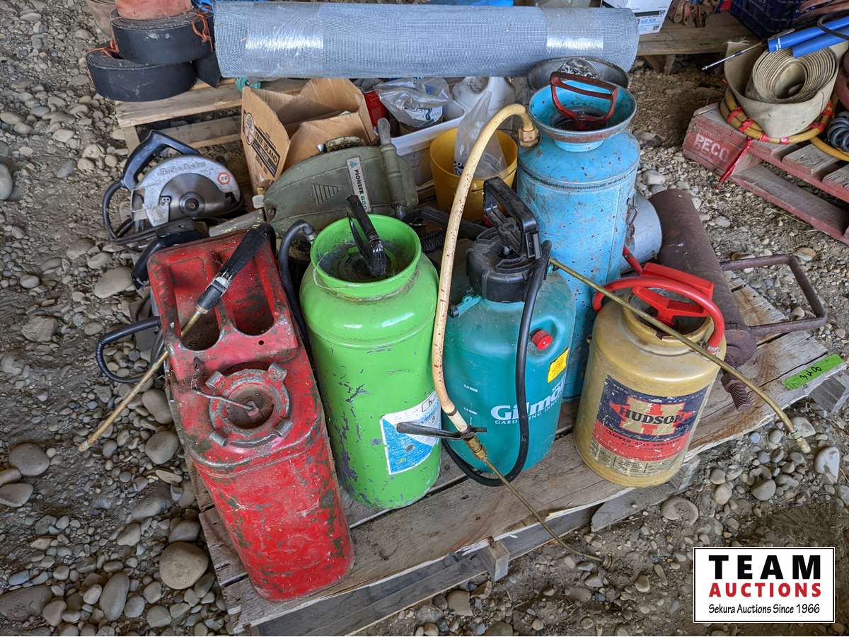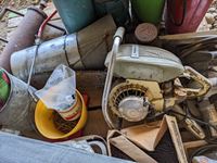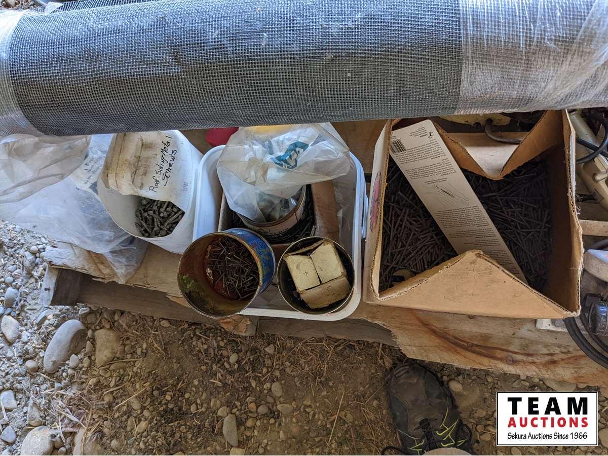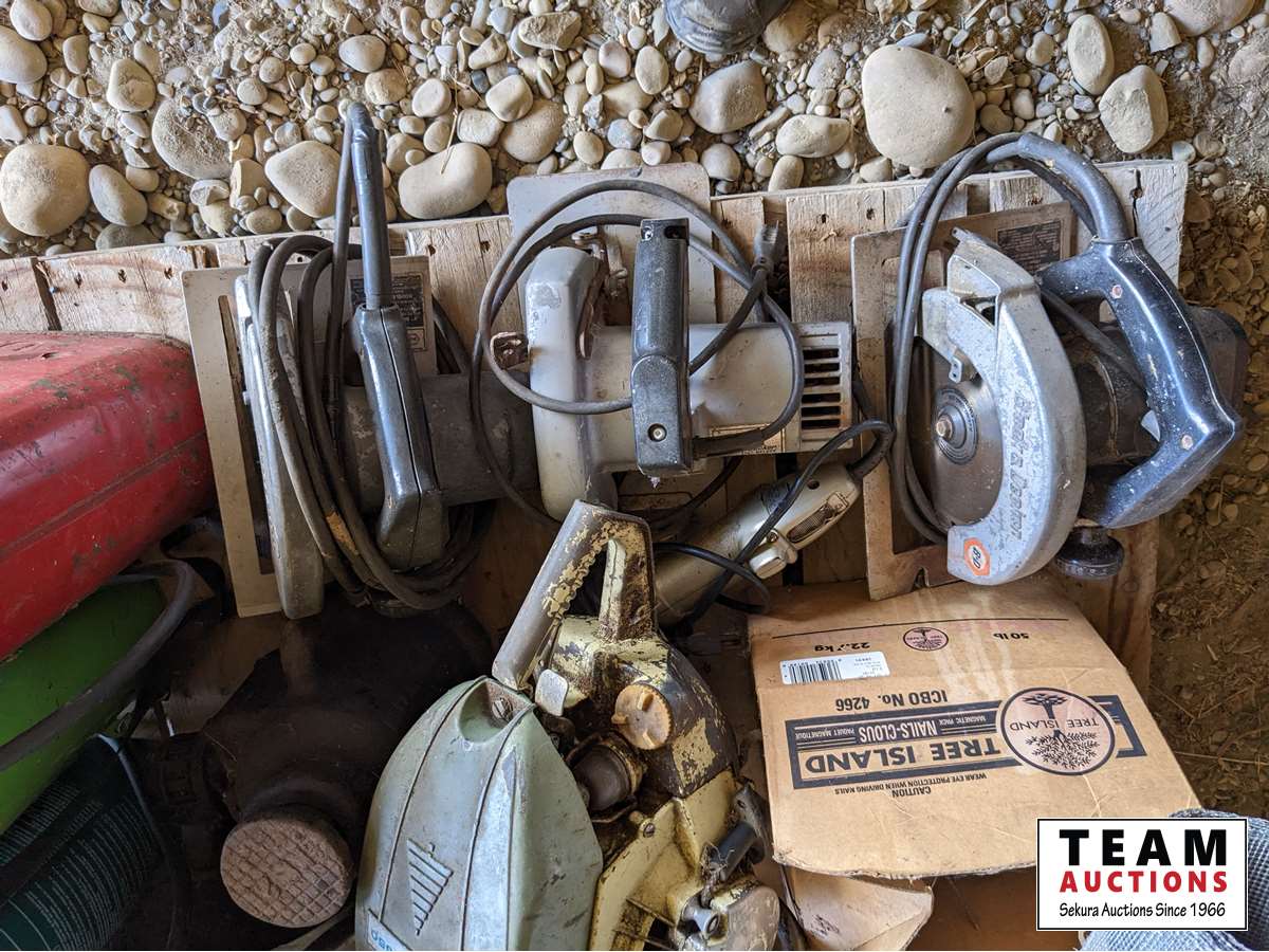 Hand Post Pounder, Pioneer Chain Saw, circular saws, heavy duty jack, roll of screen, miscellaneous nails