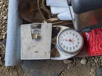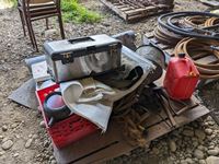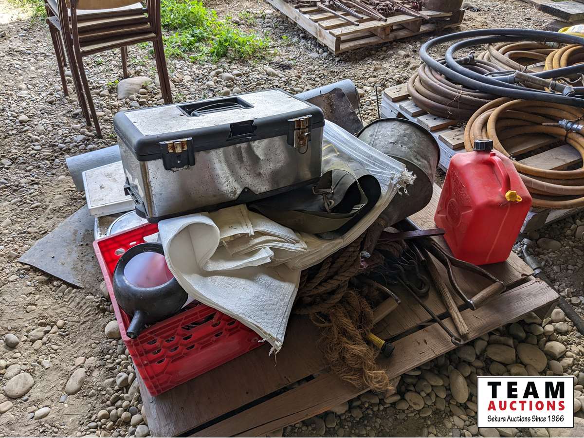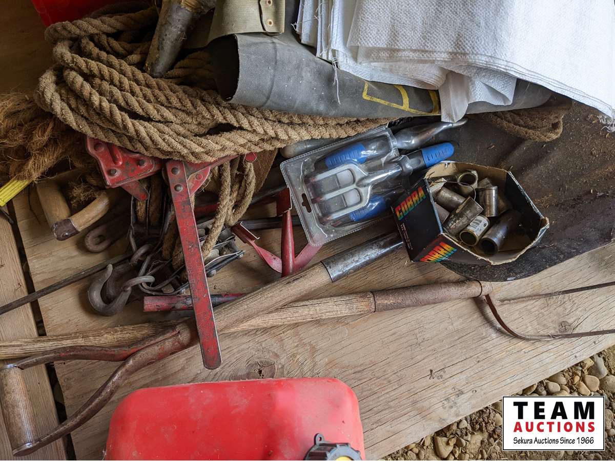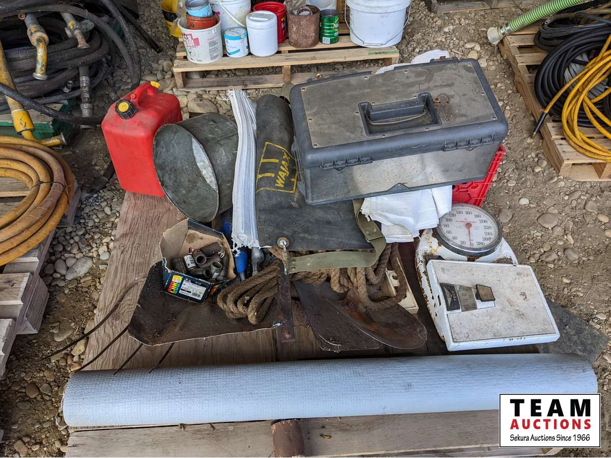 Roll roof wrap, machine bushings, (2) weigh scales, rope wire stretcher, sacks, tool box, Jerry can, miscellaneous
