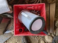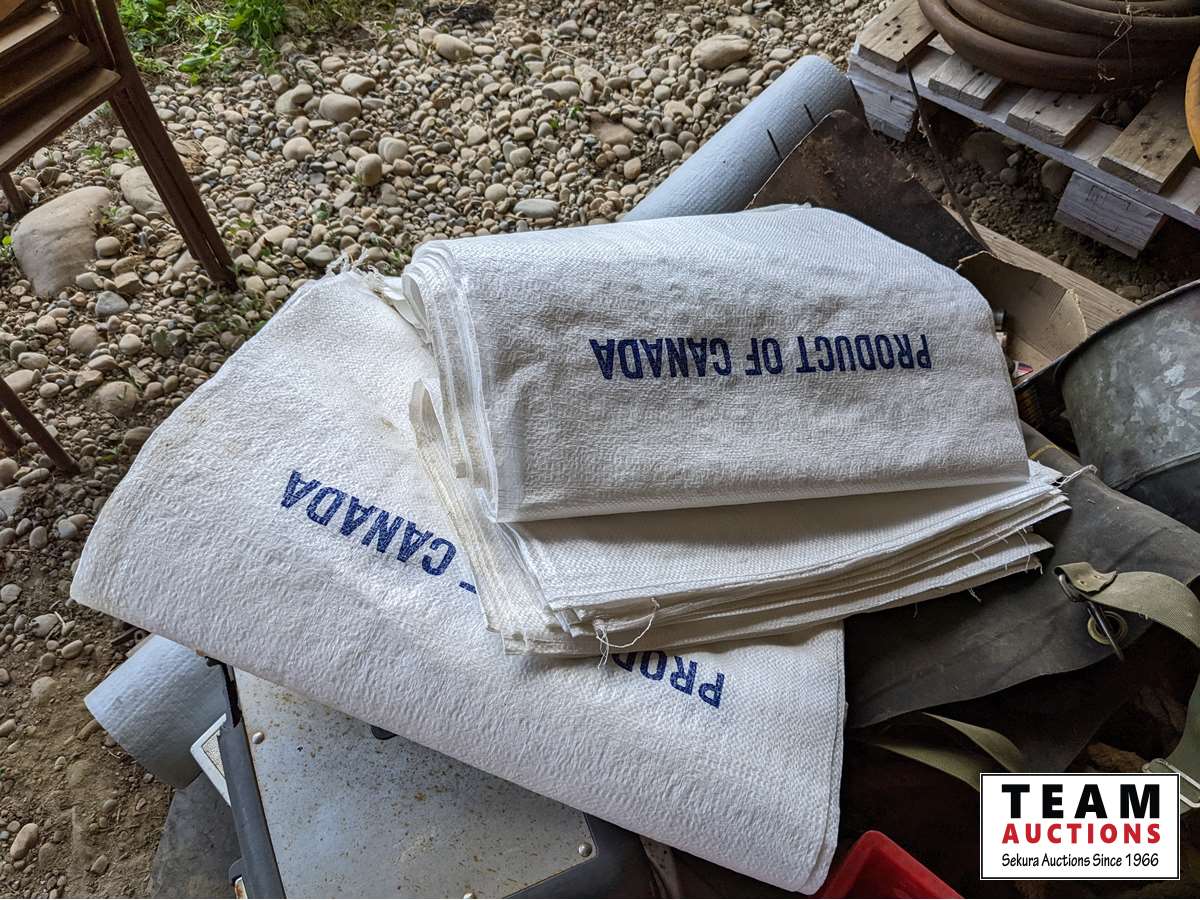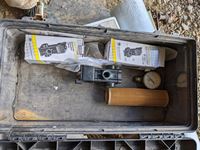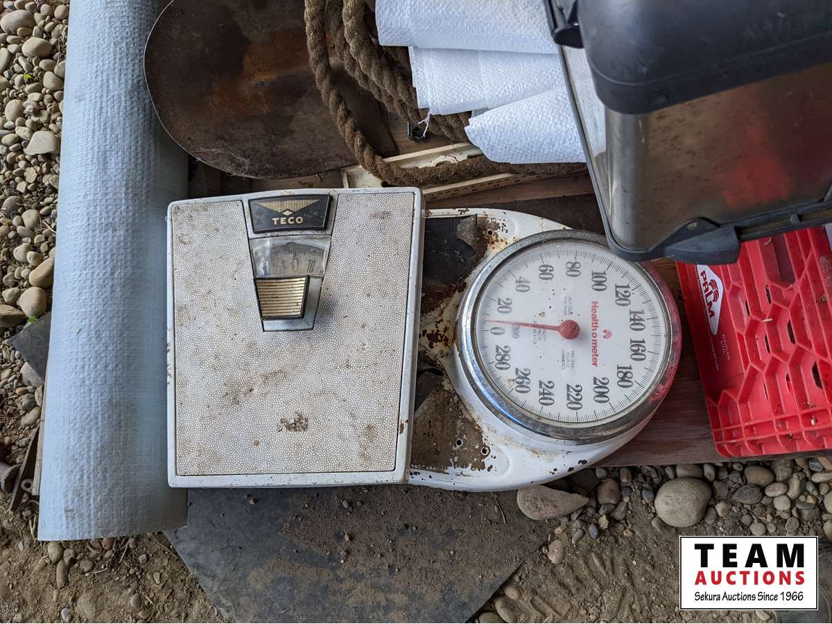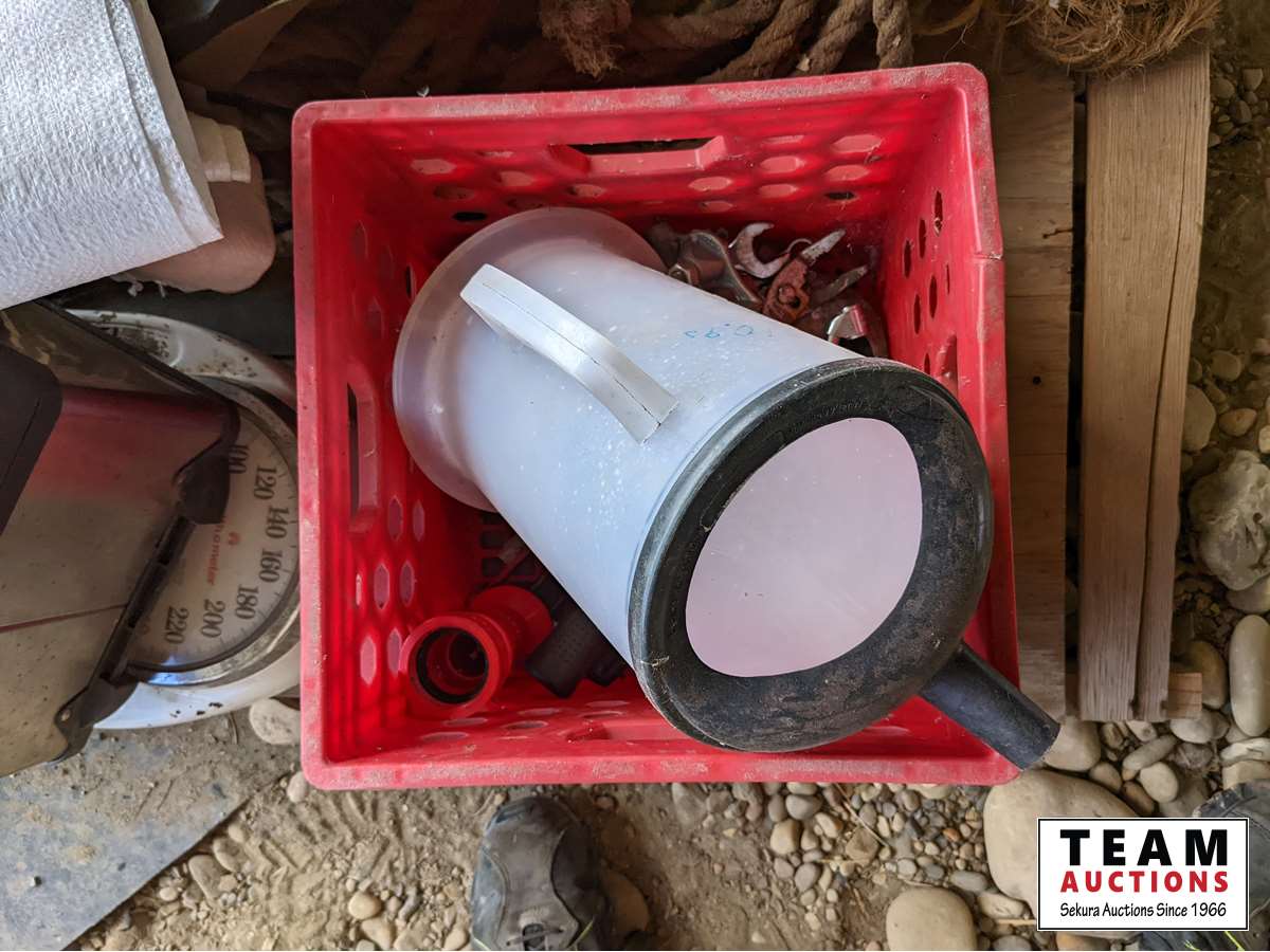 Roll roof wrap, machine bushings, (2) weigh scales, rope wire stretcher, sacks, tool box, Jerry can, miscellaneous