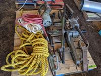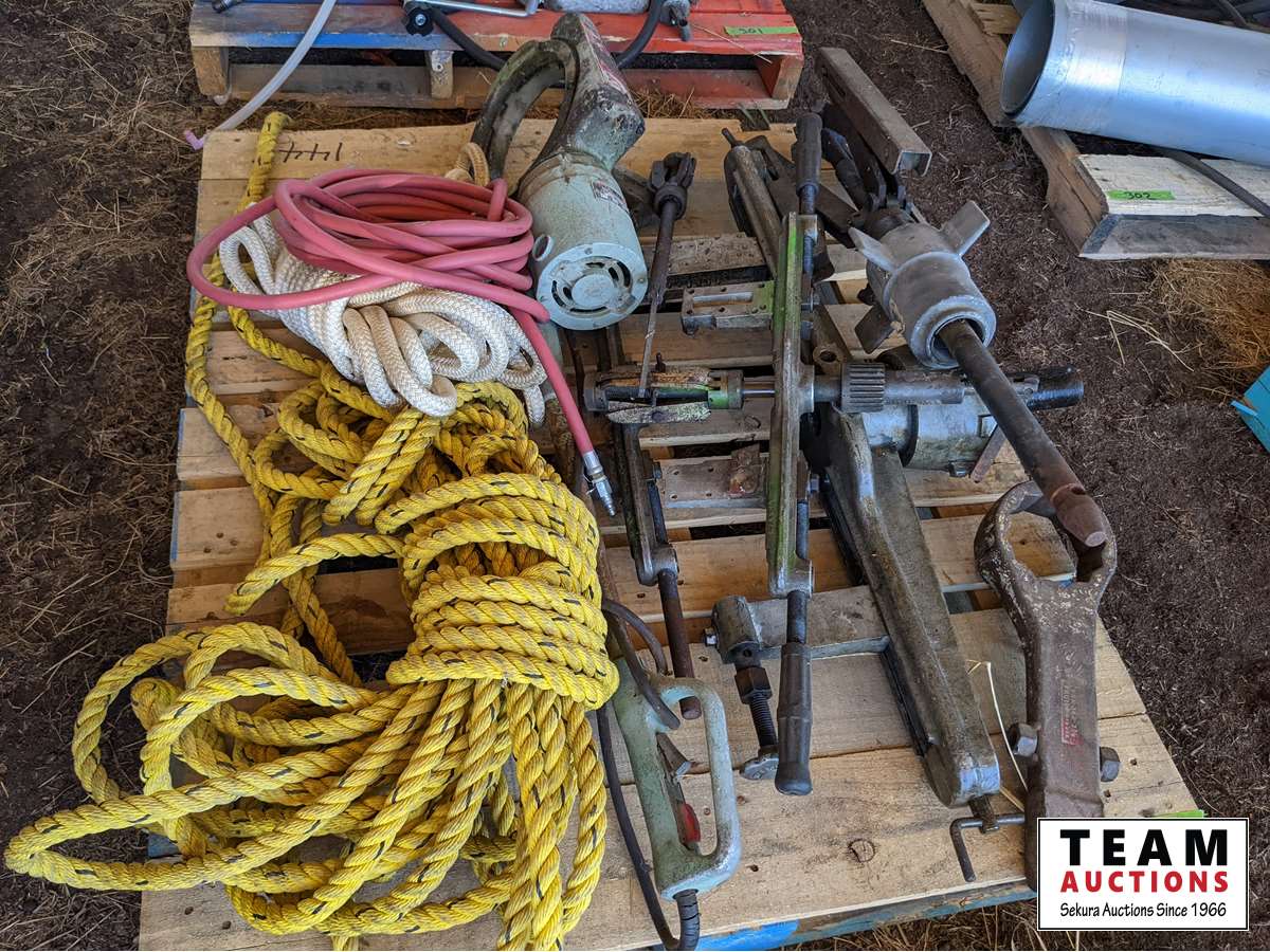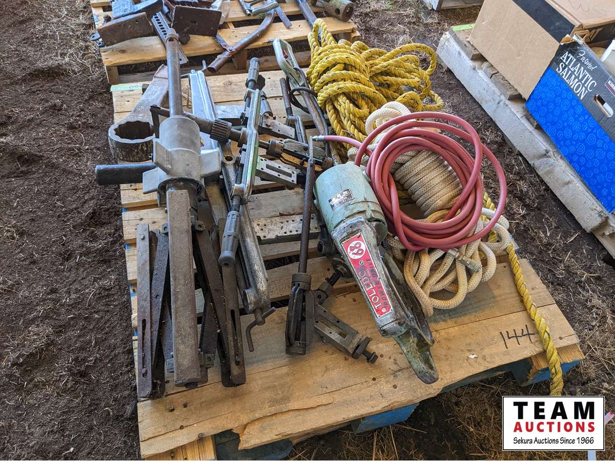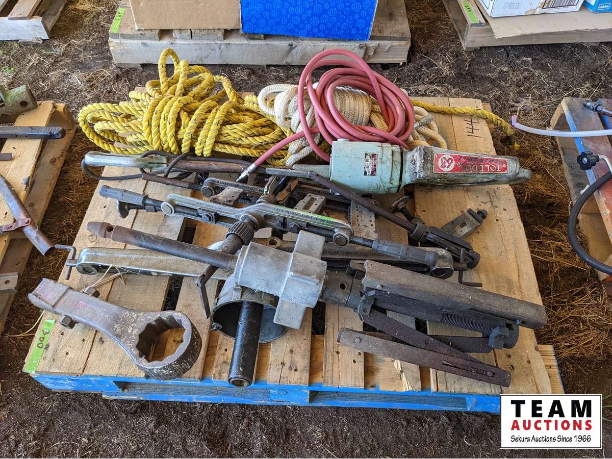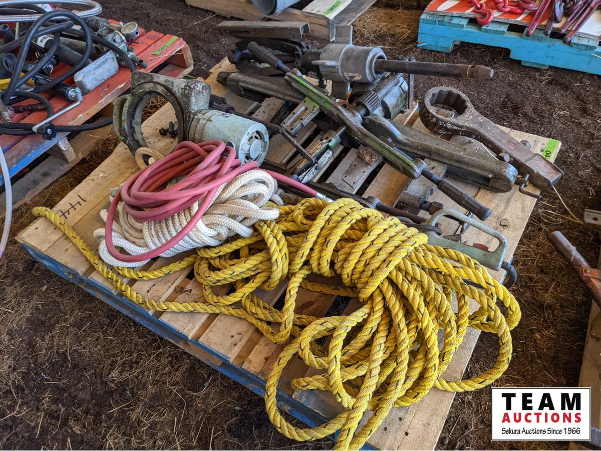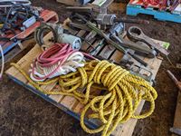 Rope, pullers, large hammer wrench, air hose, miscellaneous tools and other items