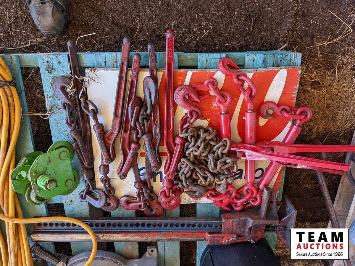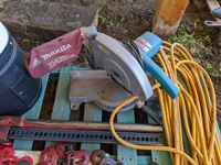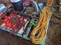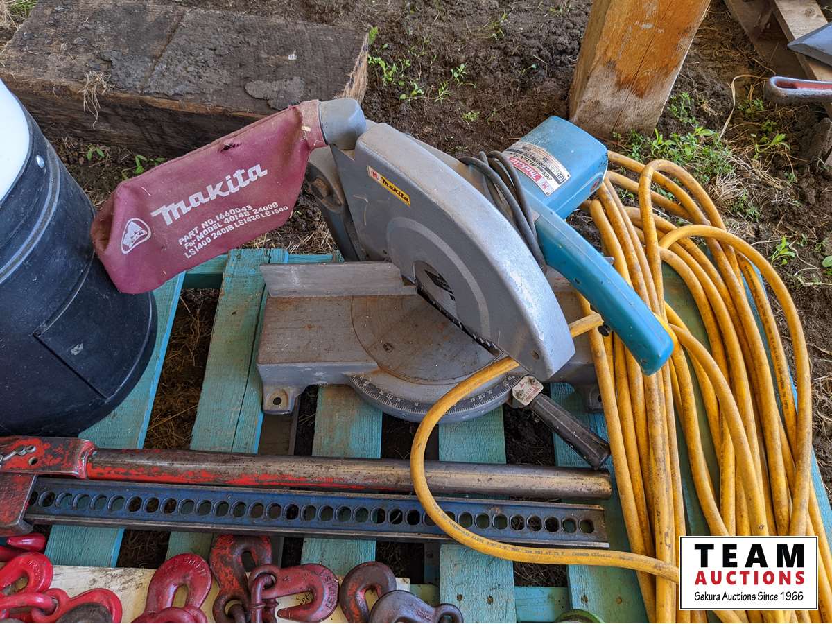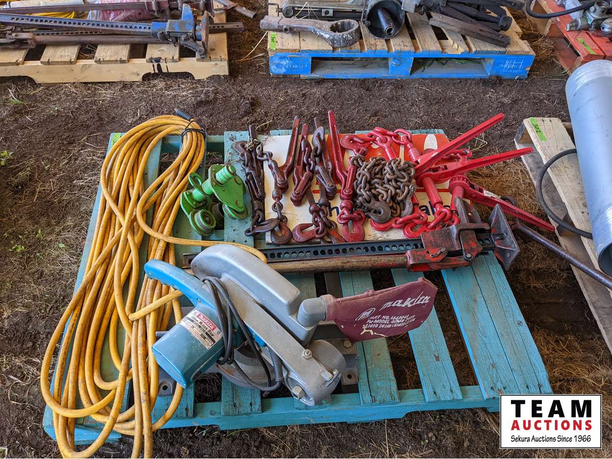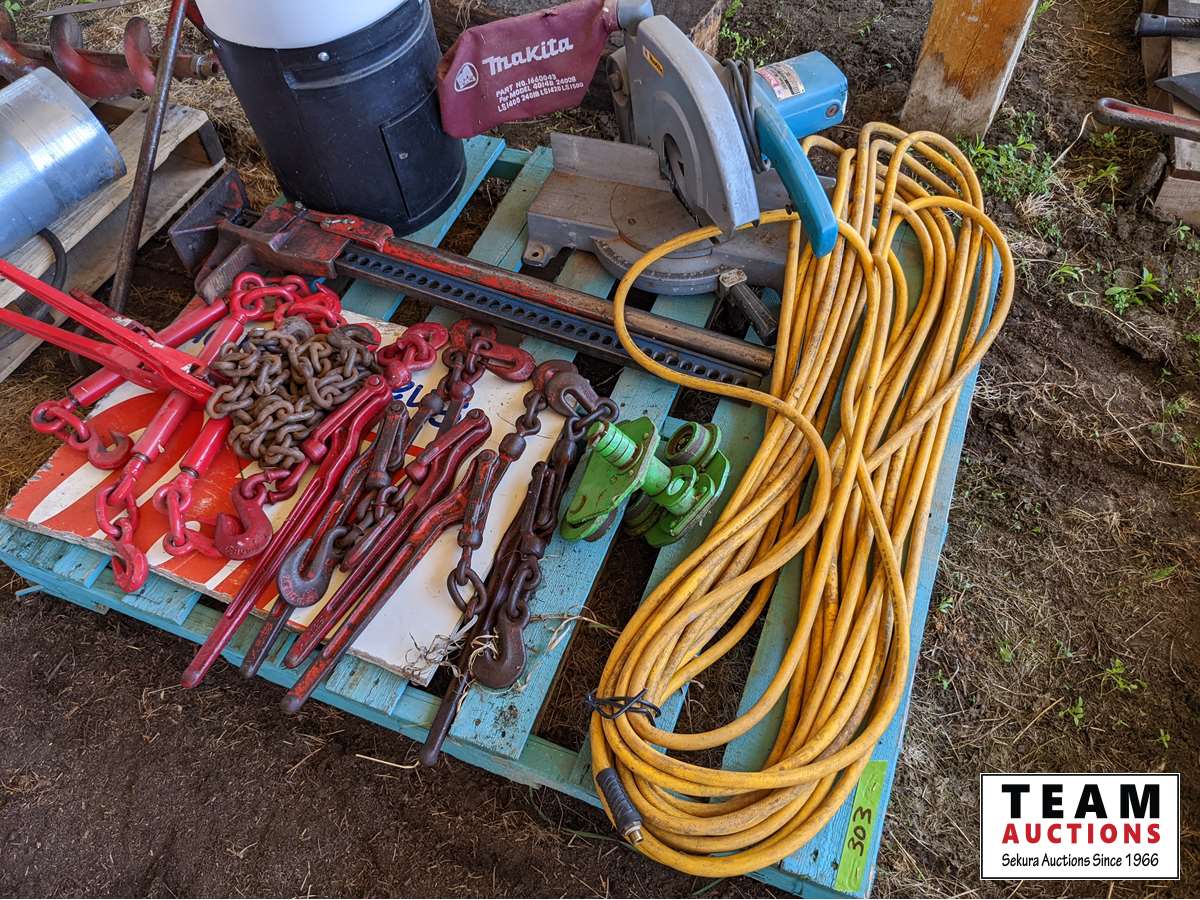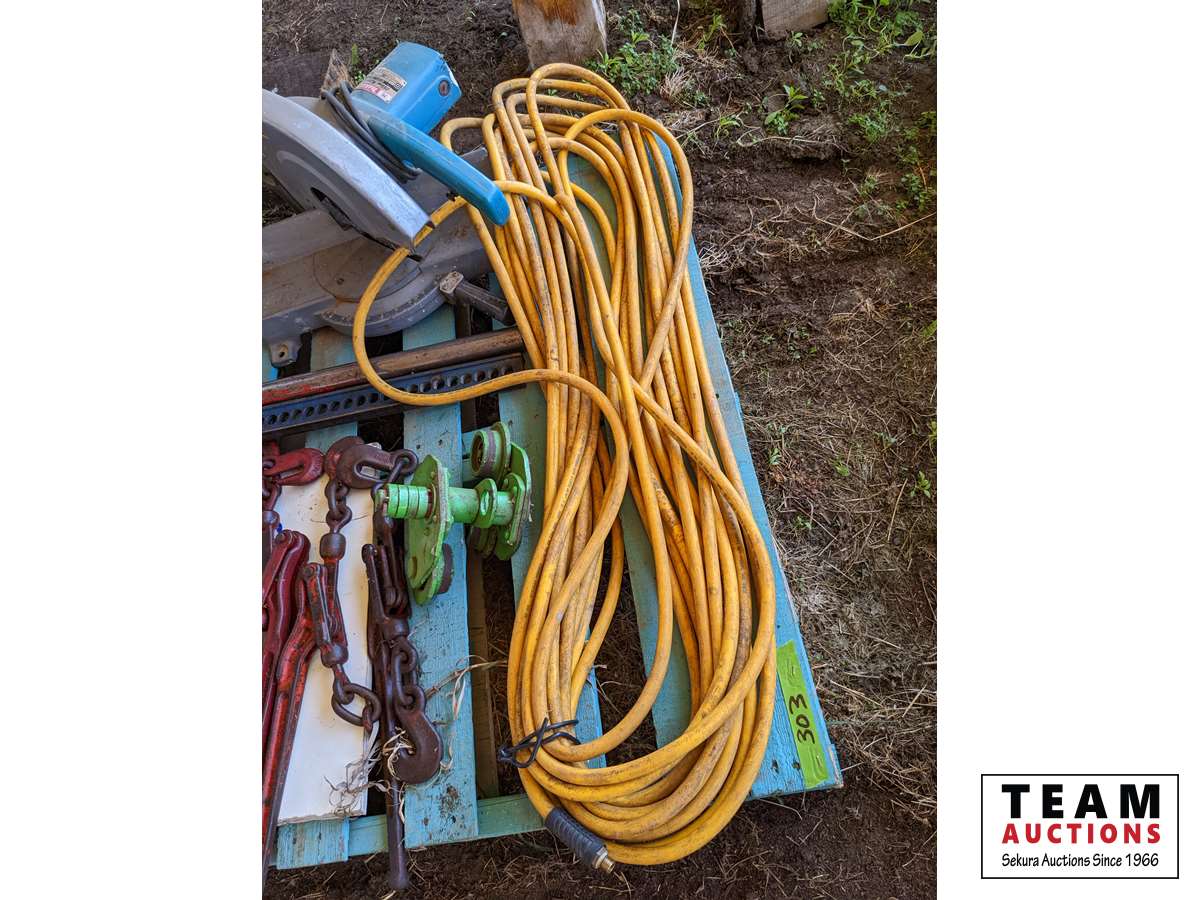 Air hose, Makita Mitre saw, chain hoist trolly, Jack all, load binders, extension cord