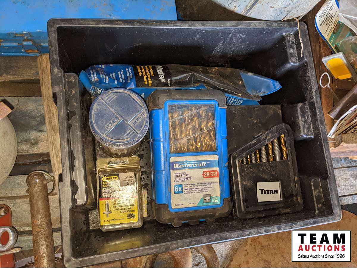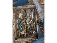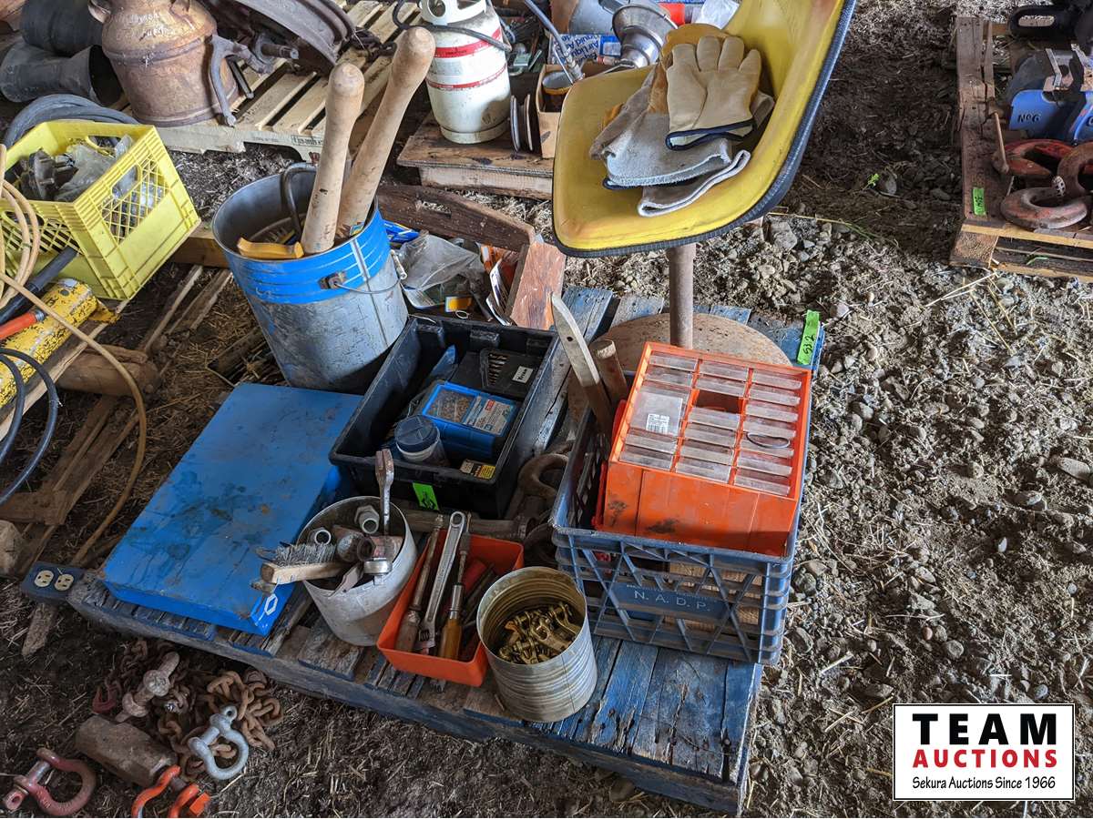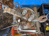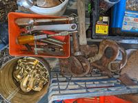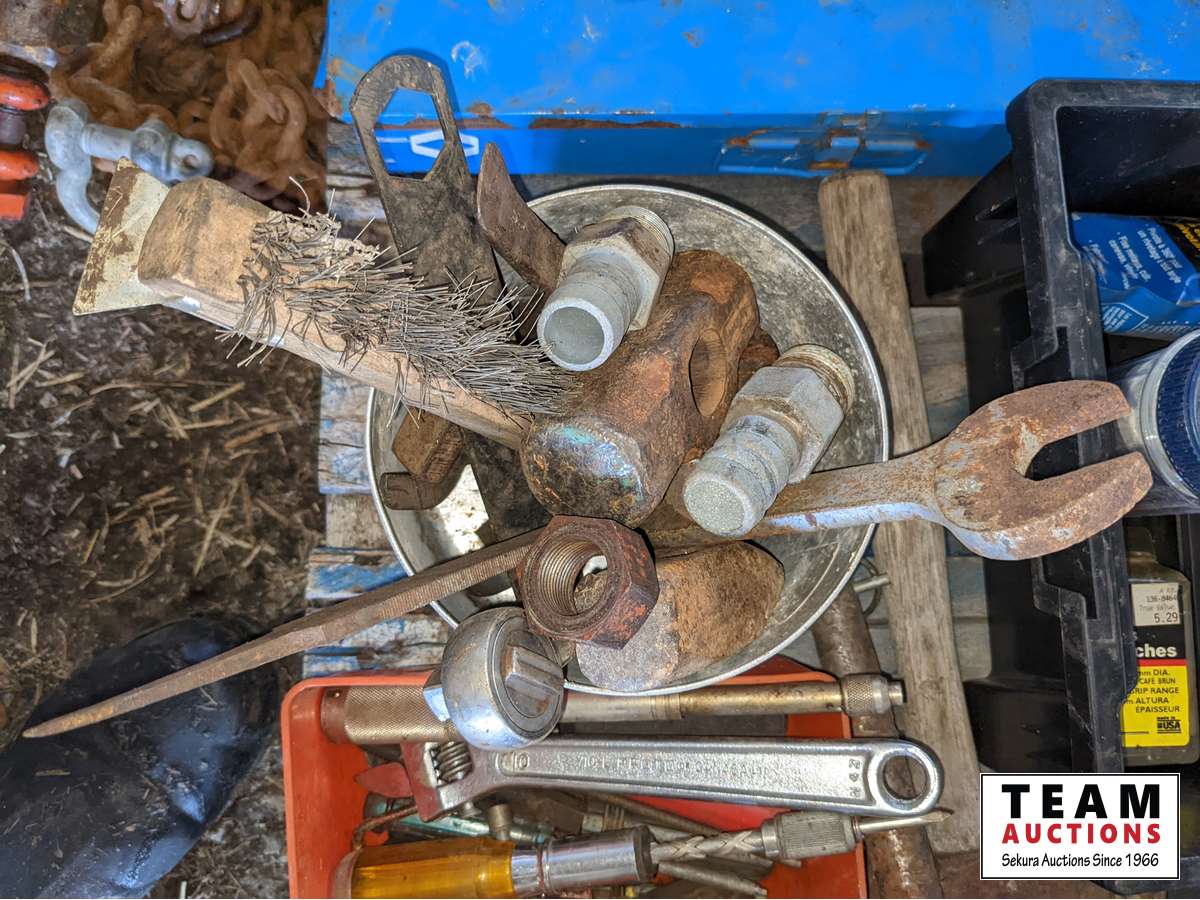 Chain hooks, files, shackles, hand tools, drill bits, Shop Built stool, miscellaneous hardware