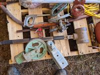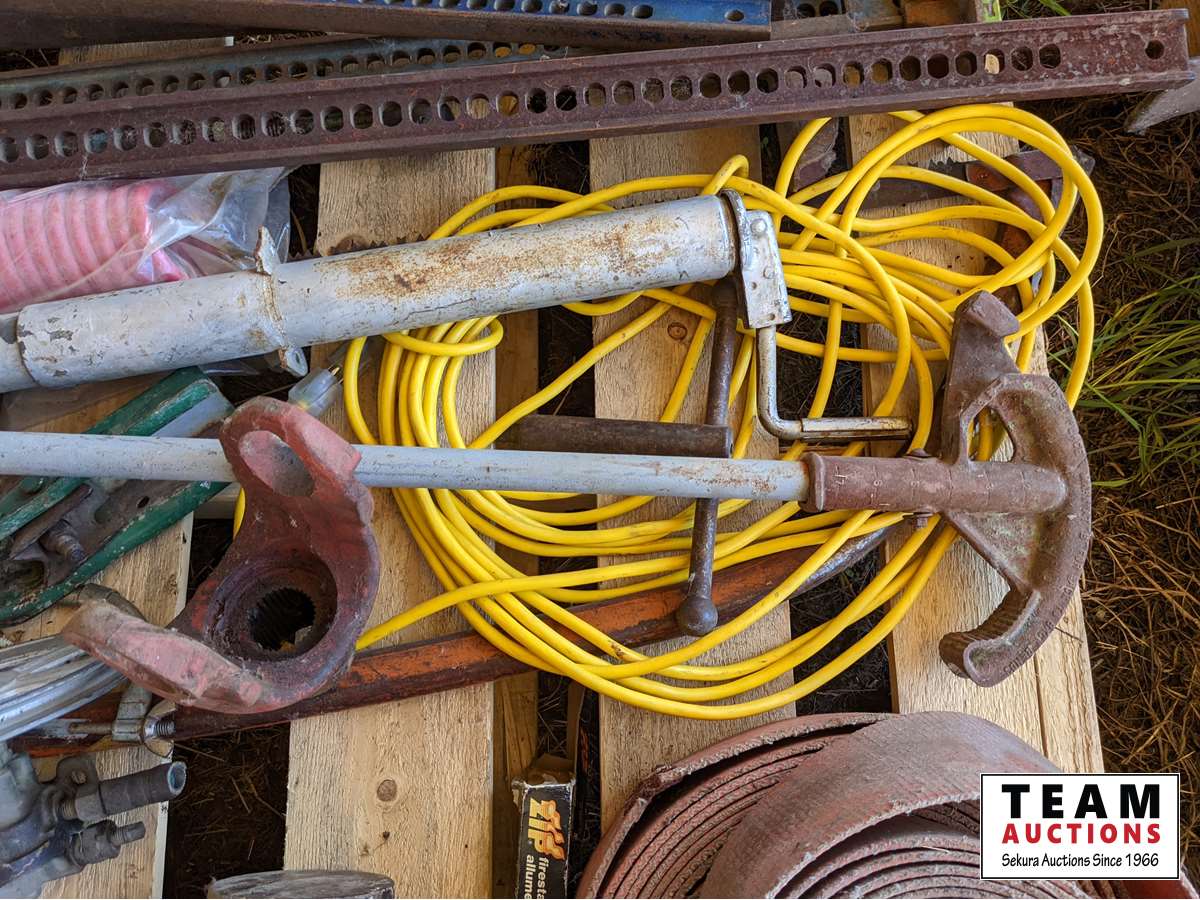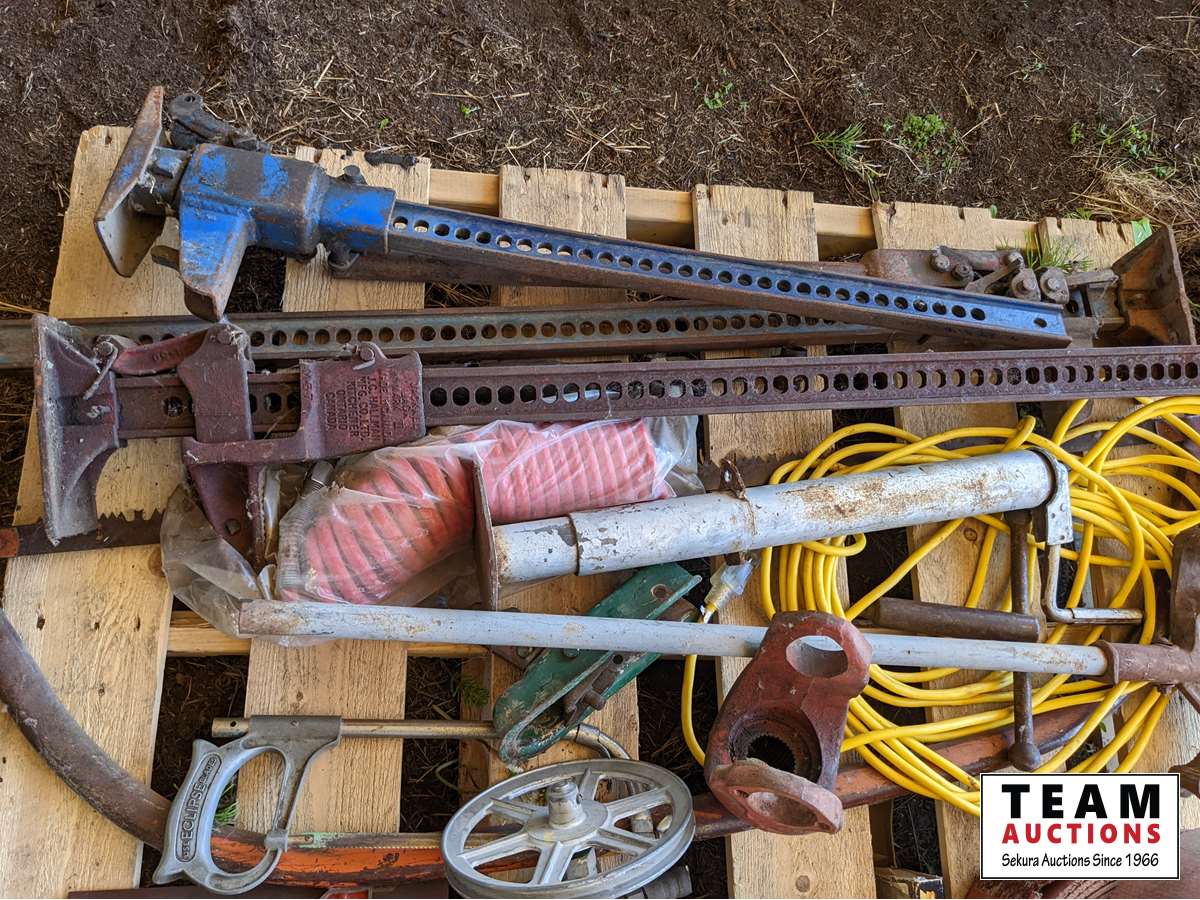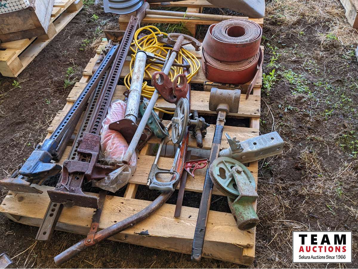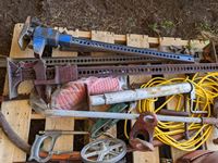 Jack all with extra parts, belting, cross cut saw, post maul, air hose, extension cord, miscellaneous items
