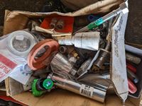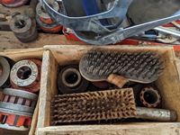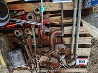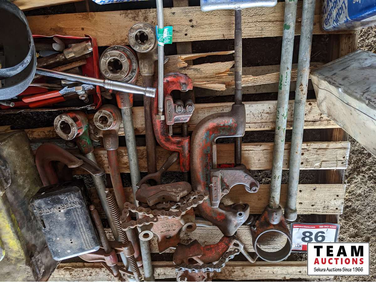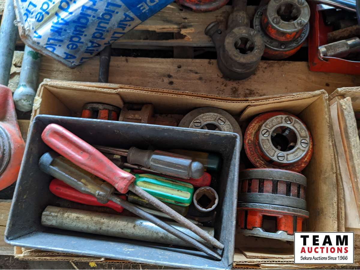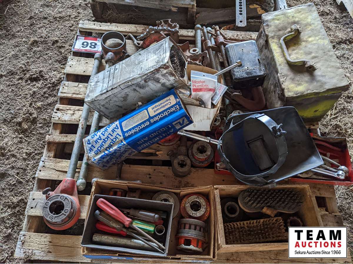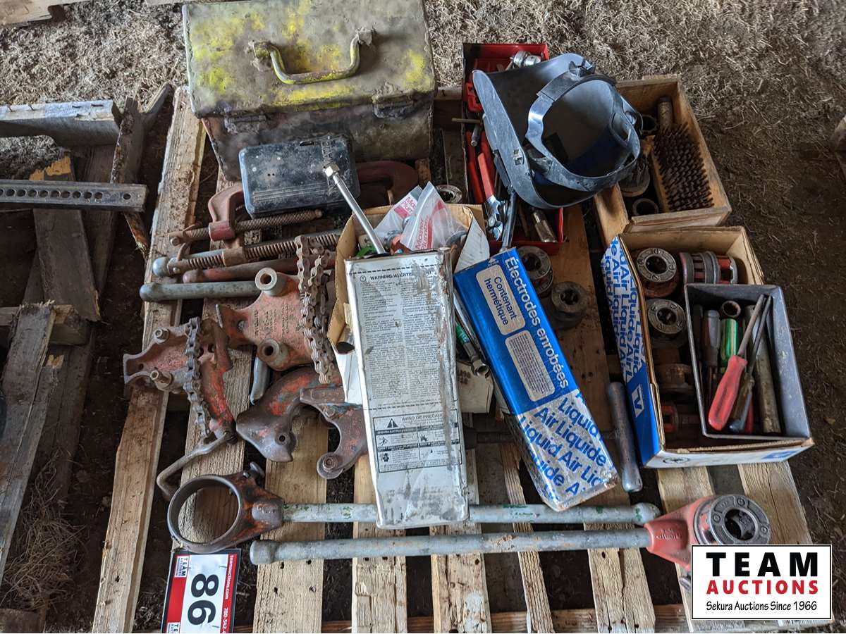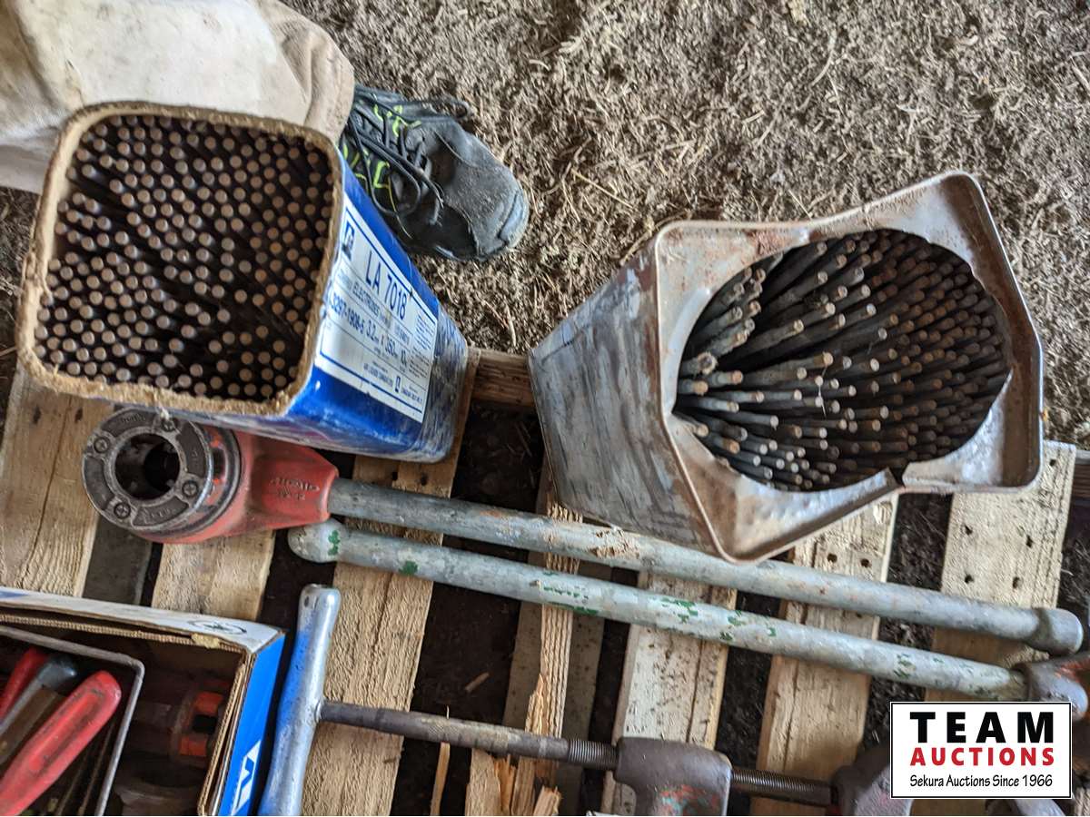 Welding rods, welding helmet, pipe dies with handles, pipe vise, miscellaneous
