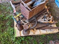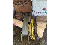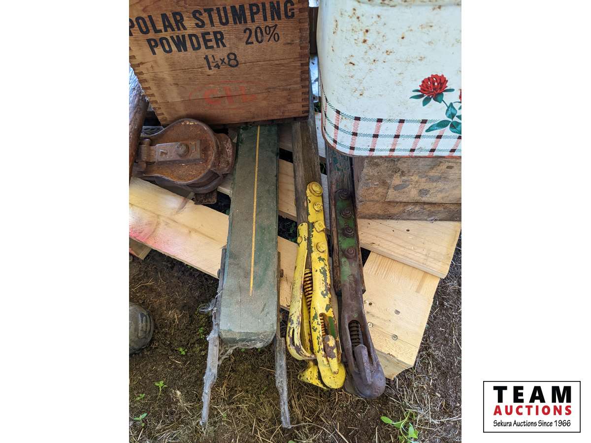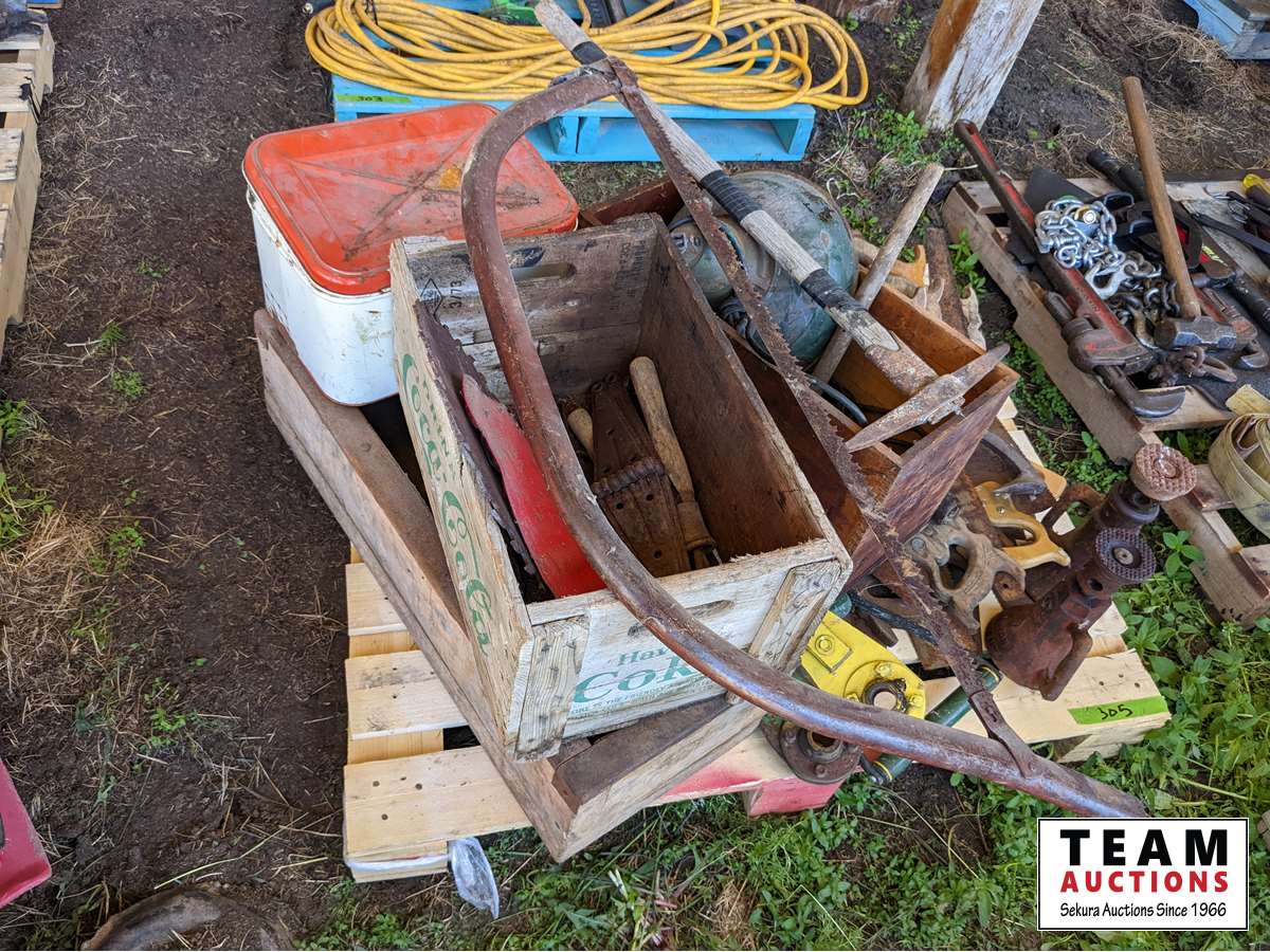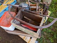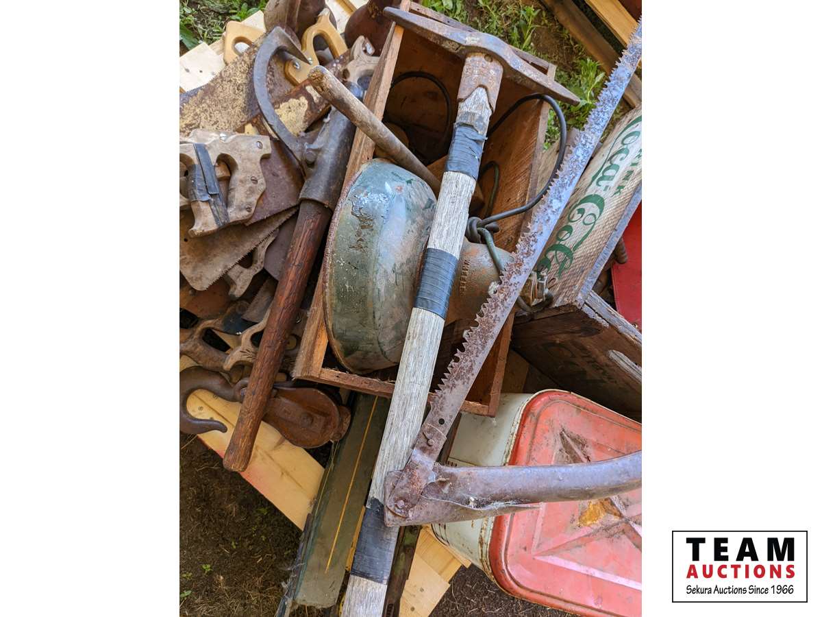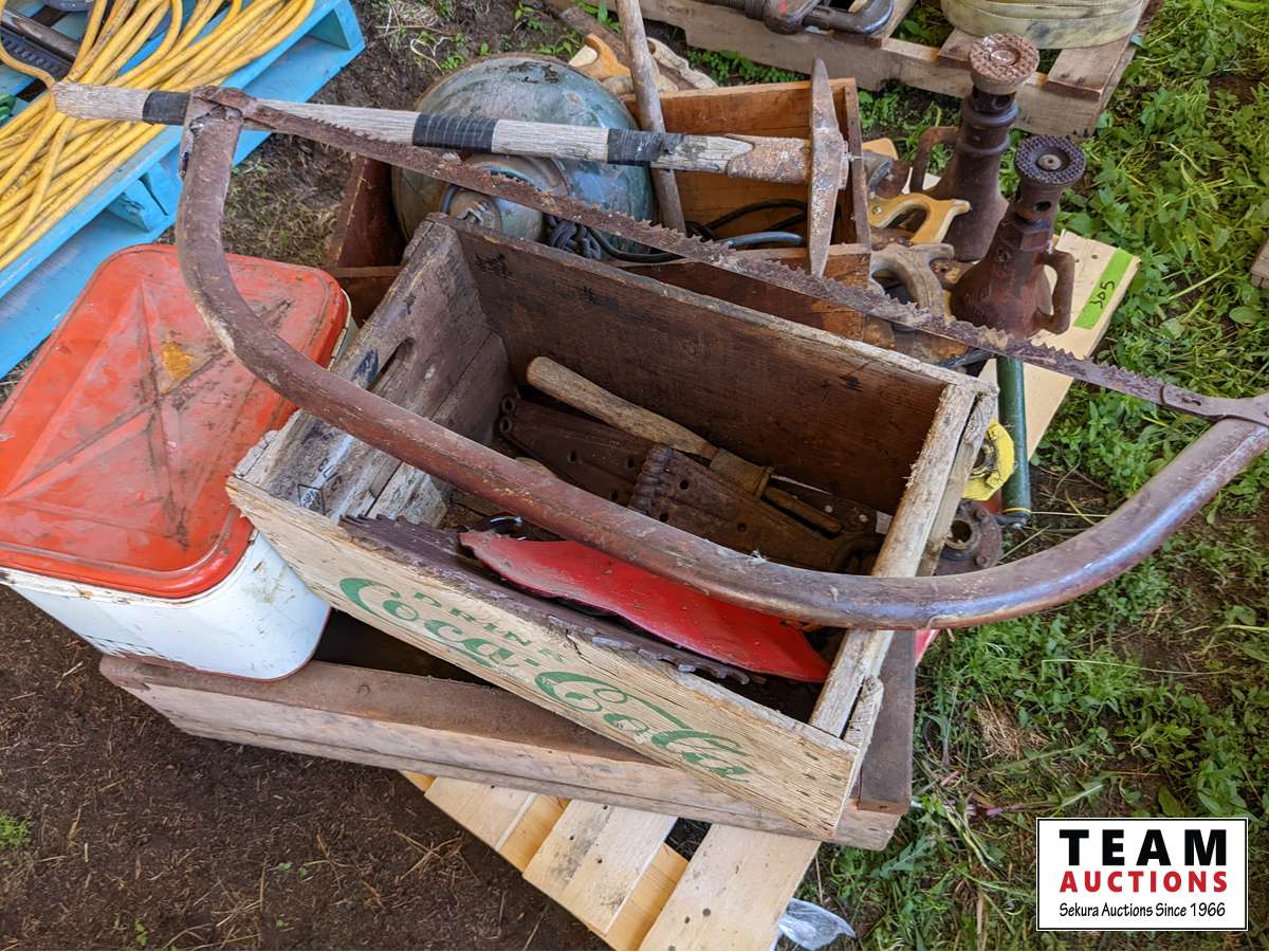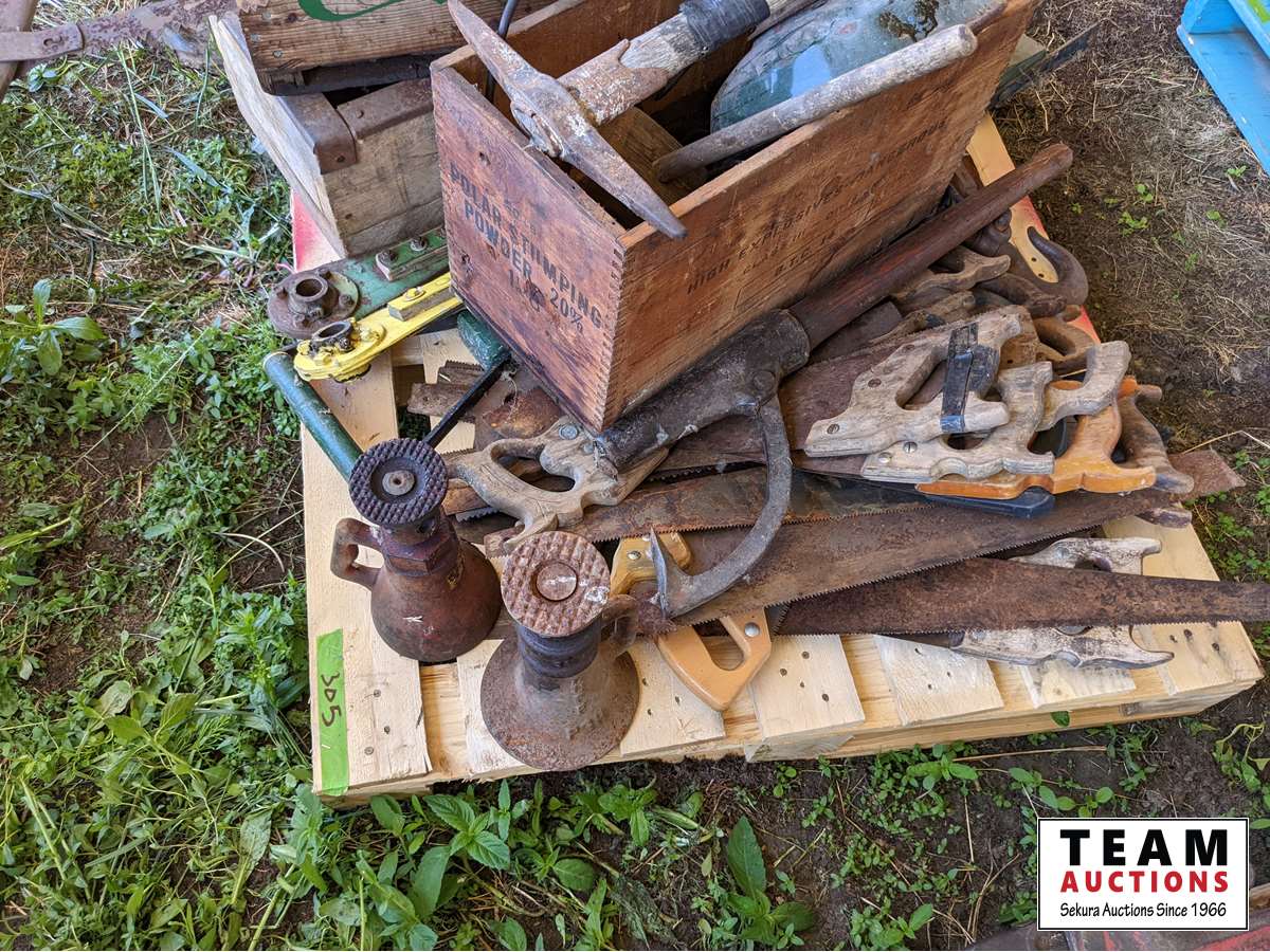 (2) screw jacks, saws, pic, wood boxes, miscellaneous items