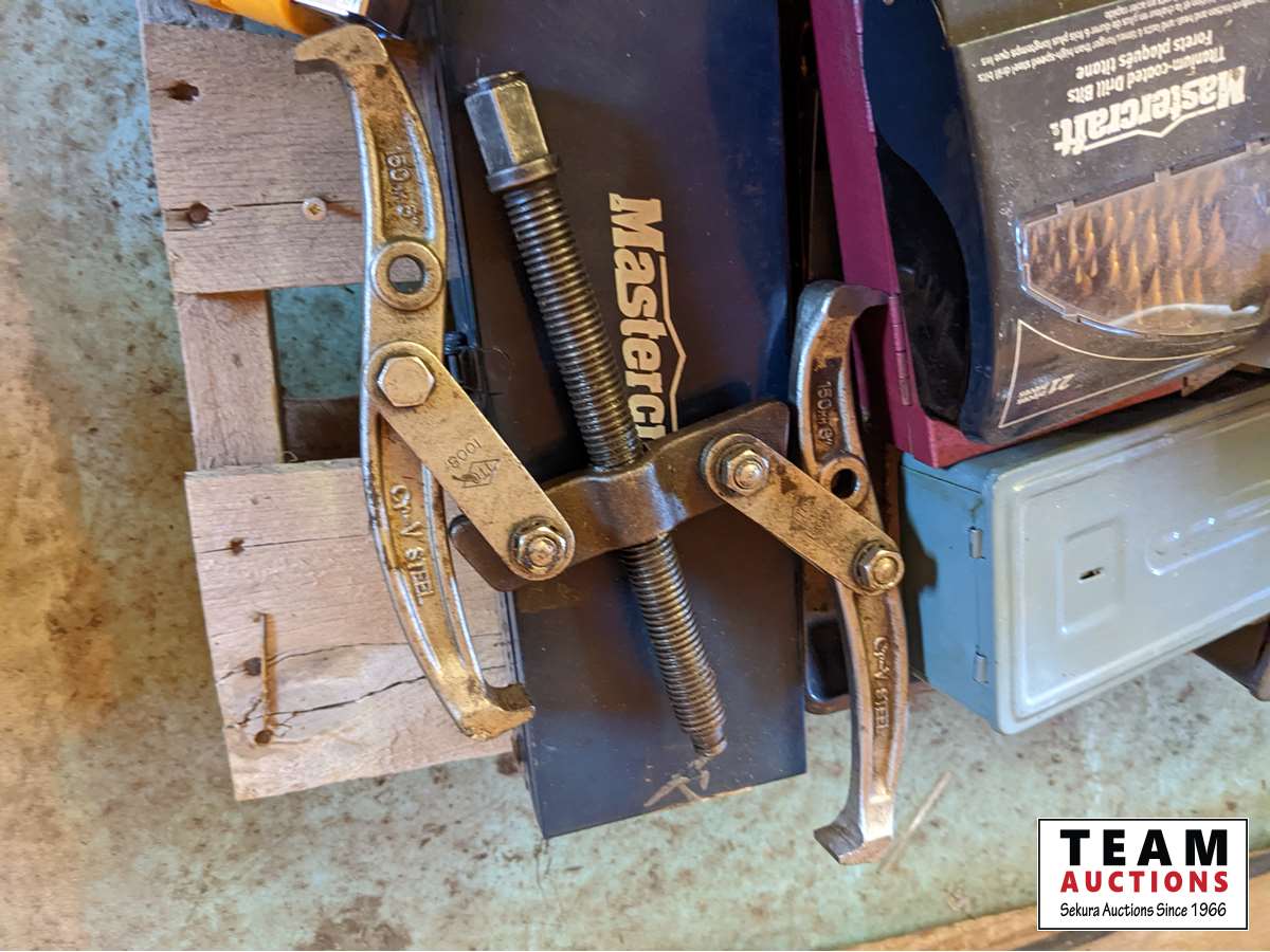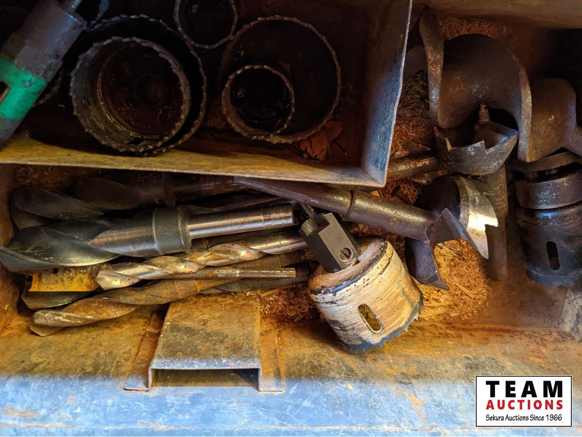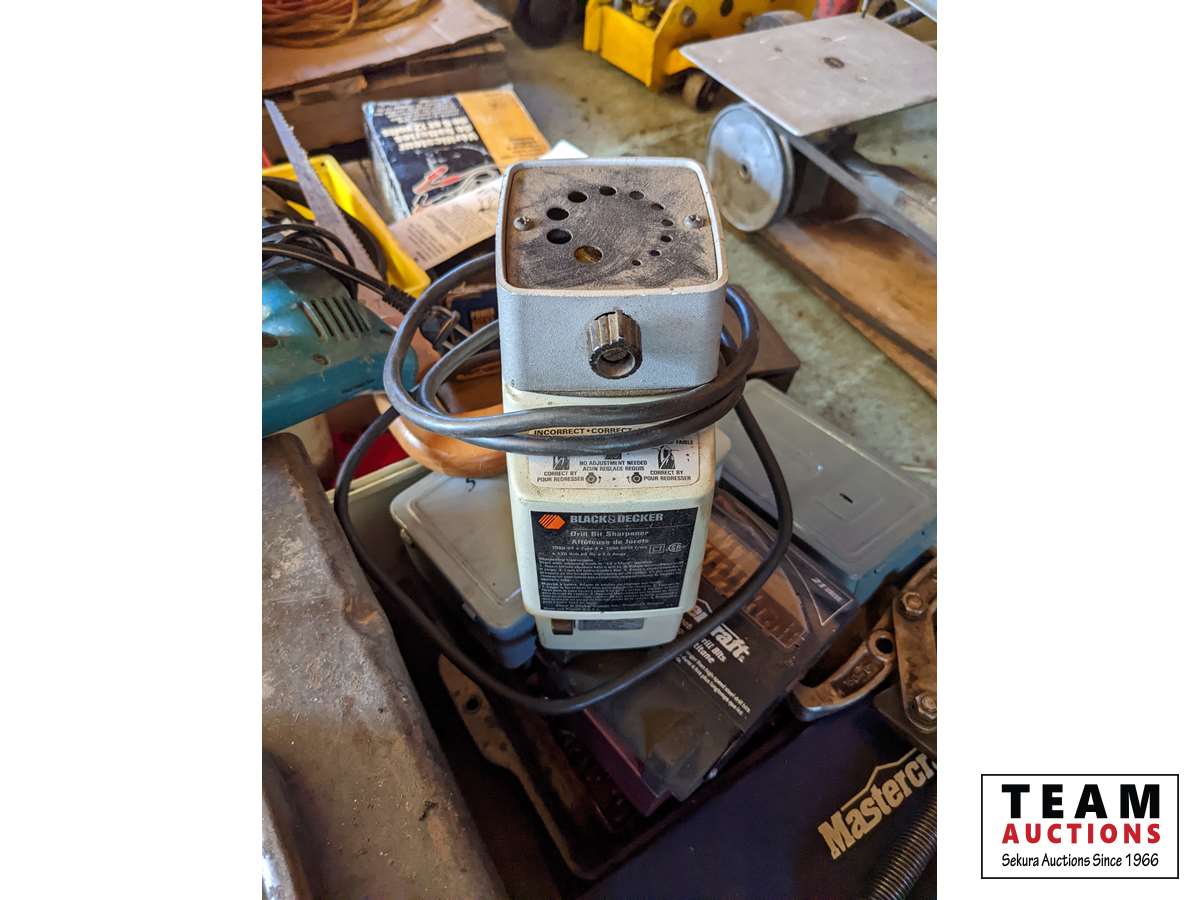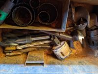 Qty of drill bits, battery load tester, tail pipe expanding tool, drill bit sharpener, miscellaneous tools