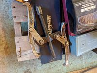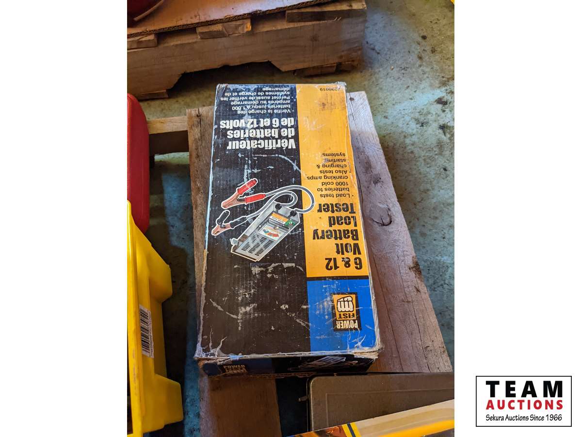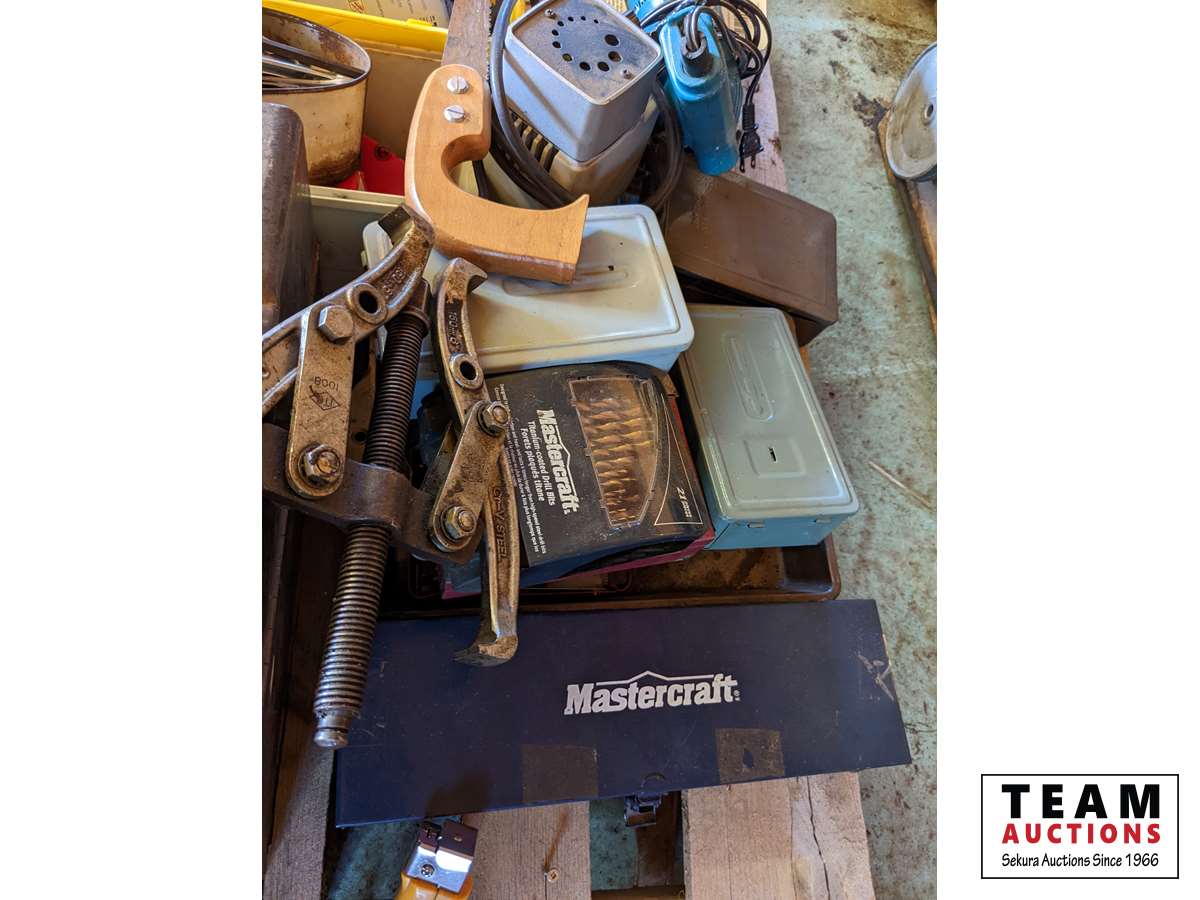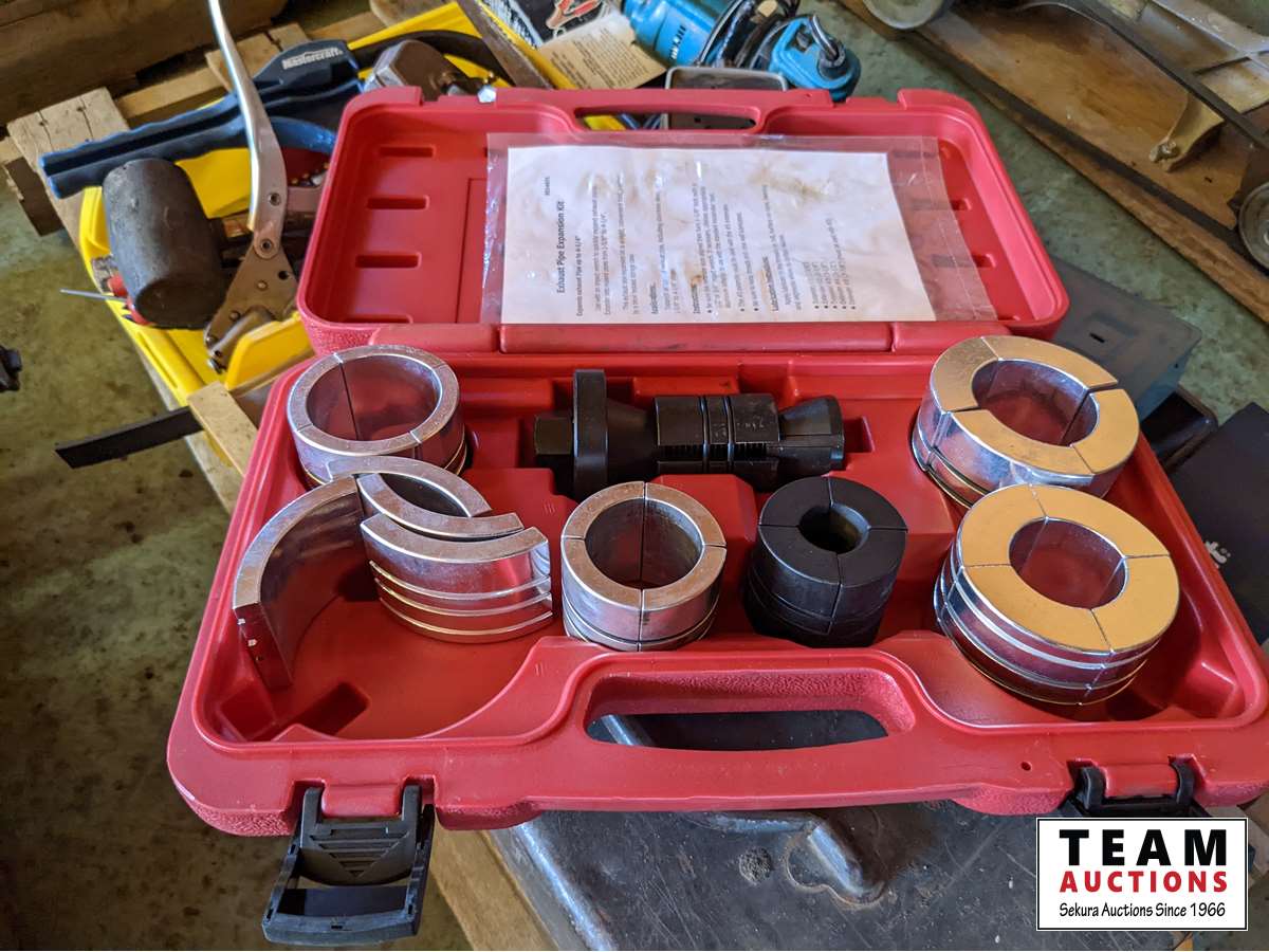 Qty of drill bits, battery load tester, tail pipe expanding tool, drill bit sharpener, miscellaneous tools