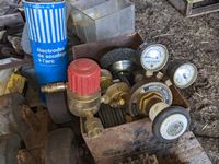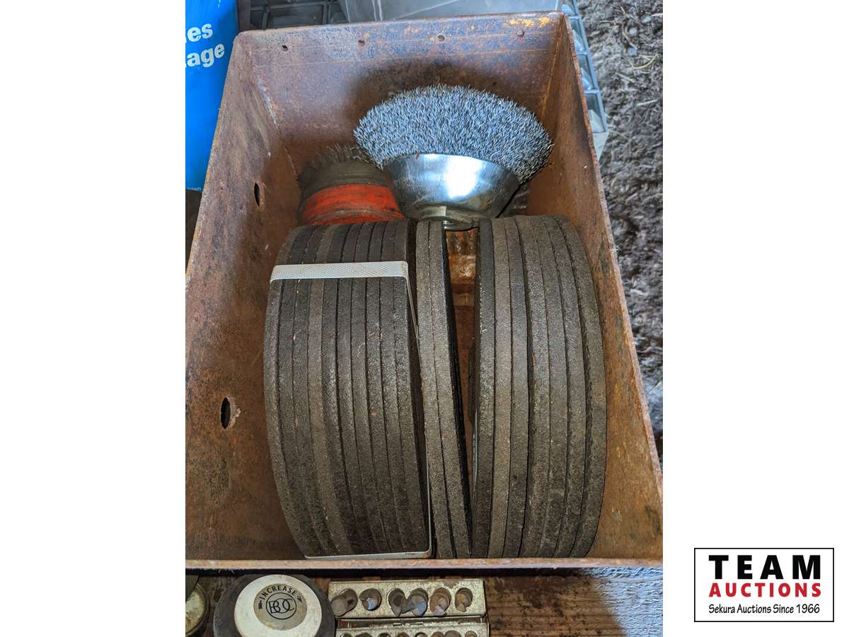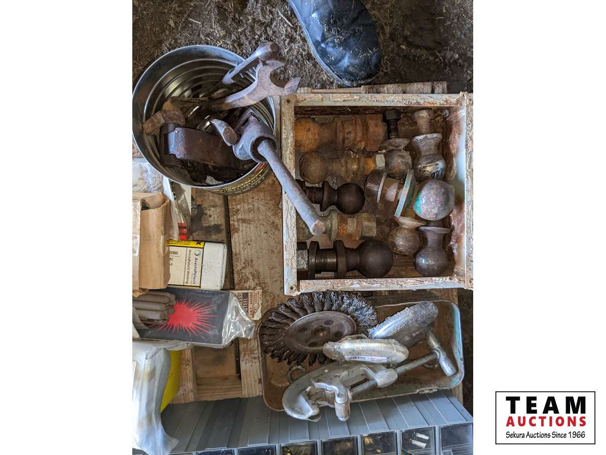 Grinding Discs, drill bits, welding rod, Oxy/ Acet gauges, cabinet with hardware, 12 inch grinding stone, trailer hitch balls, miscellaneous welding items