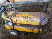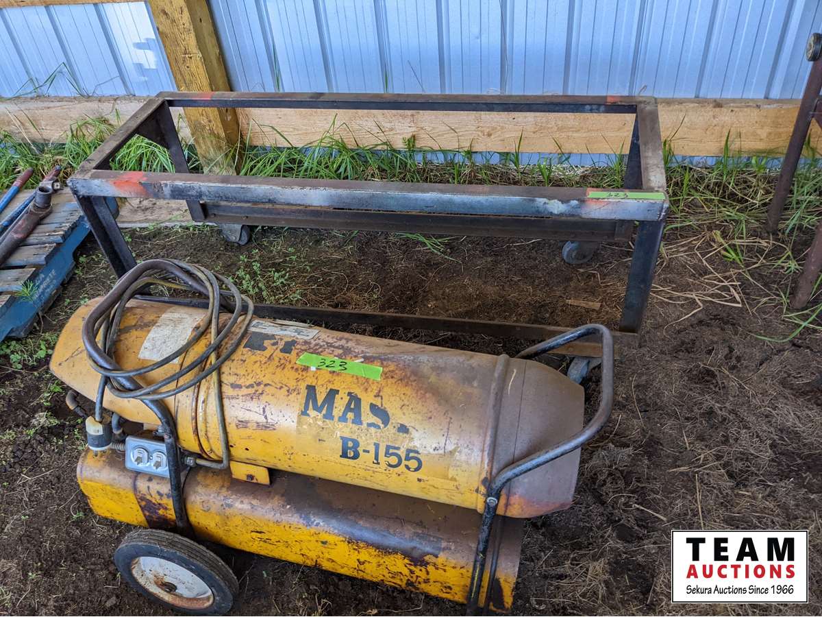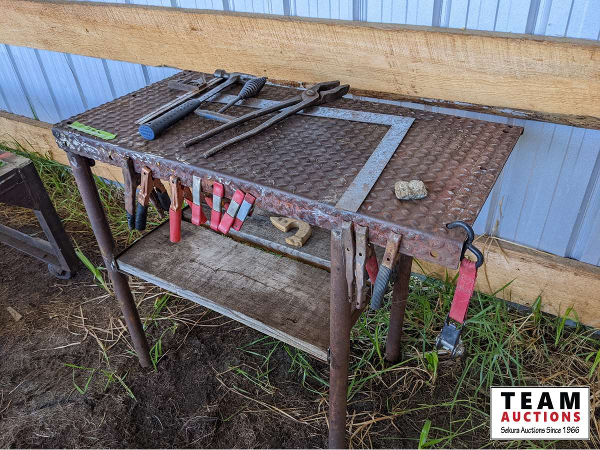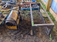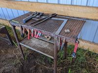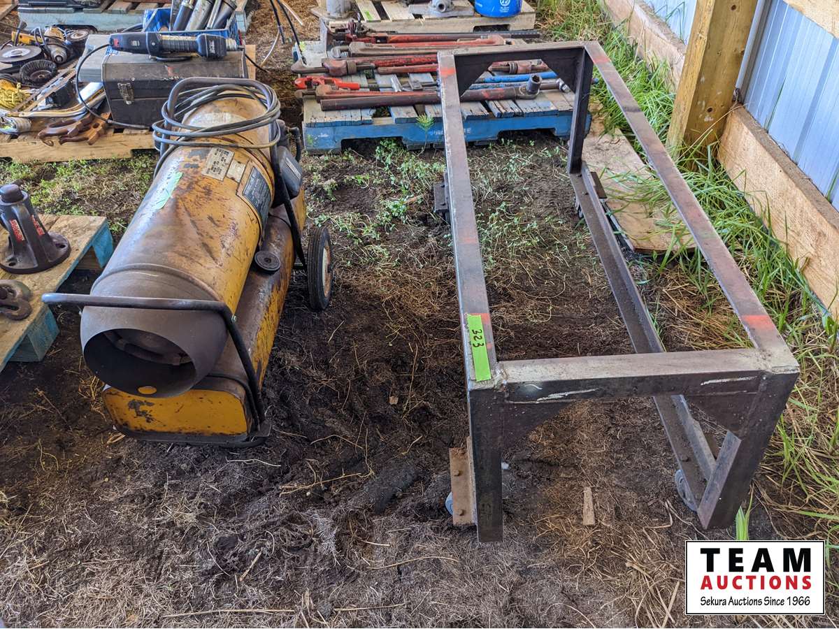 Diesel heater, metal frame on castors 21 inch wide X 24 inch high X 60 inch long, small metal work bench, miscellaneous hand tools