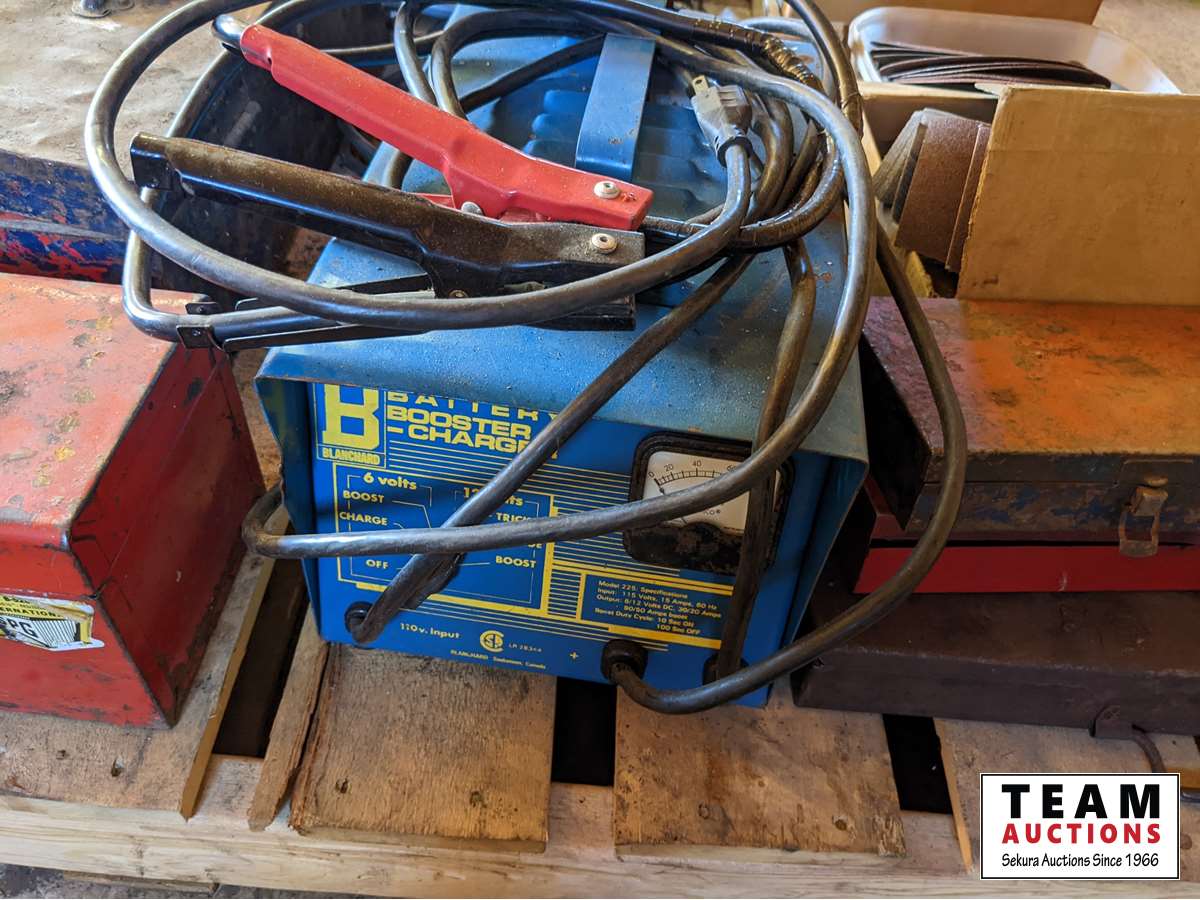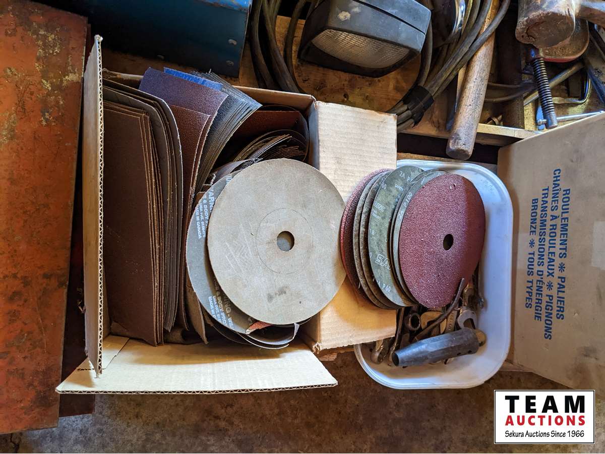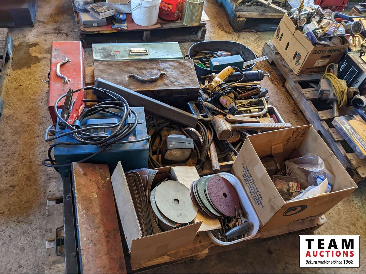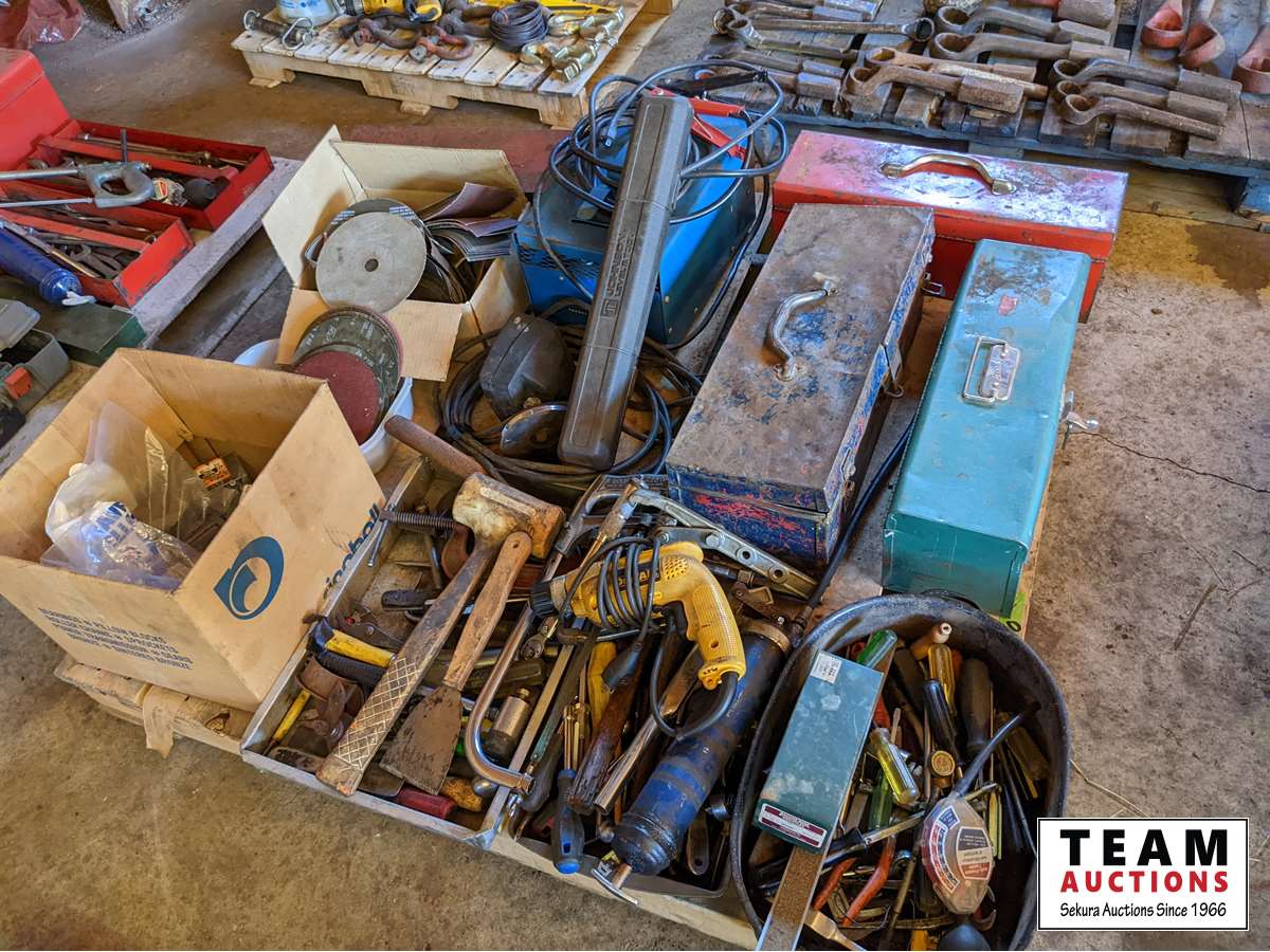 (3) tool boxes with miscellaneous tools, battery charger, drills, grease gun, sand paper, number stamp set, miscellaneous