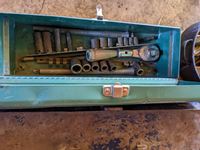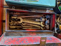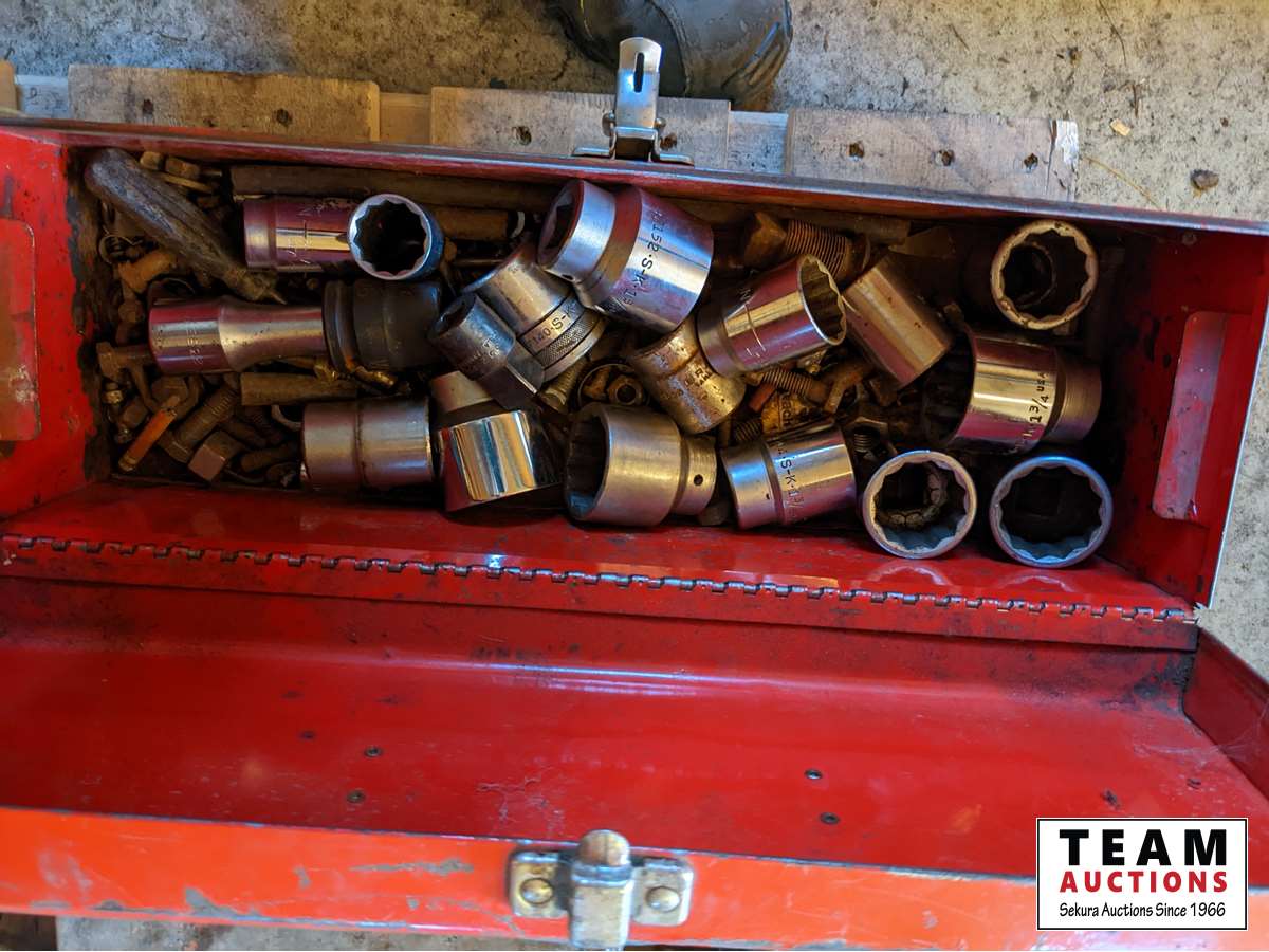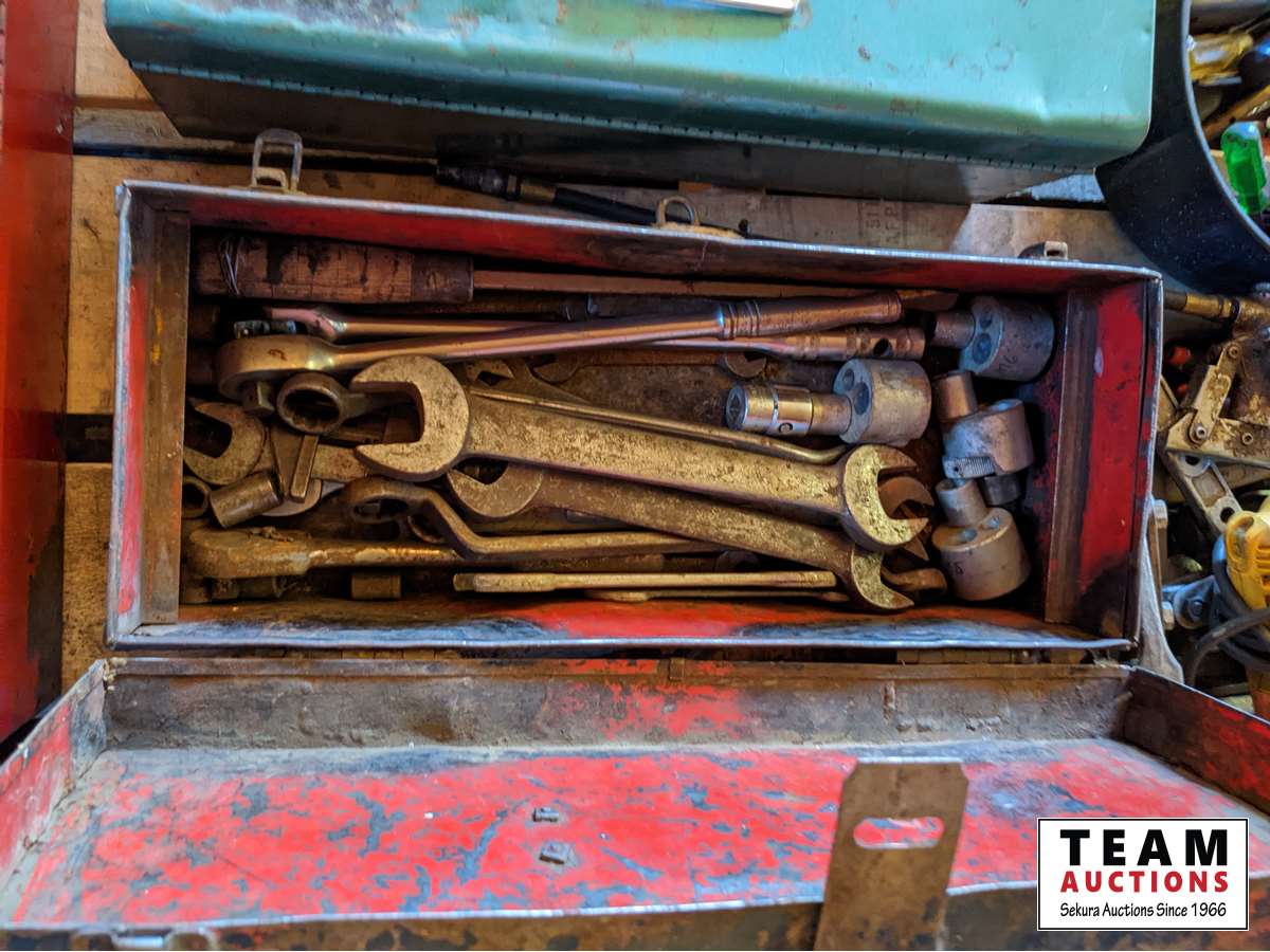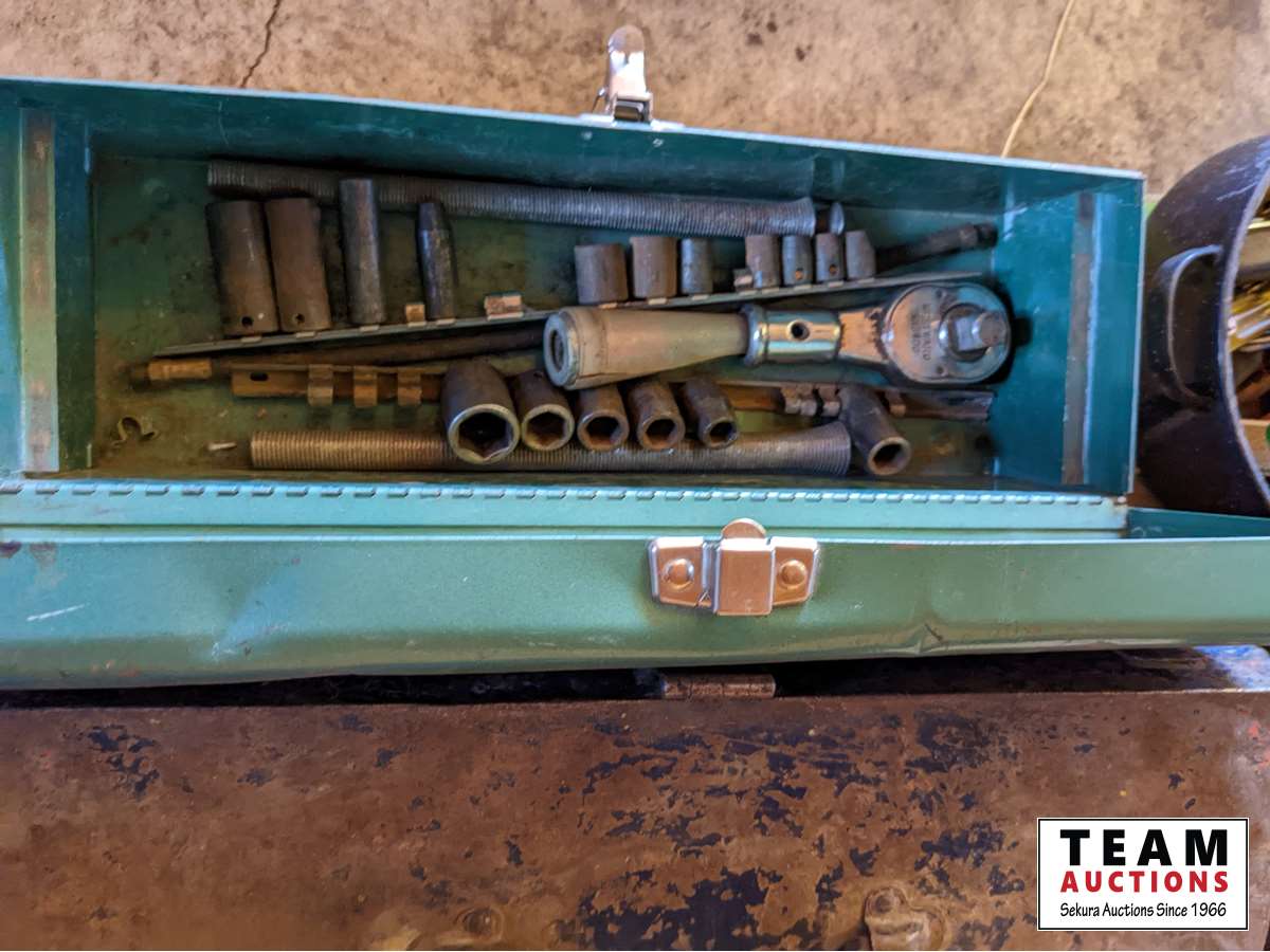 (3) tool boxes with miscellaneous tools, battery charger, drills, grease gun, sand paper, number stamp set, miscellaneous