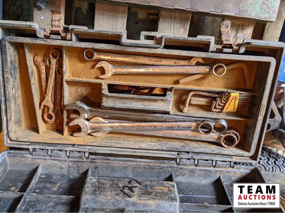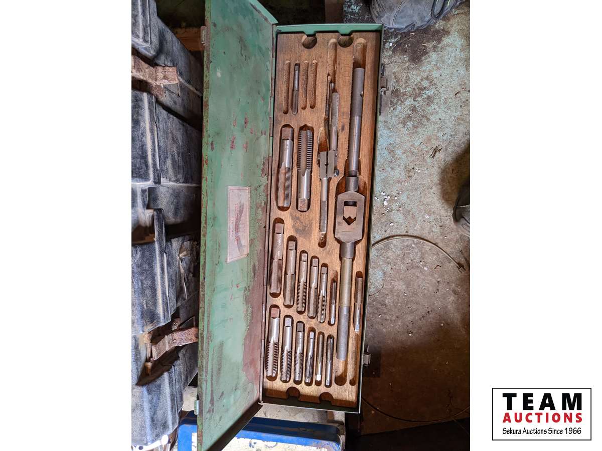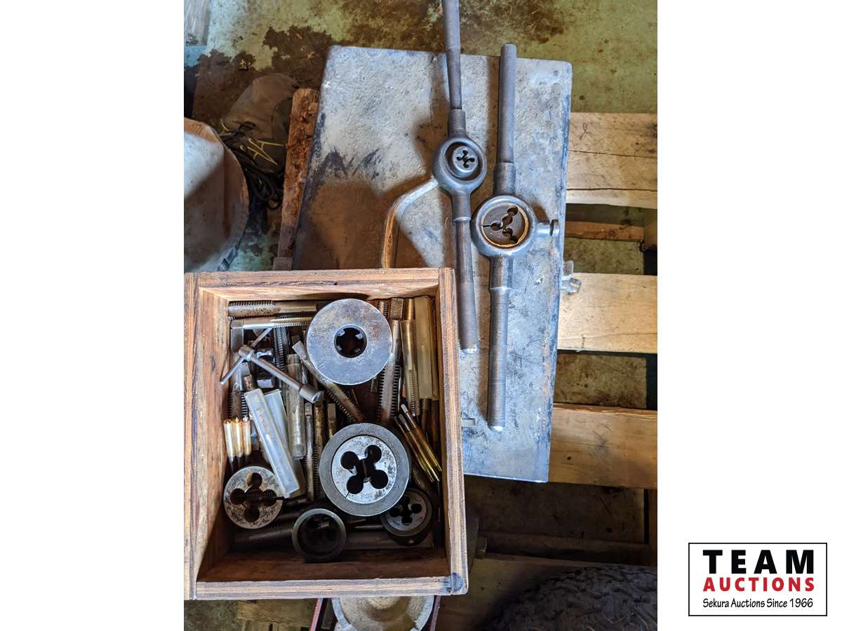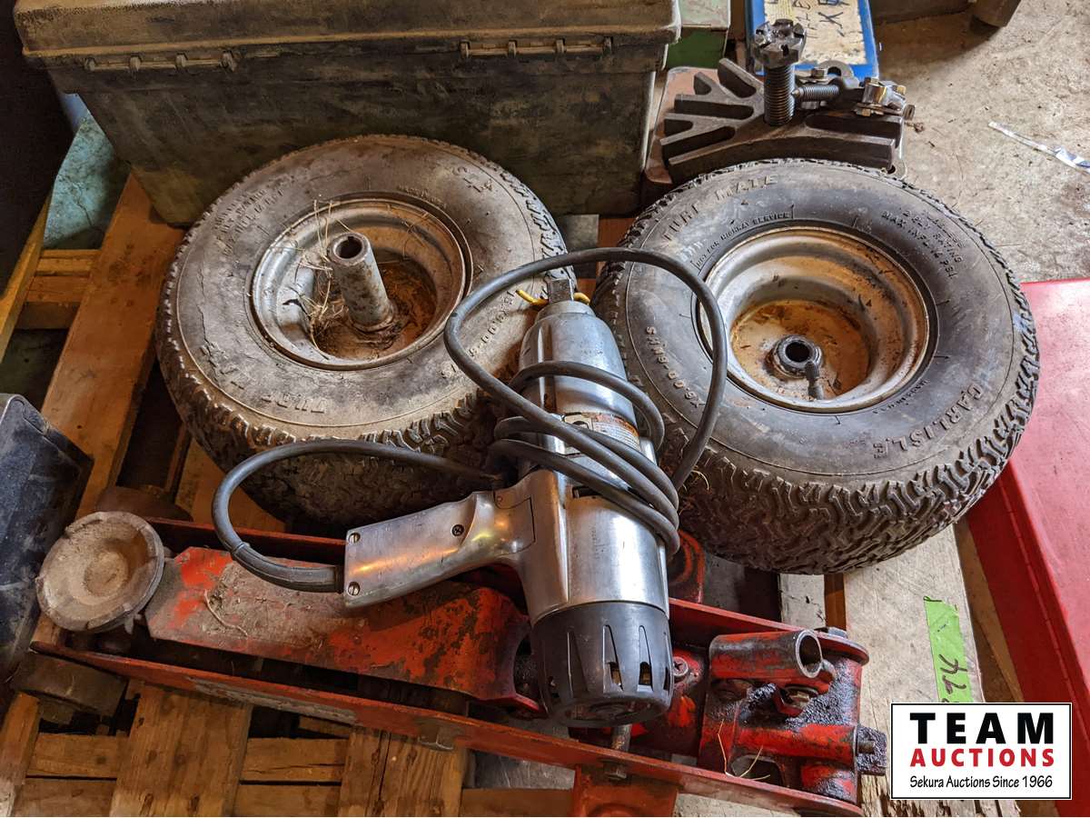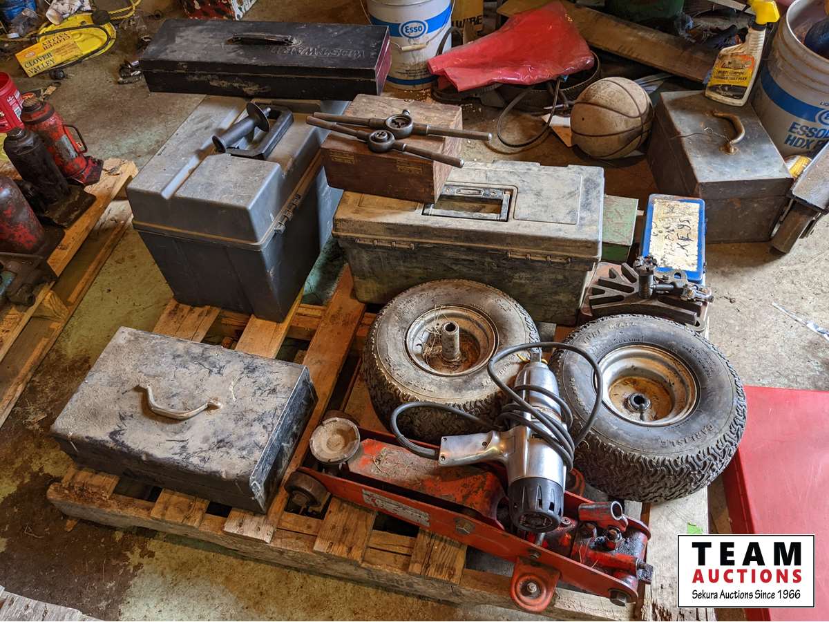 Small floor jack, (2) small cart wheels, 3/4 ft electric impact, wrenches, pullers, (2) tool boxes with tools, Allen wrenches, (2) Tap & Die sets, miscellaneous tools