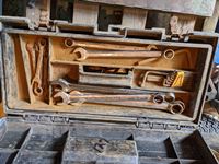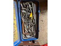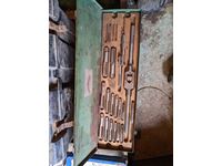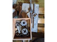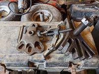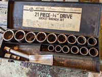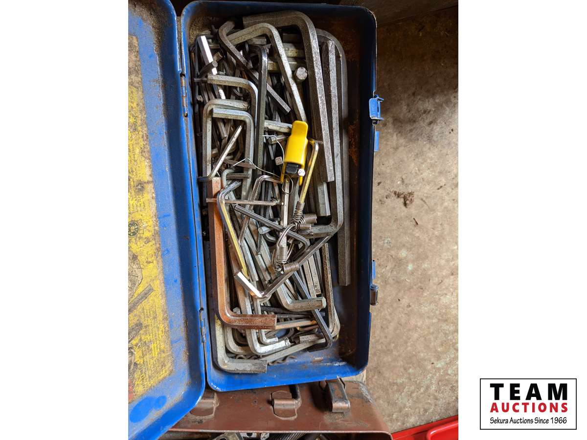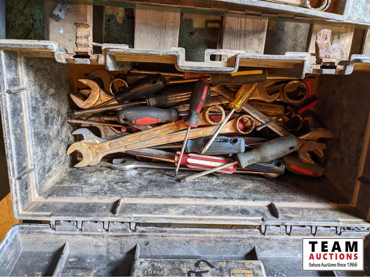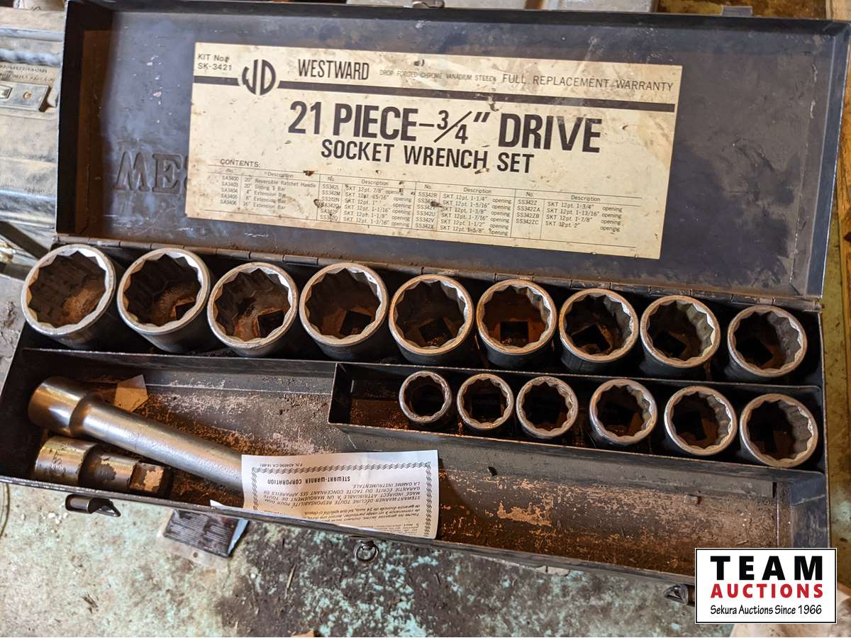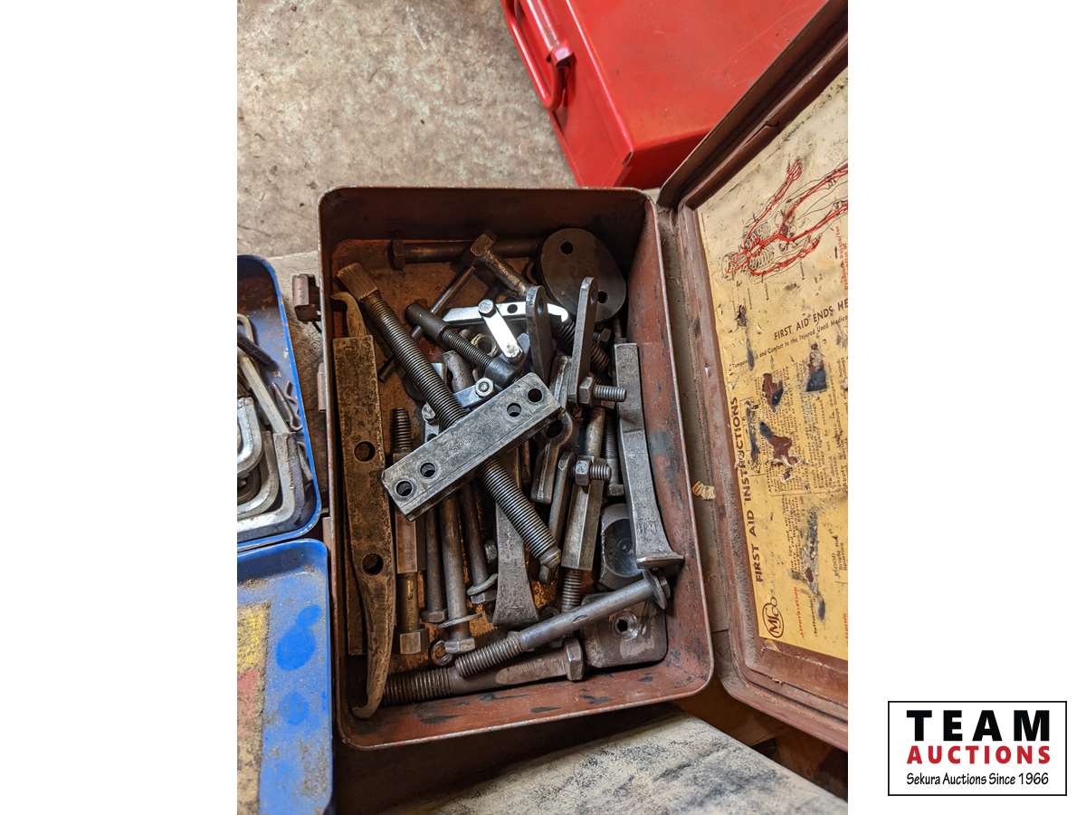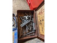 Small floor jack, (2) small cart wheels, 3/4 ft electric impact, wrenches, pullers, (2) tool boxes with tools, Allen wrenches, (2) Tap & Die sets, miscellaneous tools