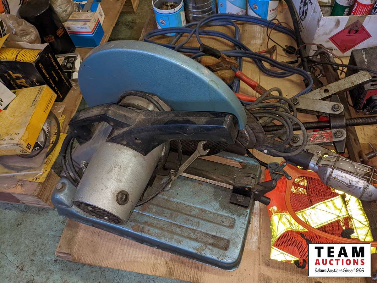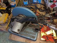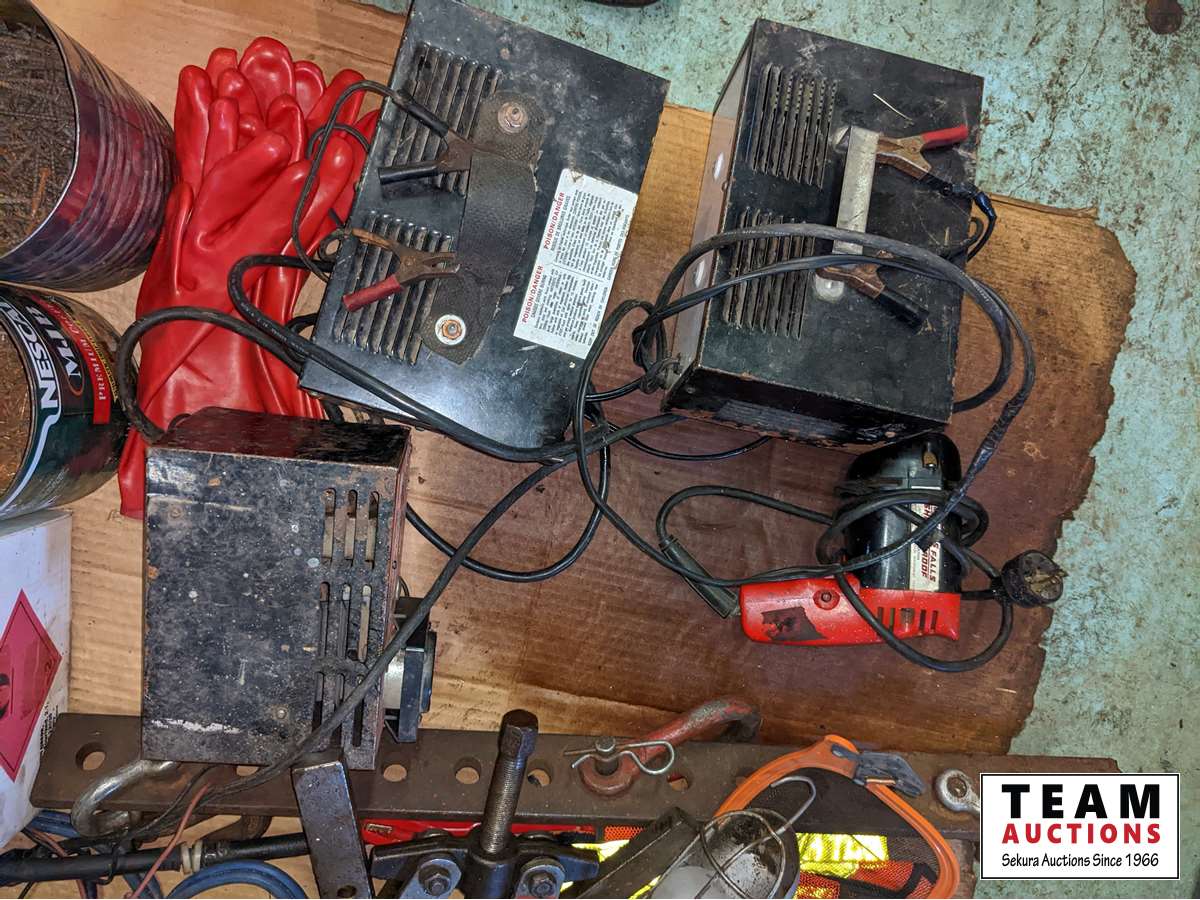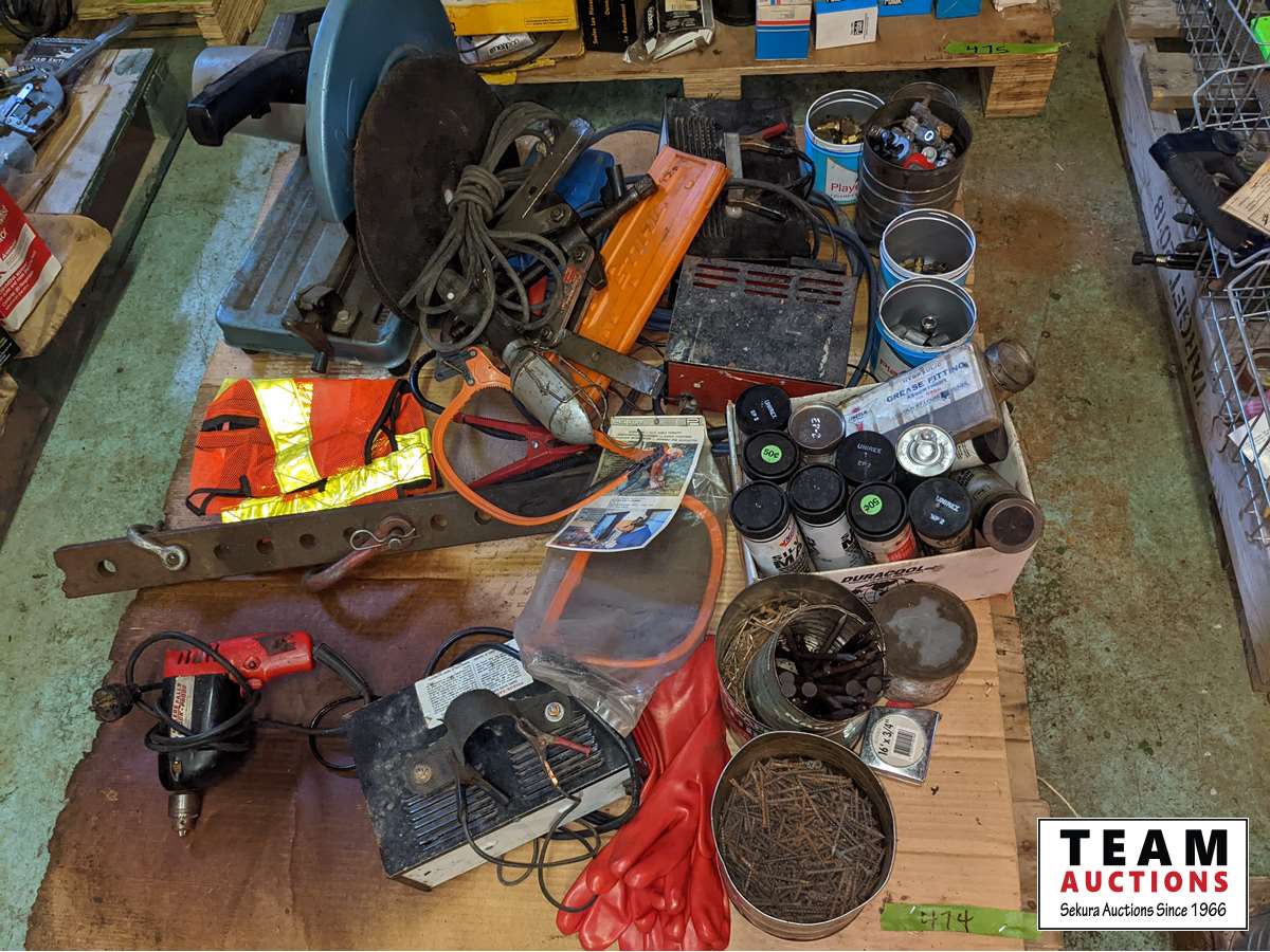 Grease tubes, (3) small chargers, drill, trouble light, hardware, 14 inch chop saw, miscellaneous items