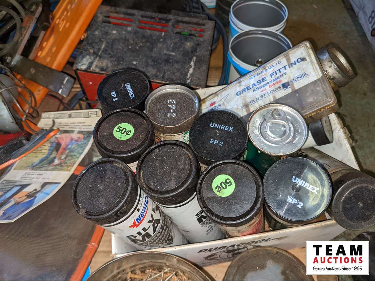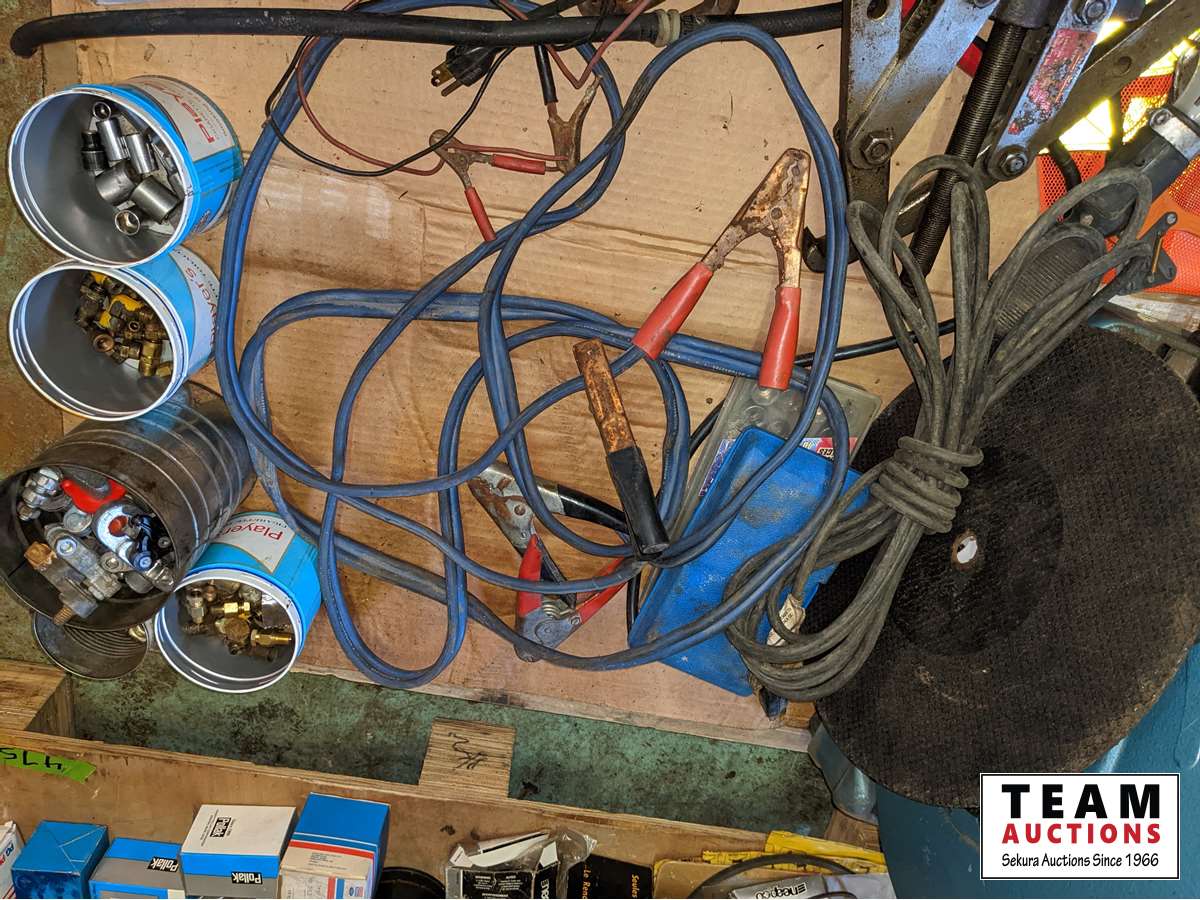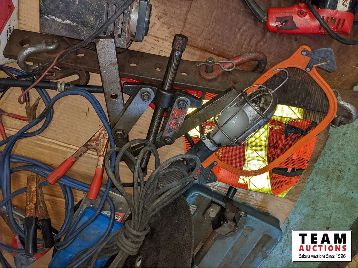 Grease tubes, (3) small chargers, drill, trouble light, hardware, 14 inch chop saw, miscellaneous items