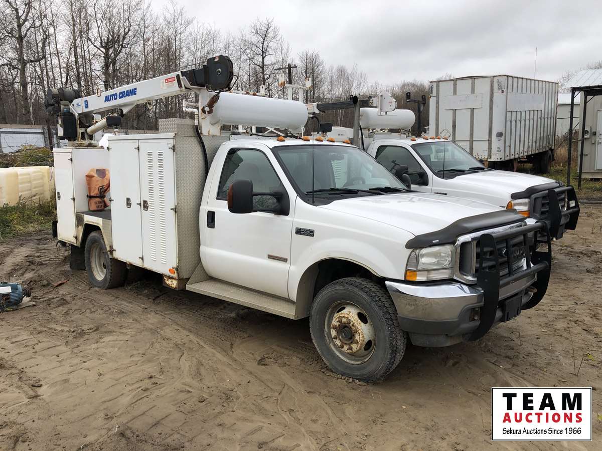 Power Stroke V8 turbo diesel engine, 6 speed manual transmission, P/W, P/L, A/C, Auto Crane 5005EH, air tank, vise, welding reels, Thermo under hood compressor on engine, heated tool box, 19.5 inch tires