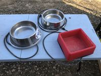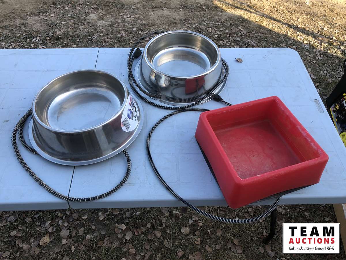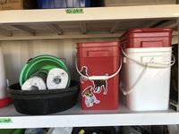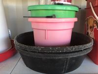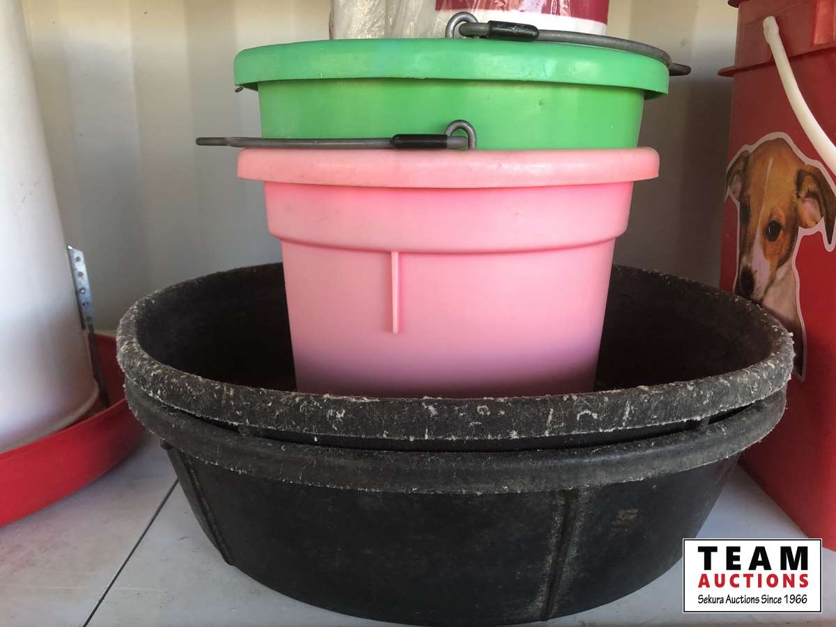 (3) pails, (2) rubber feed bowls, (2) feed buckets, (3) heated water bowls, (2) chicken feeders, heat lamps, miscellaneous