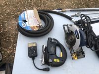 Circular saw with no charger, corded jig saw, corded circular saw, 3/4 inch 15 ft arctic fuel hose, air hose lazer tripod