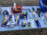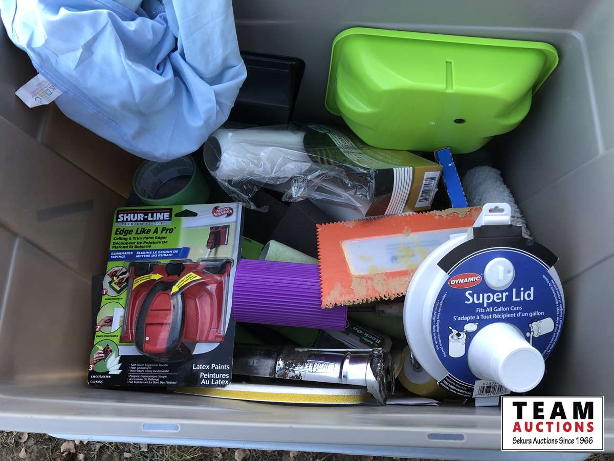 Painting supplies, miscellaneous garden items, rolling tool box, Gerry can replacement nozzles, miscellaneous tools