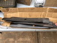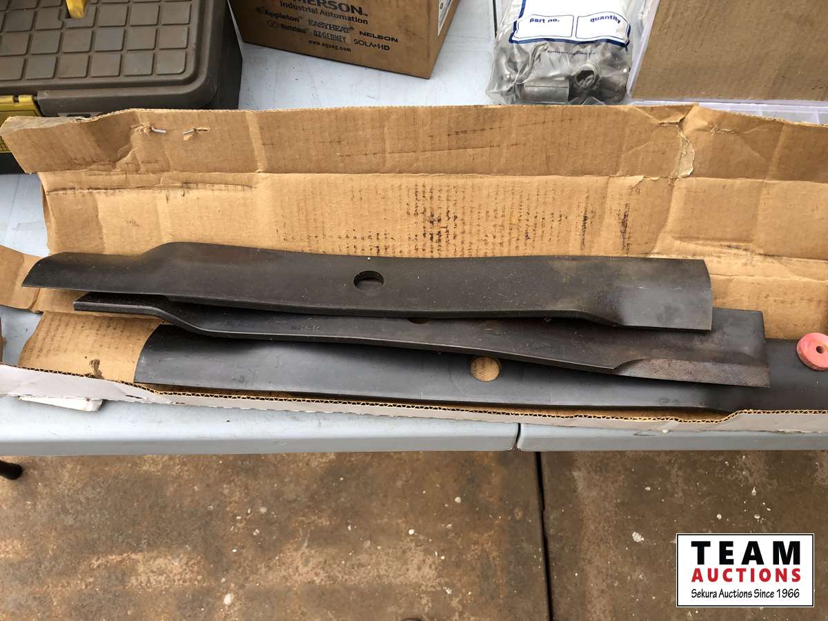 (2) bins of bolts, (3) new 21 inch lawnmower blades, cable connectors, miscellaneous electrical parts & hardware