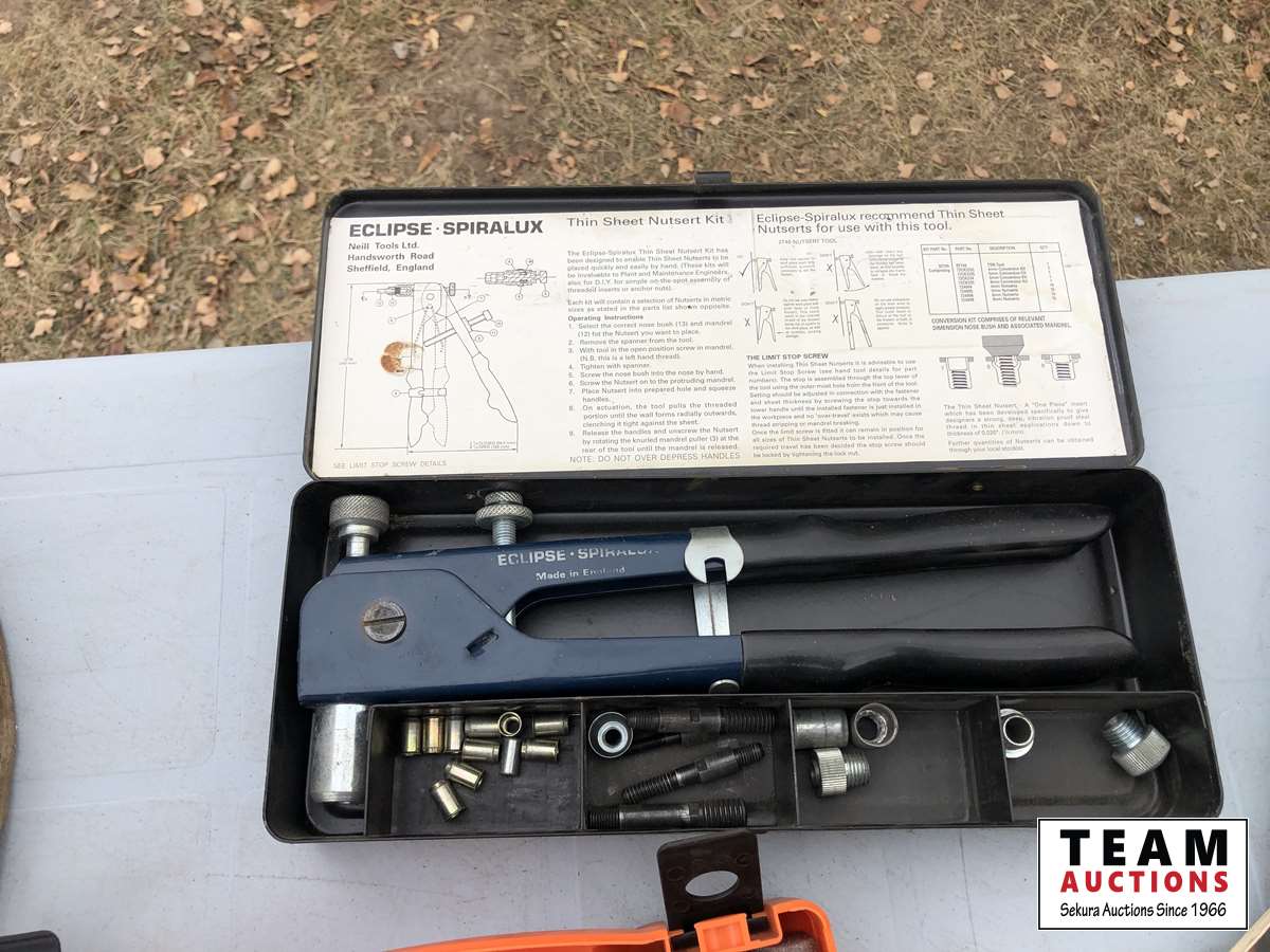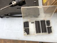 (2) tool kits, box of miscellaneous electrical items, brass fittings, allan bolt kit, grease zerk kit, wire crimper, insert nuts, roll of wire, shrink tube kit, cable connector