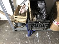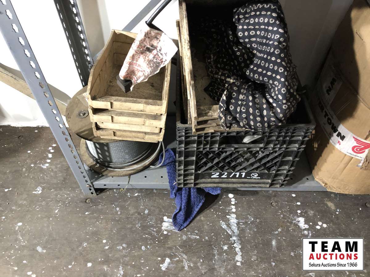 Shelf unit, roll of fire blanket material, tap & die set, set of Philips machine screws, drill bits, (2) Makita angle grinders, Hitachi angle grinder, air angle grinder, (2) slides for tool box, roll of 3/16 inch cable, storage bins, flood lights, grease zerk kit, miscellaneous items