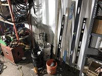 Various pieces of aluminum flat plate, (3) levels, (2) 48 inch & 72 inch, Snap-on air impact, (2) buckets of miscellaneous tools, (2) pieces of expanded metal