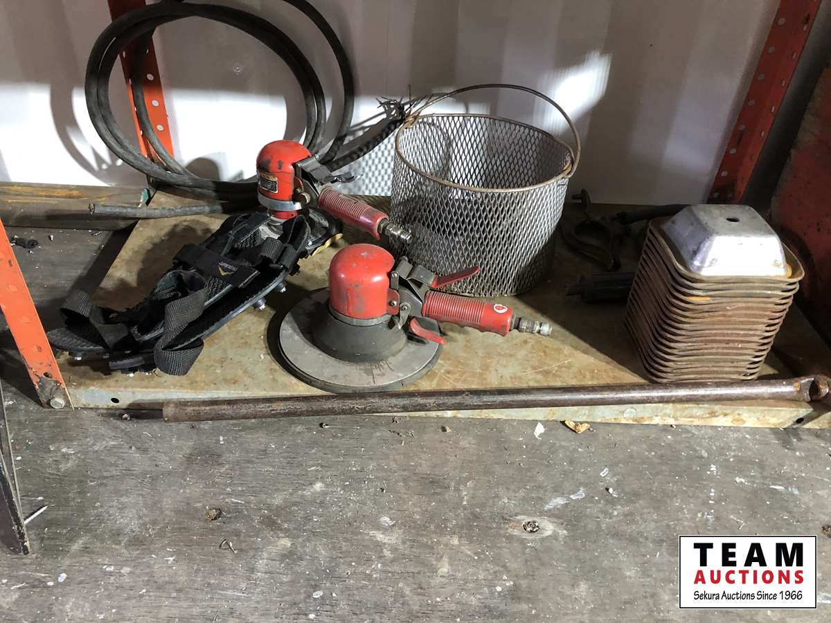 Shelf unit, air sander, levels, squares, hoses, welding mask, miscellaneous bolts, air reel, drill press vise, drill bits, (2) trouble lights, double piston straight line, Makita angle grinder, other miscellaneous items