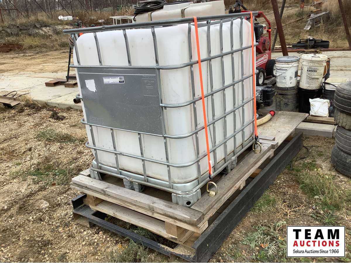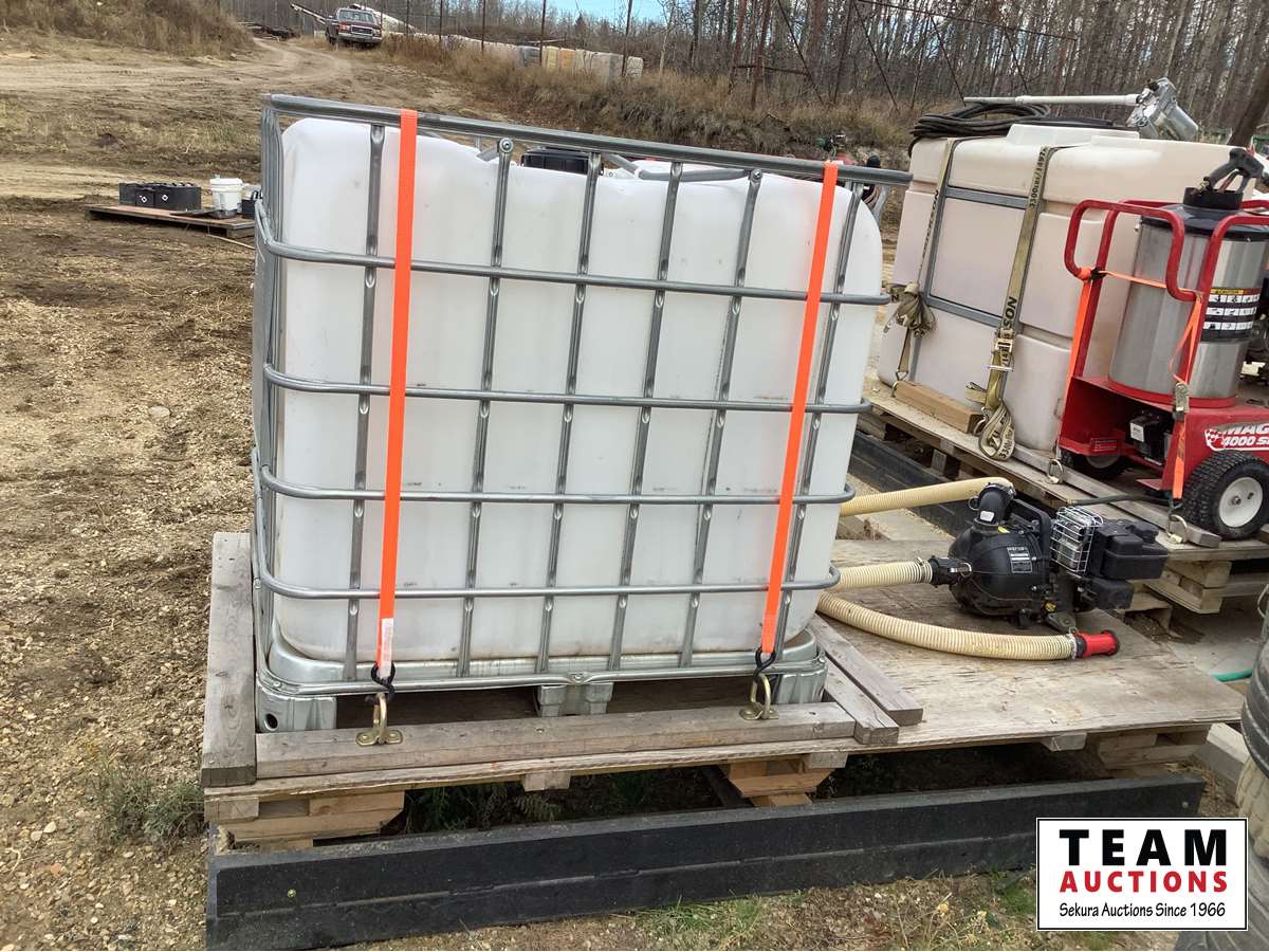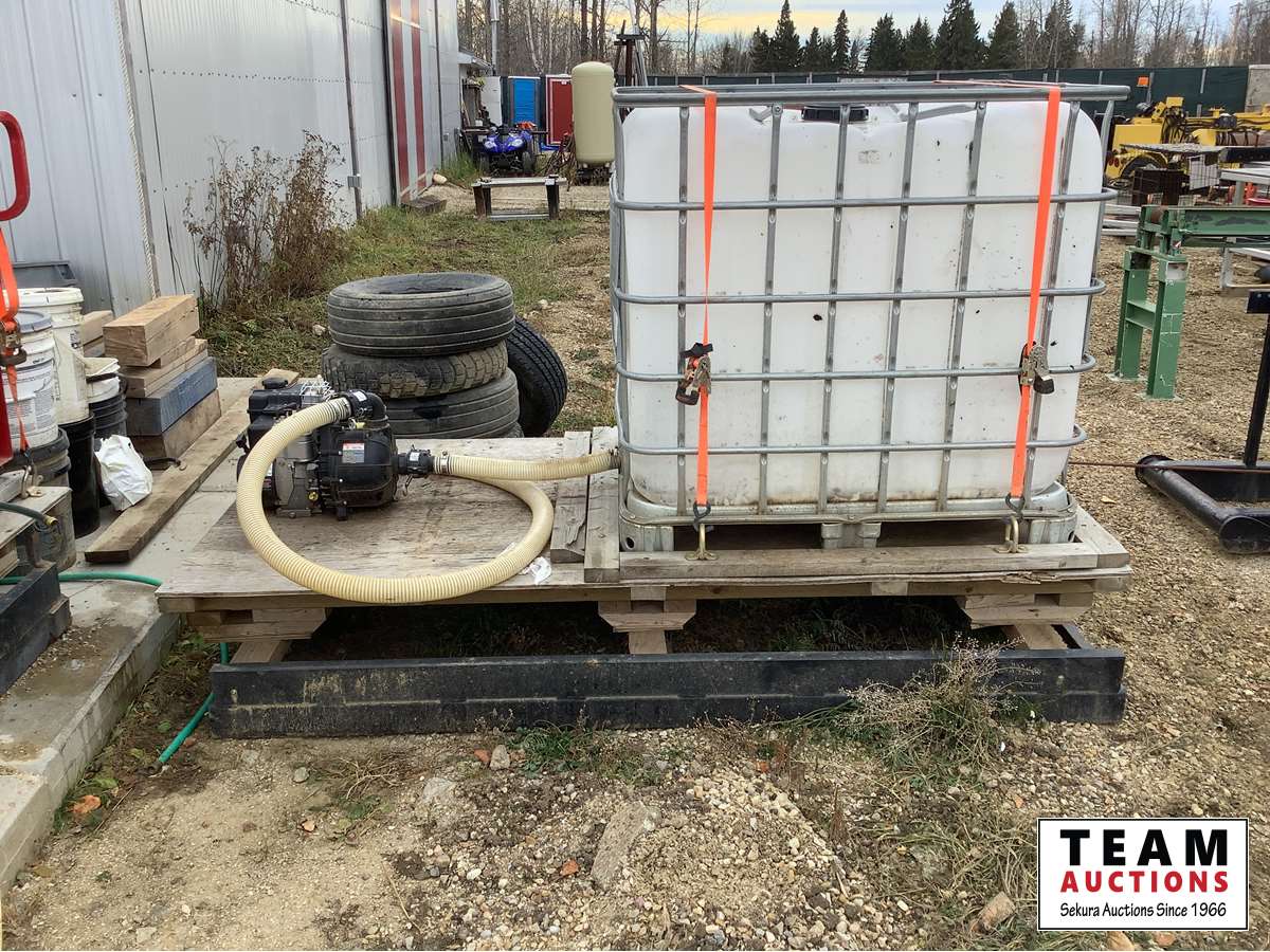 5 hp gas engine, c/w poly water tank mounted on metal lifting frame