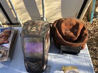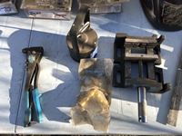 (2) welding helmets, (3) new regulators, drill press vise, magnet, (4) 3/4 inch pipe clamps fixtures, (2) 2.5 inch Deep reach clamps, spreader fixtures, hand rivet gun, box of miscellaneous
