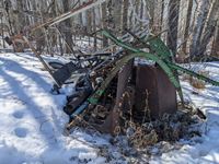 Fuel tank and stand, JD grapple, miscellaneous iron, old truck box trailer