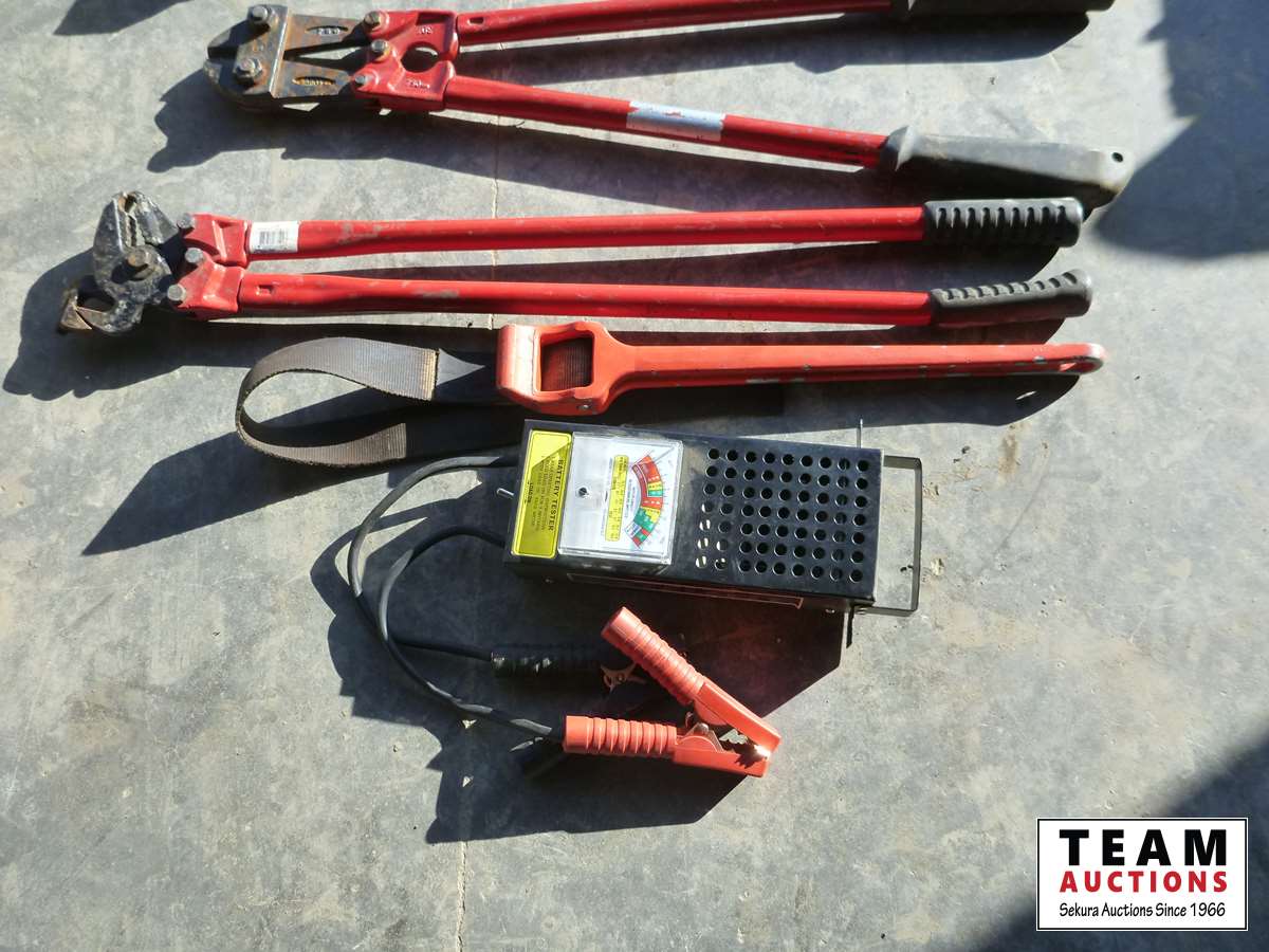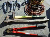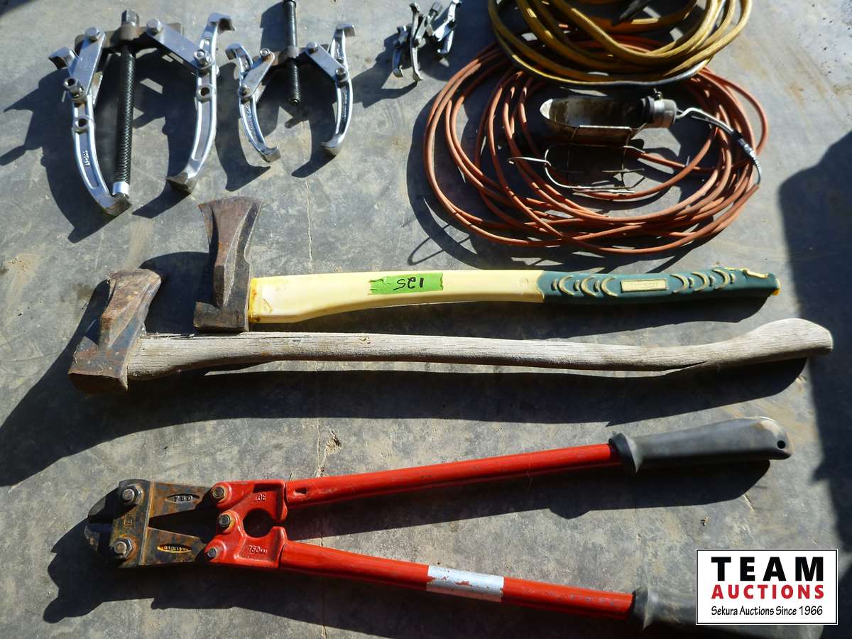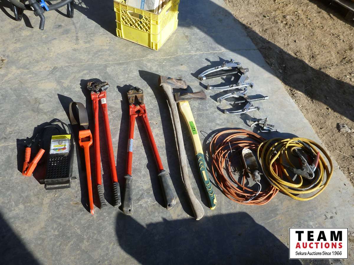 (3) bearing pullers, booster cables, bolt cutter, truck chain Tool, (2) splitting axes, battery tester, trouble light