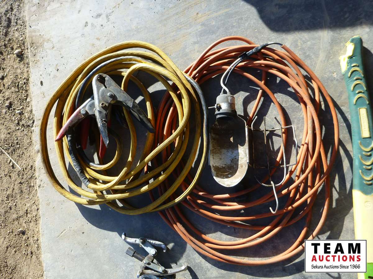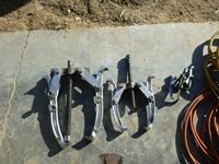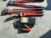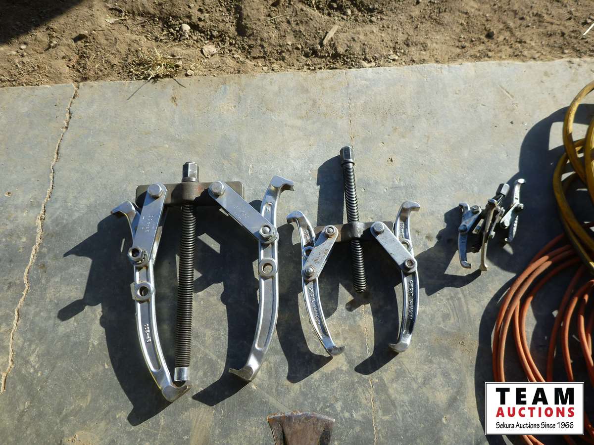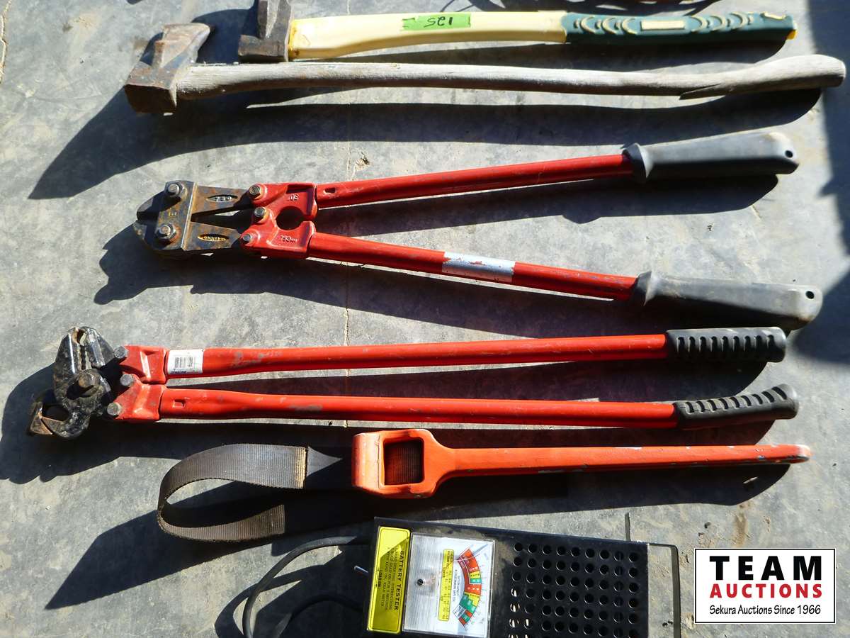 (3) bearing pullers, booster cables, bolt cutter, truck chain Tool, (2) splitting axes, battery tester, trouble light