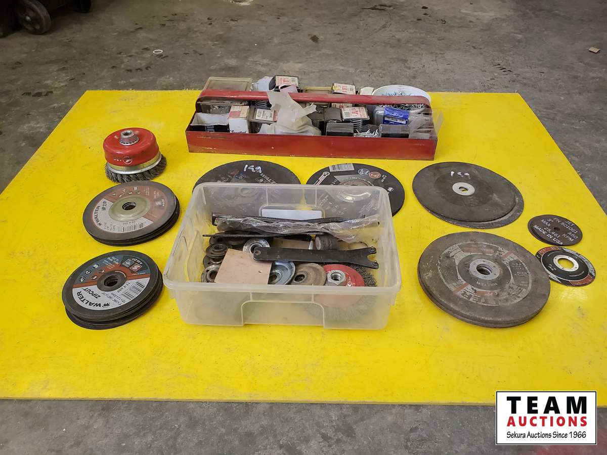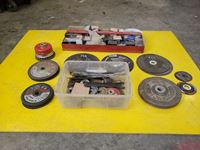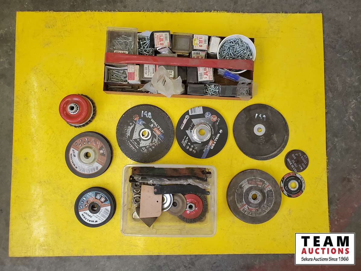 Assortment of cutting discs, screws, grinder parts