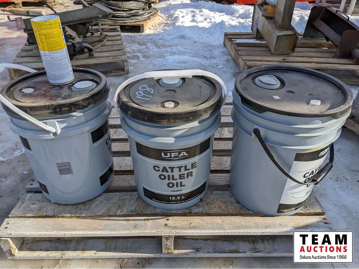 117 (2) Full Pails of Cattle Oiler Oil, Pail with Funnel, (1) Ectiban Fly Killer